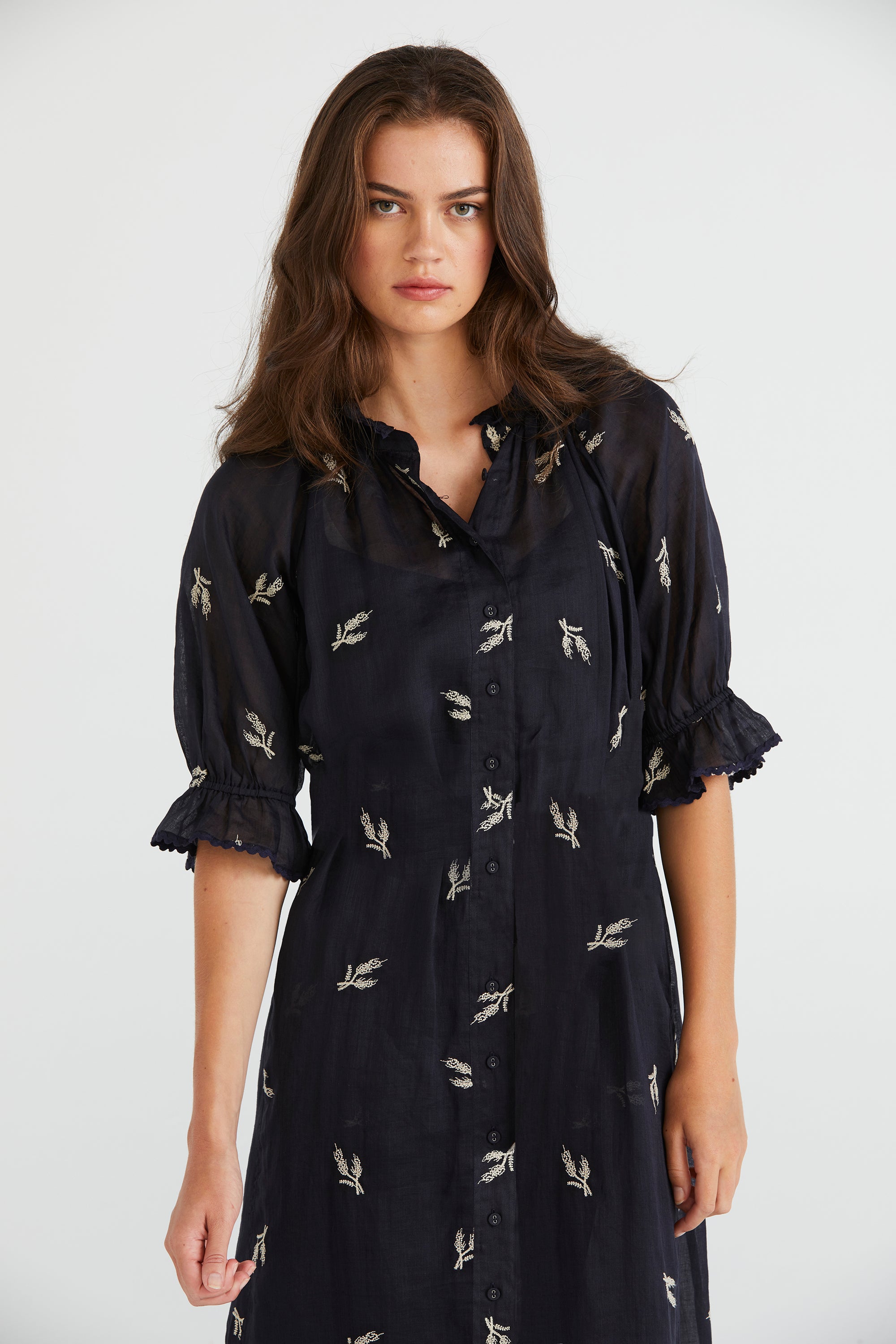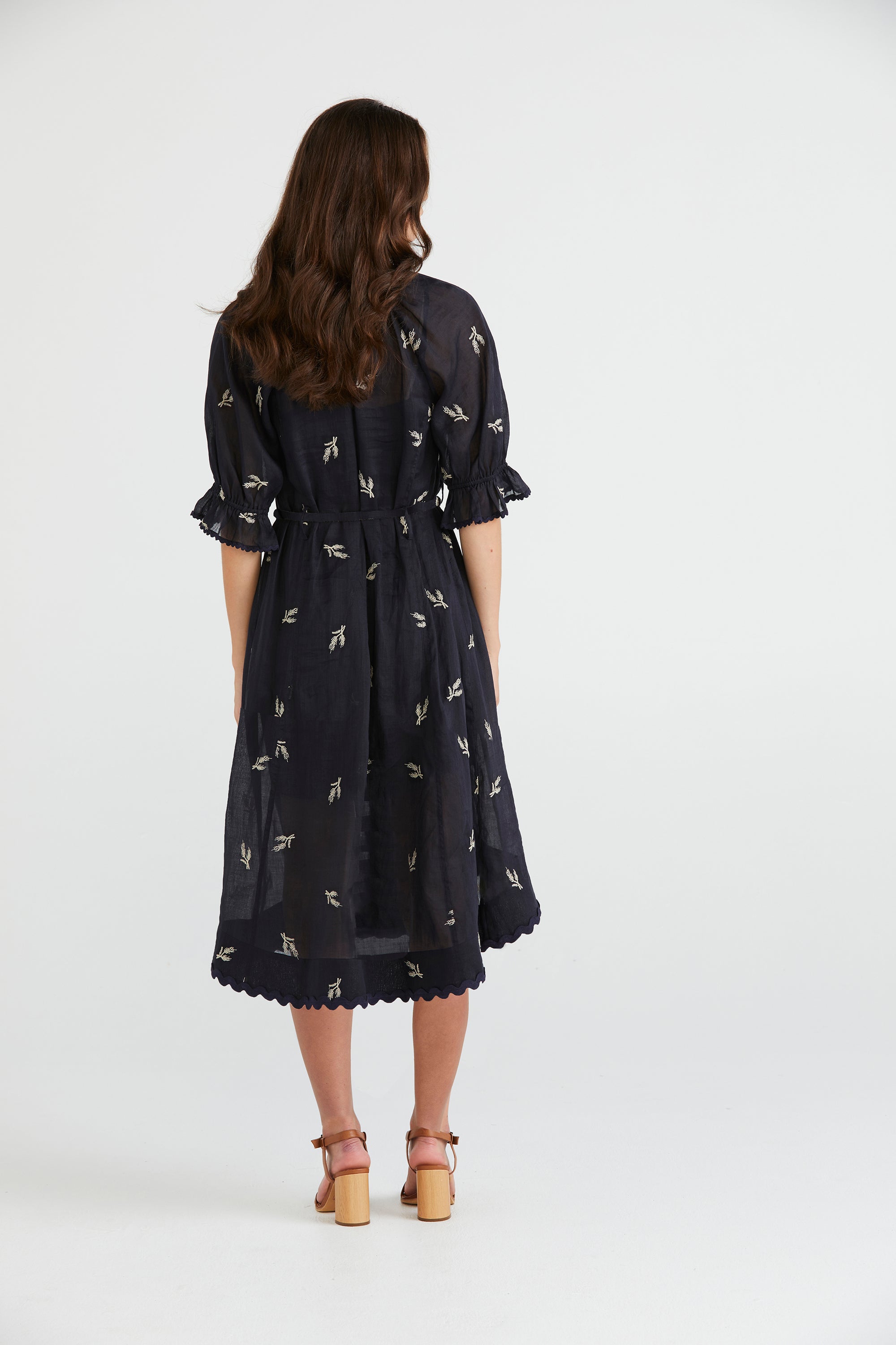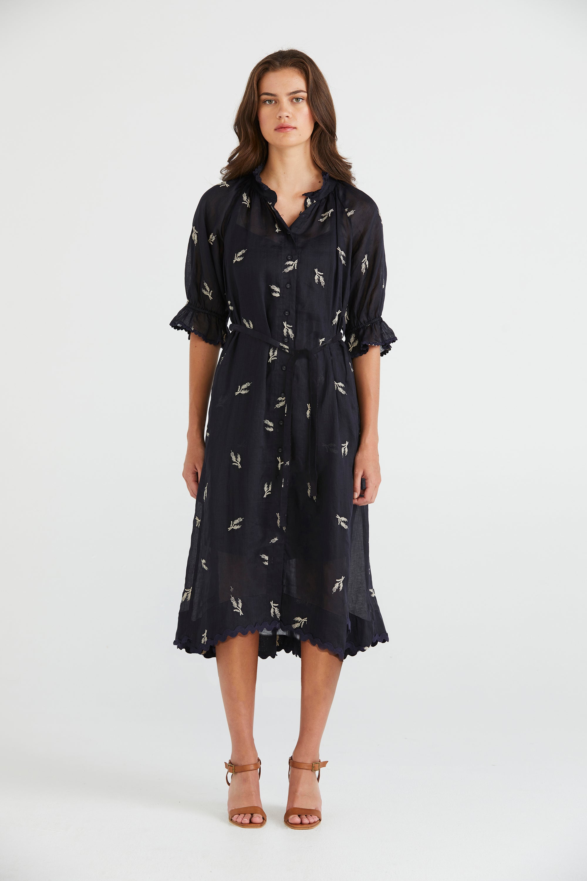 Elevate your summer wardrobe with the Catalina Dress, featuring delicate wheat design embroidery on lightweight linen fabric. The ruffle neckline and elasticated sleeve cuffs, adorned with dyed-to-match ric rac, add a playful flair. Finished with self-covered buttons accented by metal eyelets and a removable self-fabric belt, this dress is perfect for breezy days and sunny adventures.