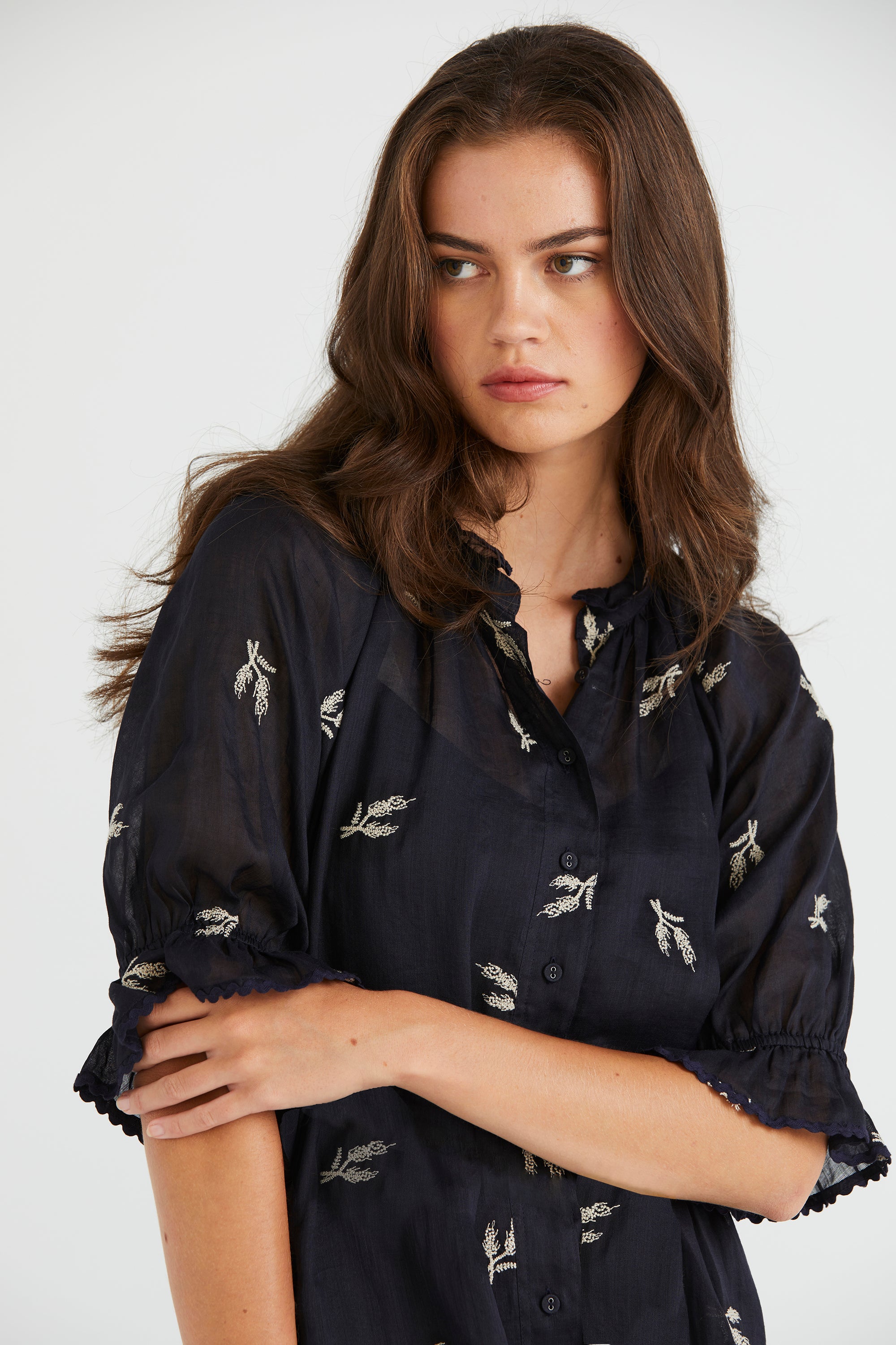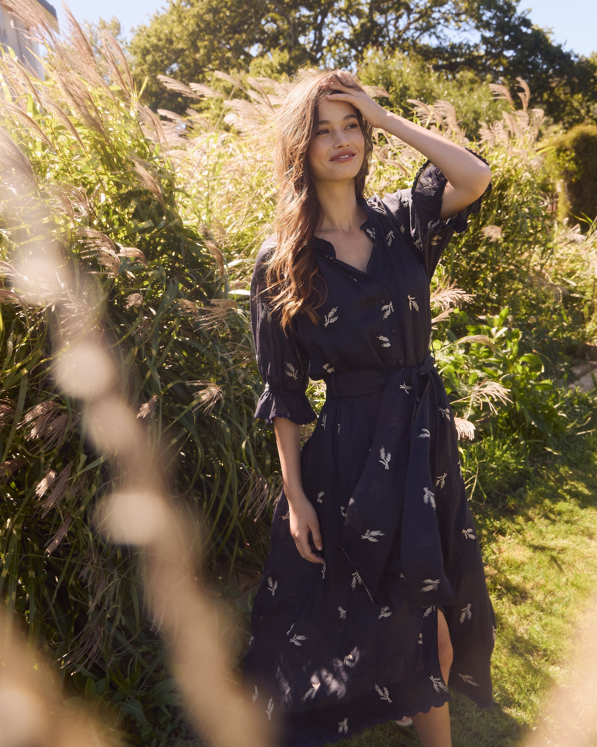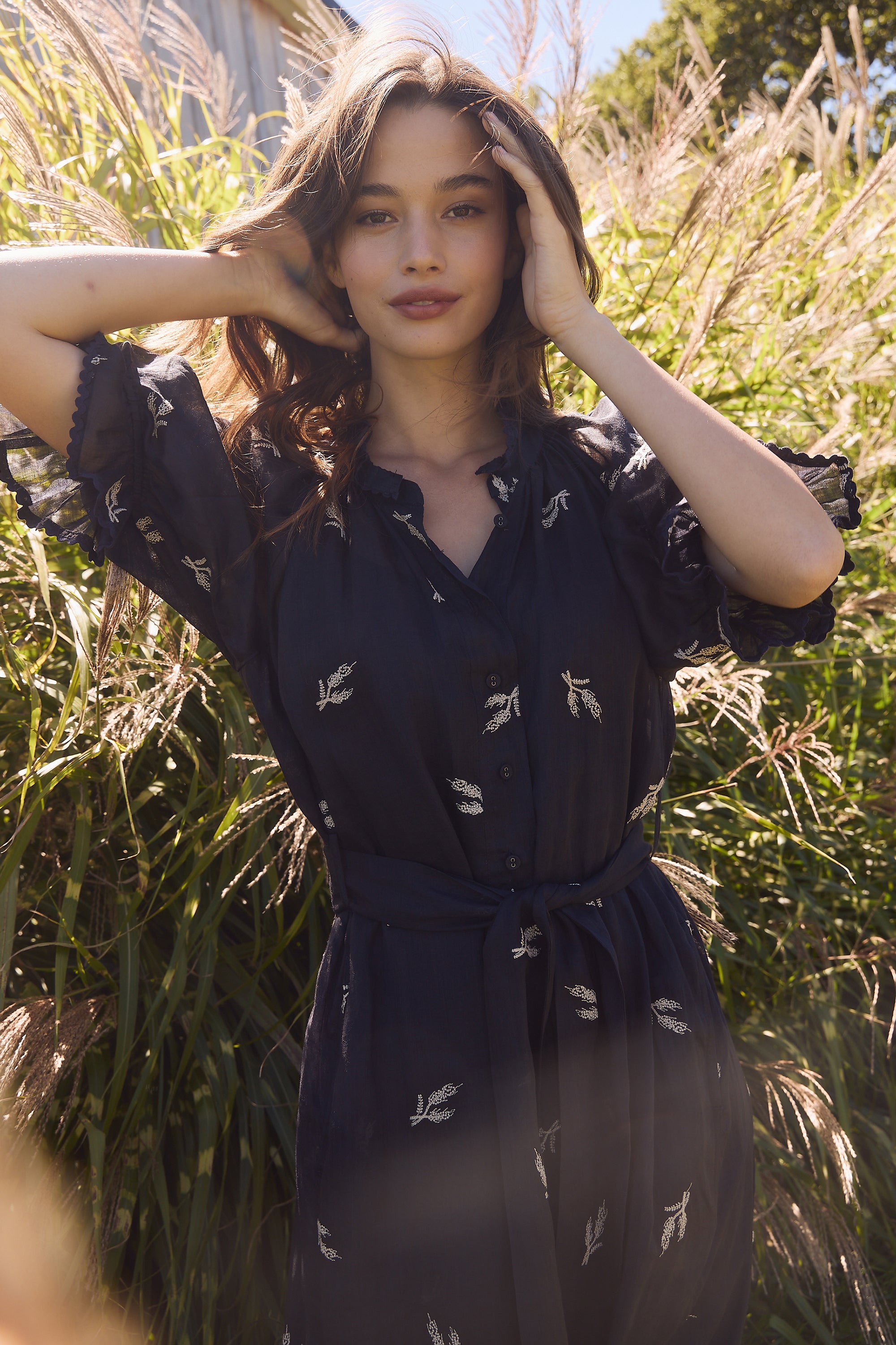 Elevate your summer wardrobe with the Catalina Dress, featuring delicate wheat design embroidery on lightweight linen fabric. The ruffle neckline and elasticated sleeve cuffs, adorned with dyed-to-match ric rac, add a playful flair. Finished with self-covered buttons accented by metal eyelets and a removable self-fabric belt, this dress is perfect for breezy days and sunny adventures.