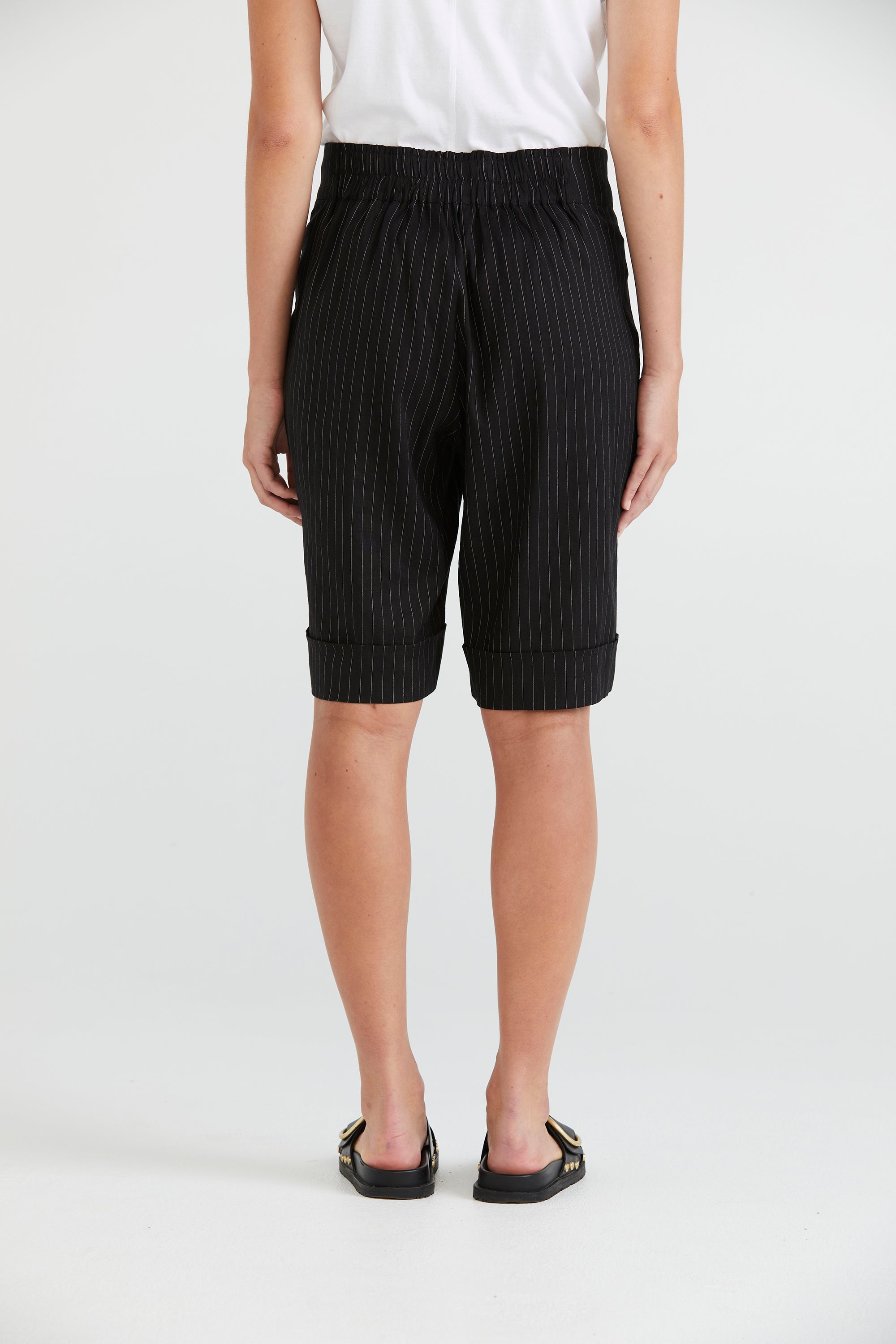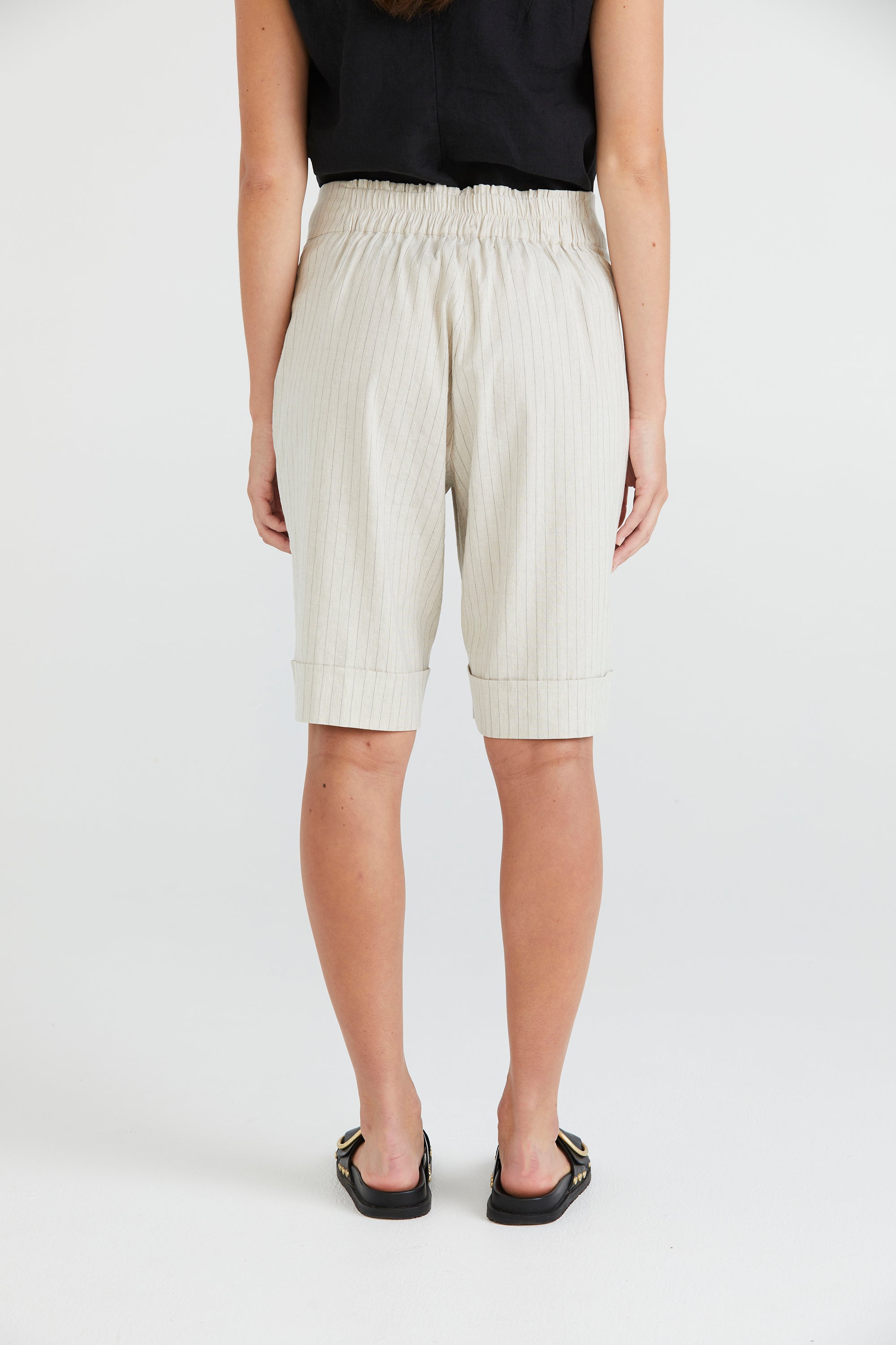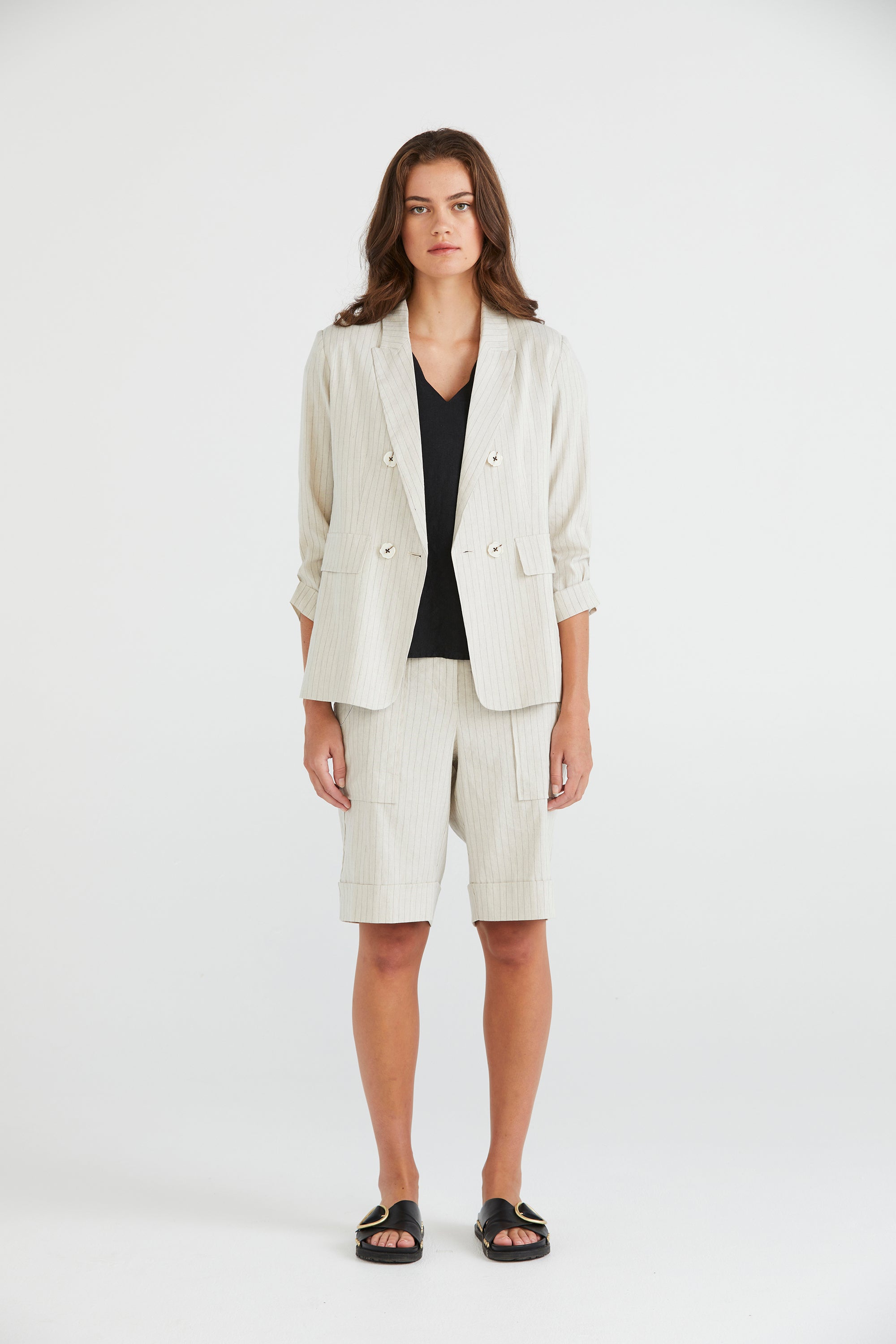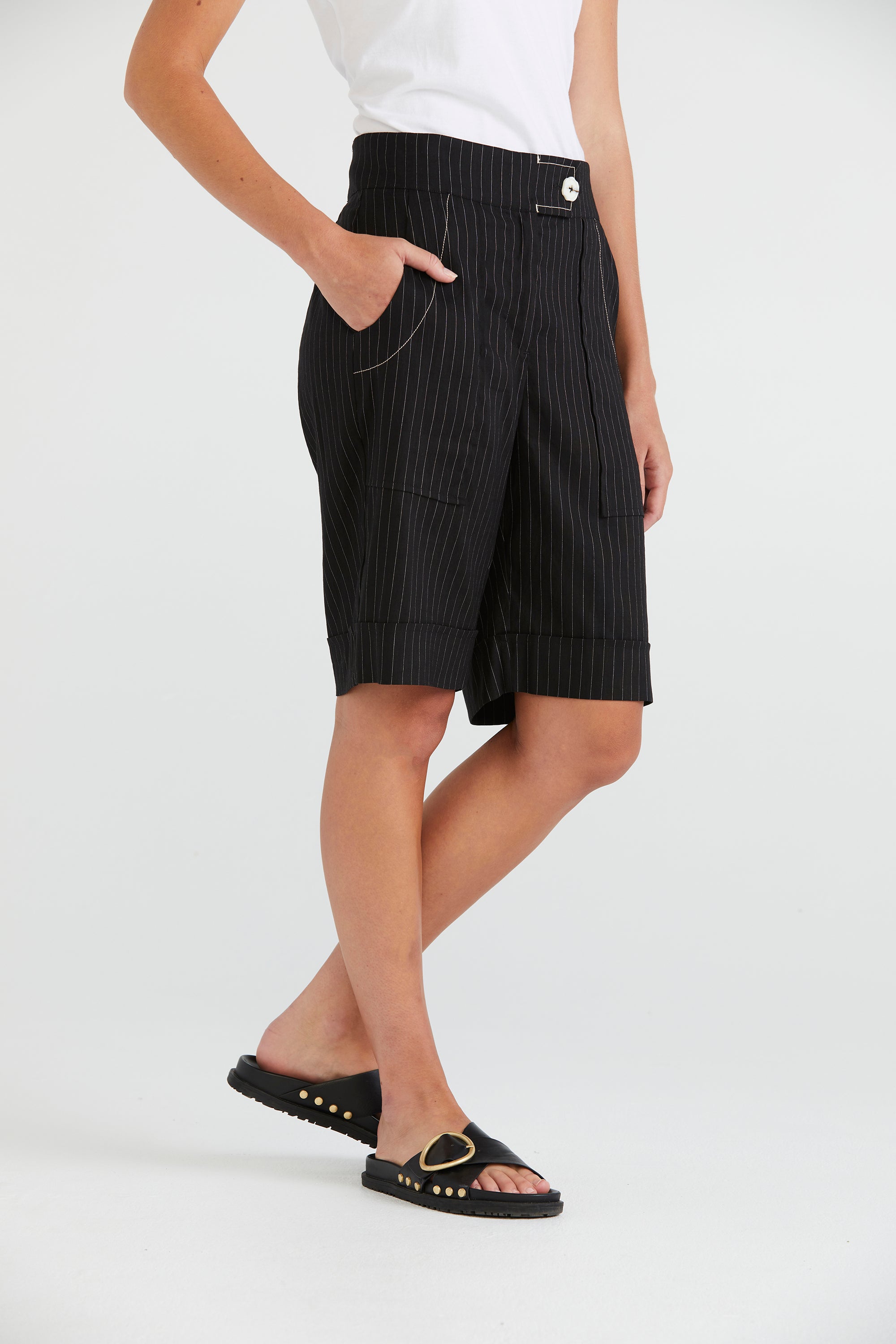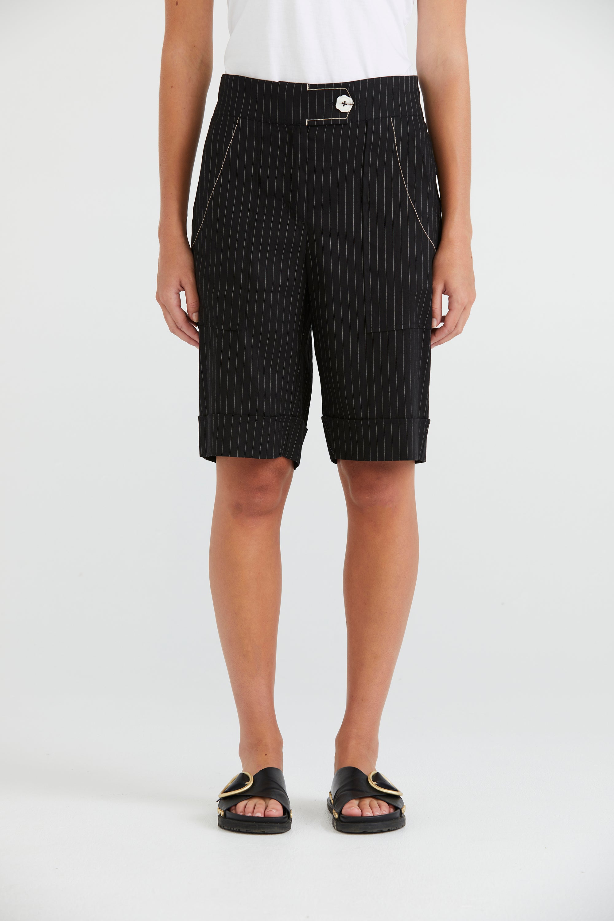 Embrace laid-back sophistication with the Chelsea Short, a knee-length linen blend pinstripe short. Its deep front patch pockets with contrast stitching detail at the pocket openings and waist tab add a touch of modern flair. Complete the look by pairing these shorts with our Chelsea Jacket and Vest, the perfect summer suit.