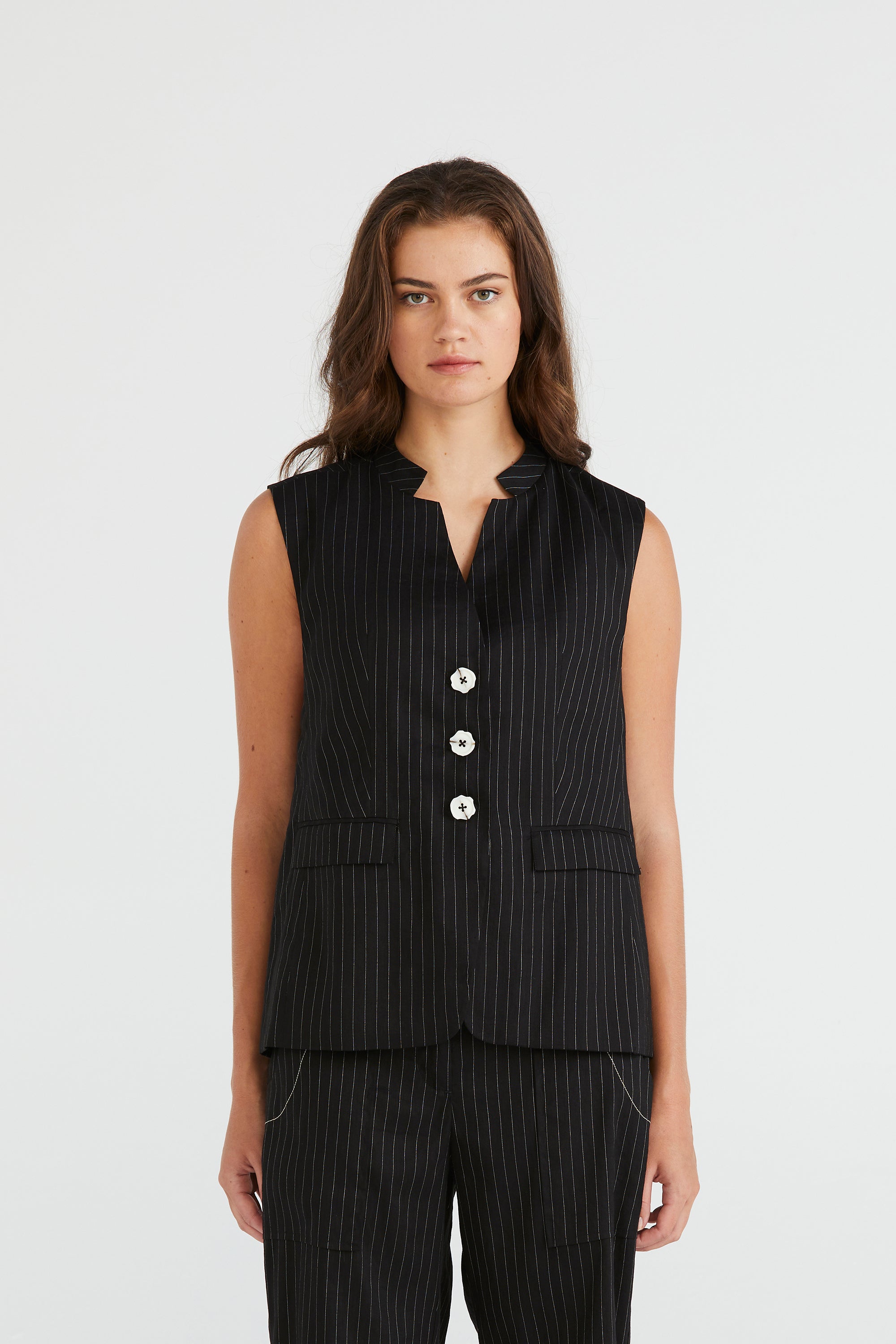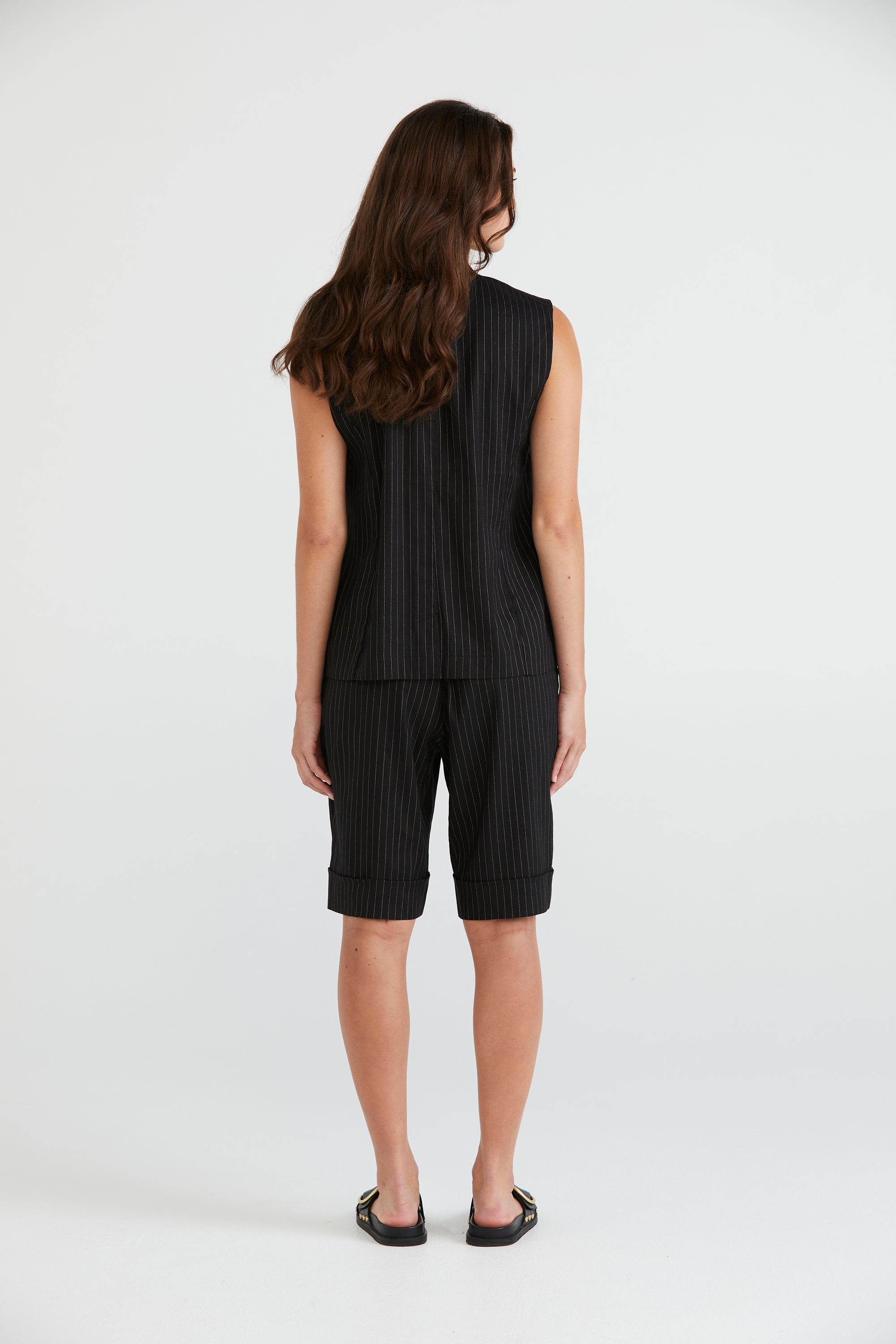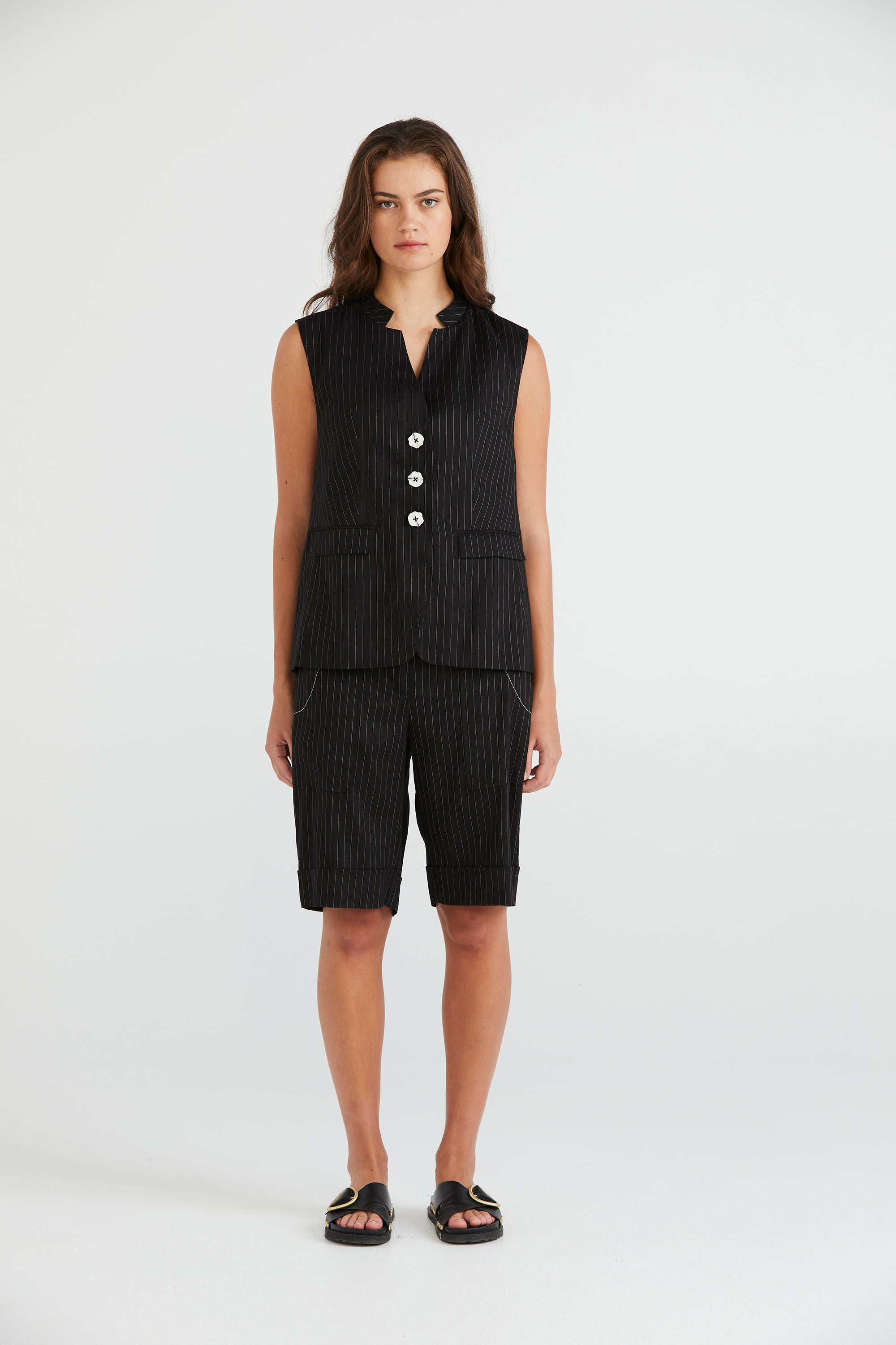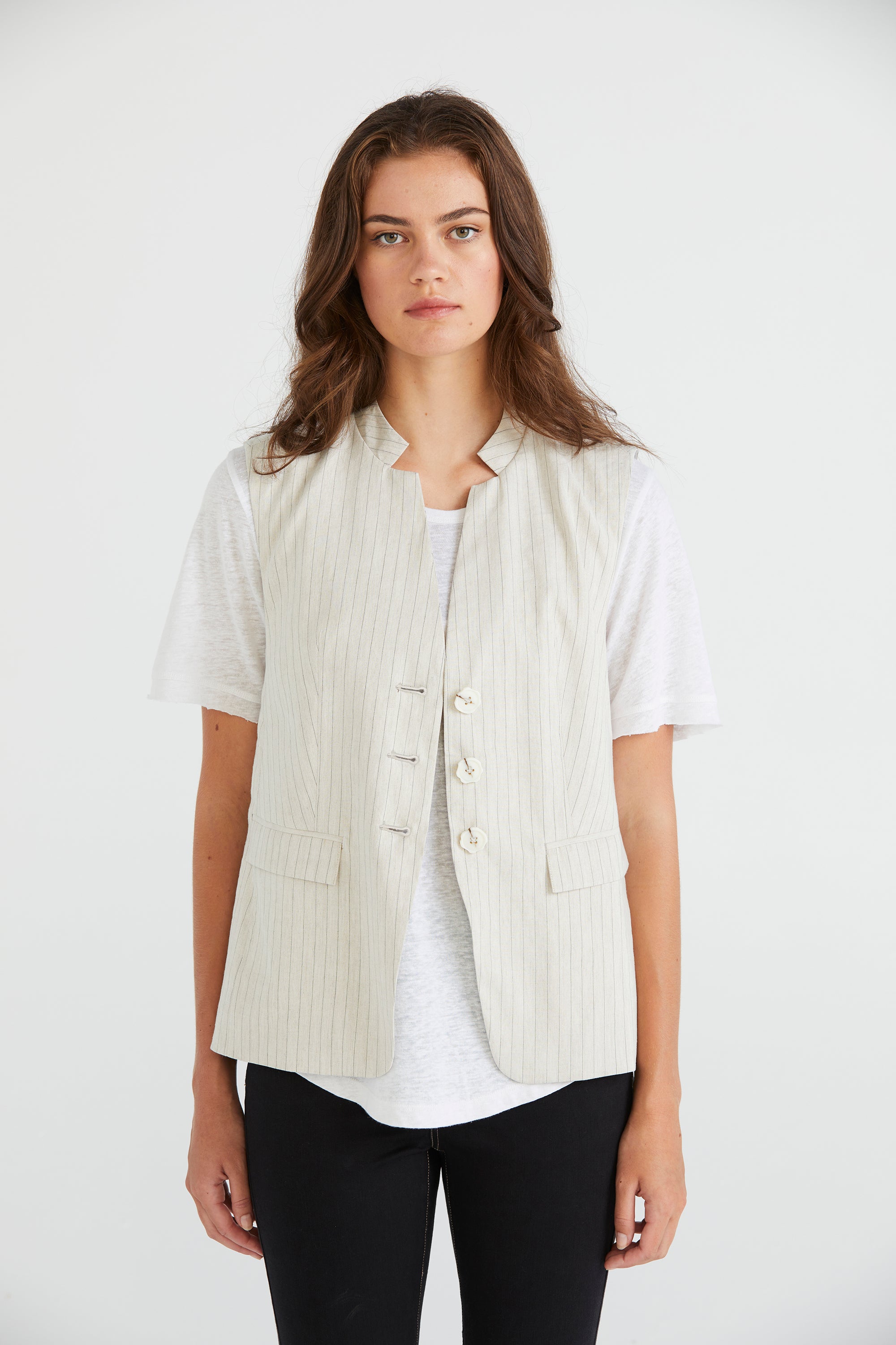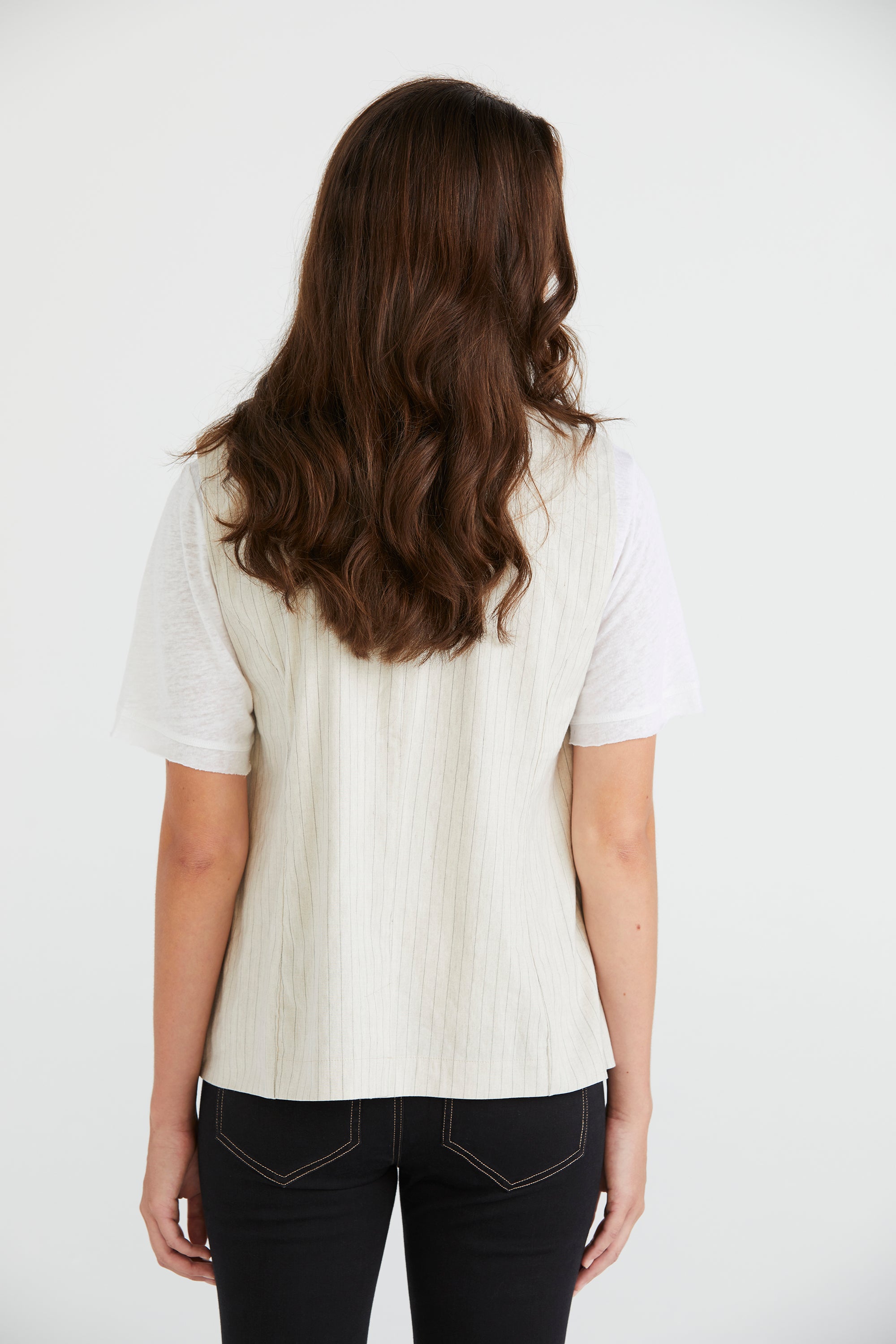 Elevate your look with the Chelsea Vest, a sleeveless linen blend piece in a sophisticated pinstripe. Its notched cutaway neckline adds a modern touch, while asymmetrical buttons provide subtle detailing. Pair it with the Chelsea Pant or Short for a polished and on-trend look that transitions seamlessly from day to night.