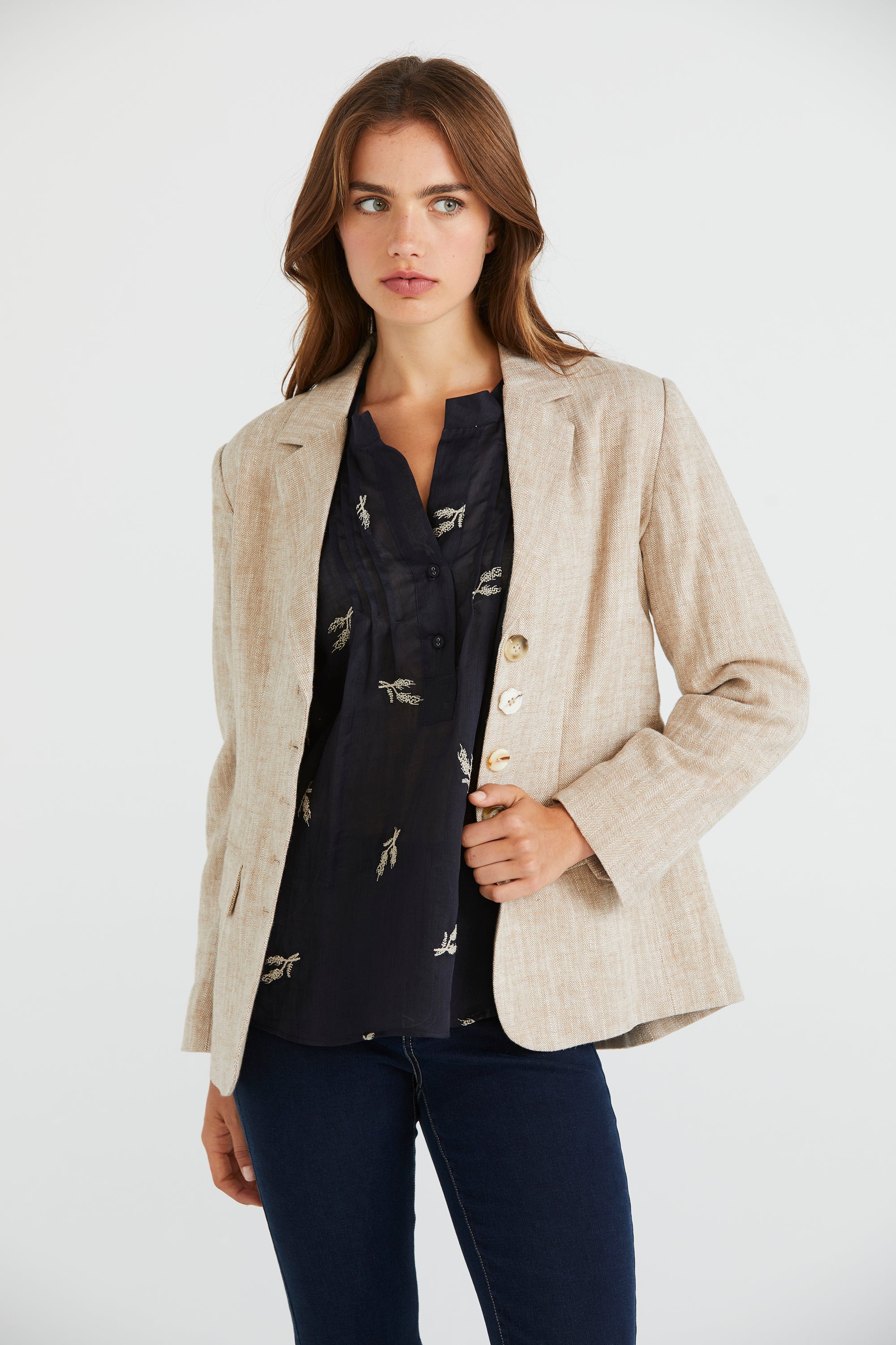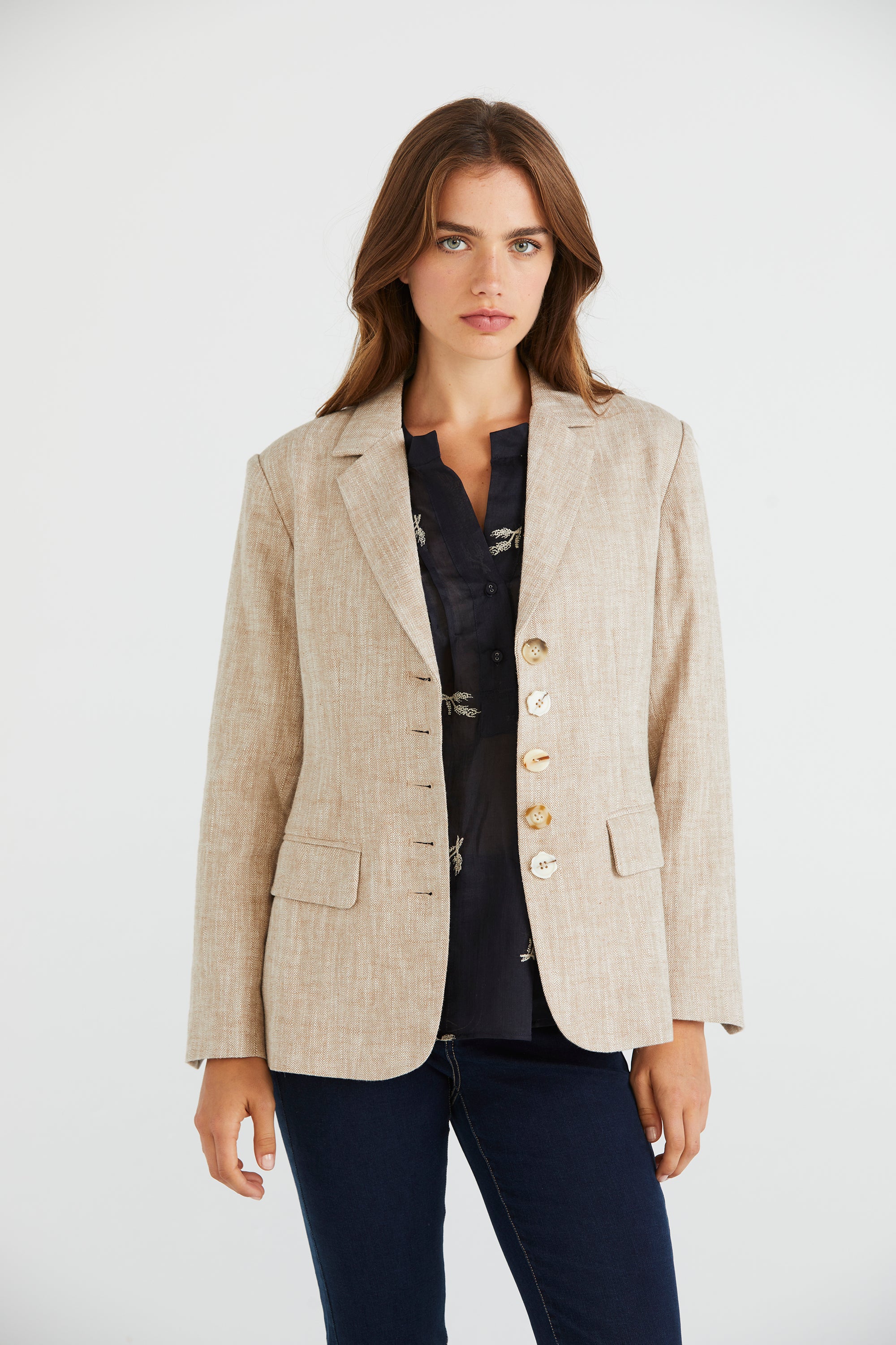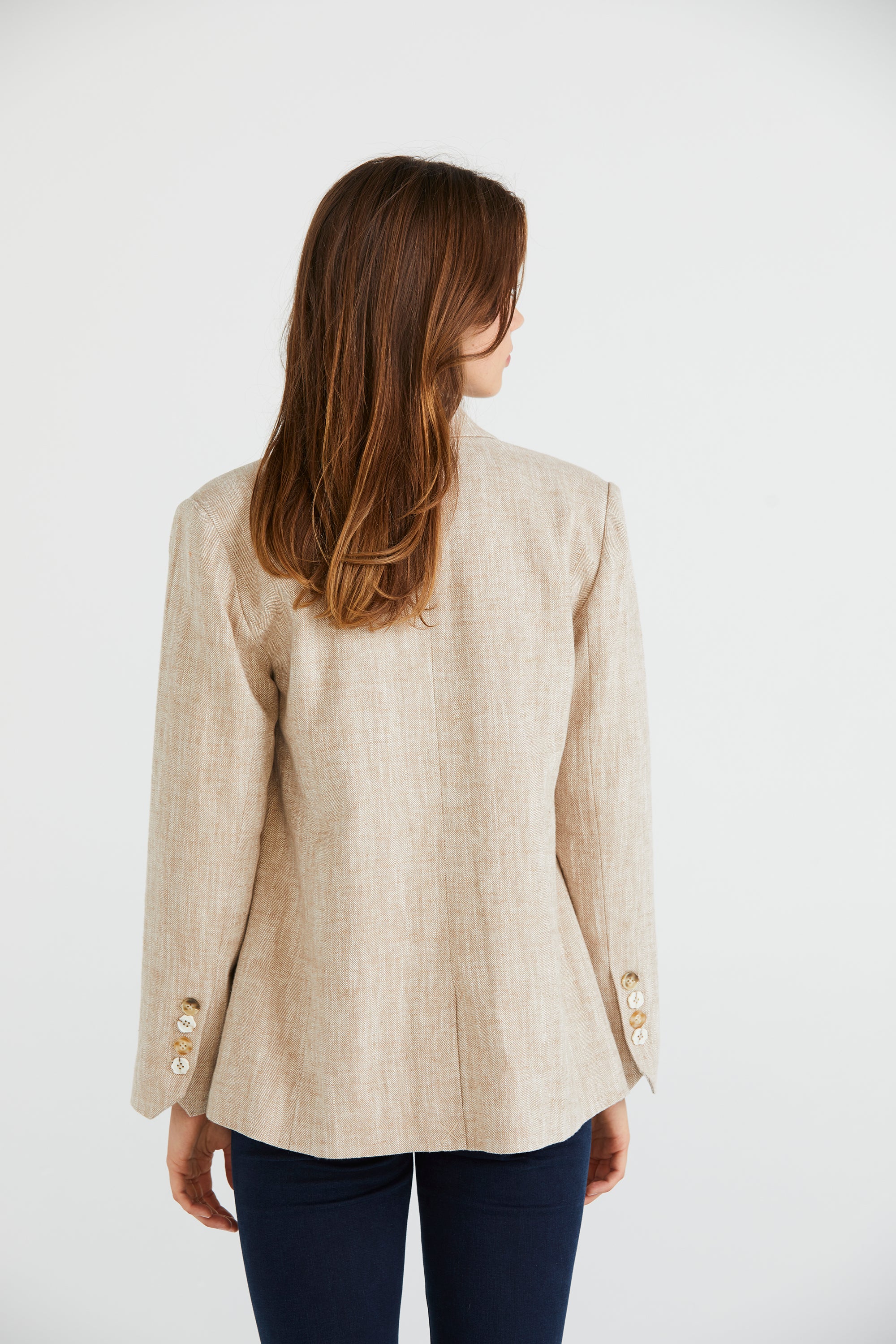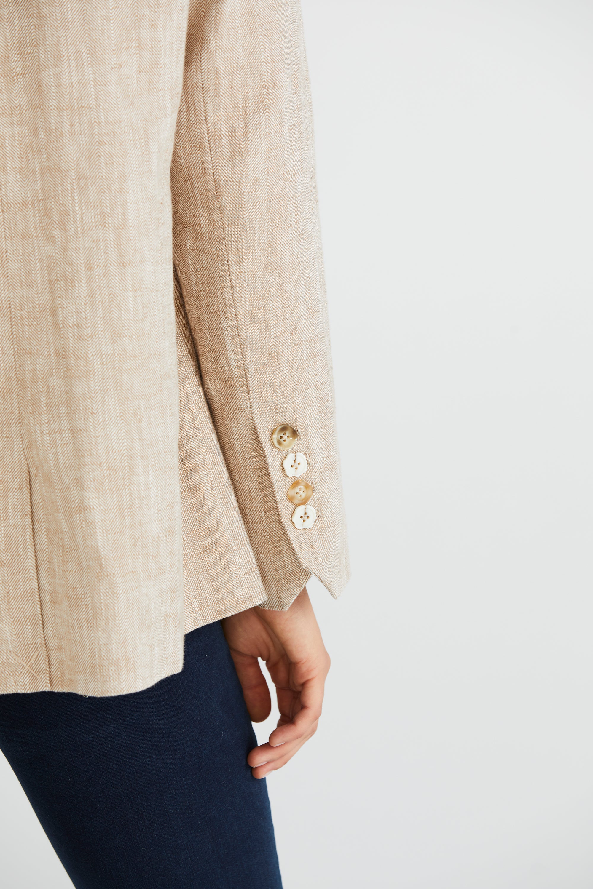 Introducing the Chevron Jacket, a sophisticated longline blazer crafted from a camel-coloured linen blend herringbone fabric. Its relaxed fit exudes effortless elegance, while the mismatched buttons at the front closure and sleeve cuffs add a touch of modern flair. Fully lined for comfort and durability, this jacket is perfect for adding a polished finish to any look.