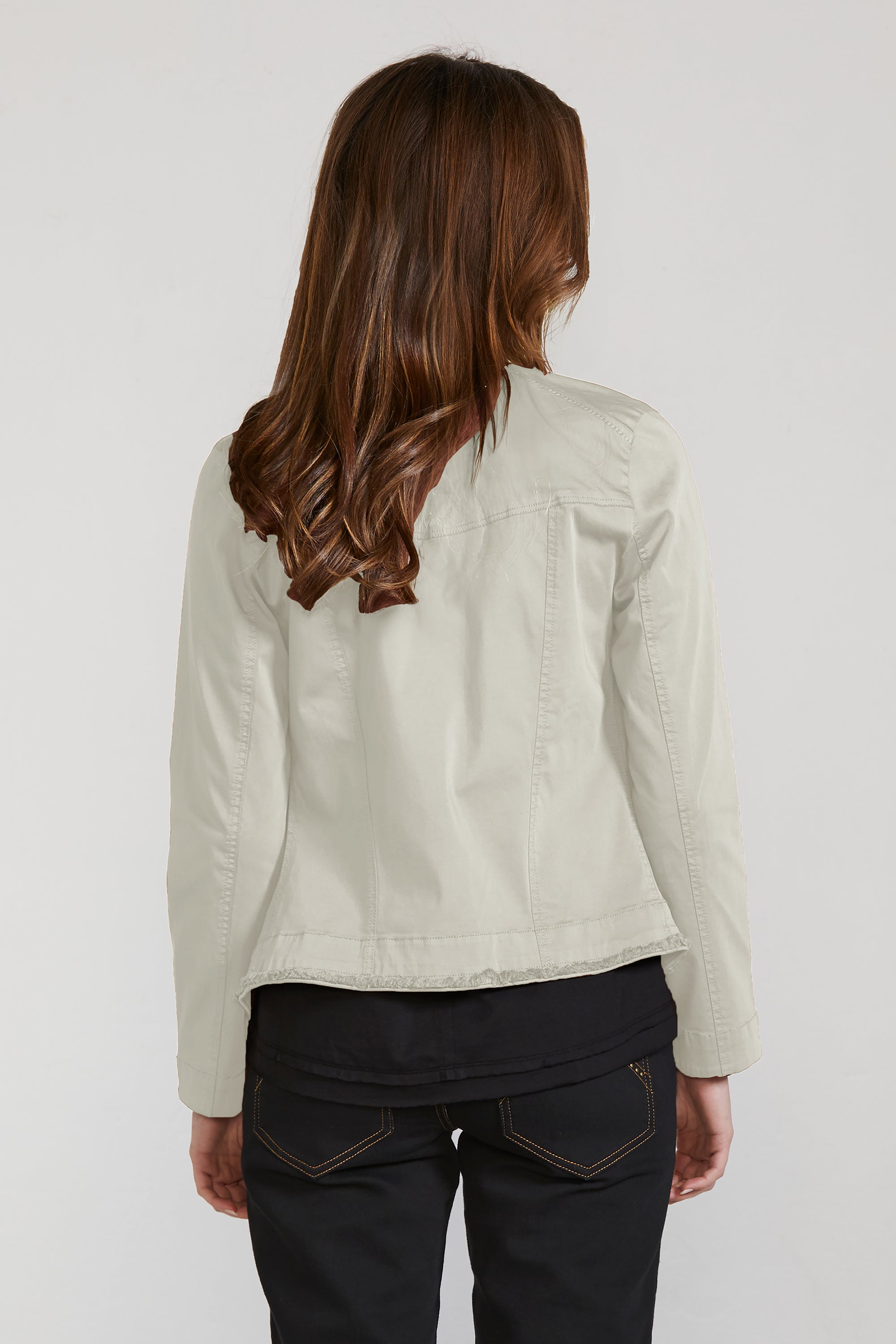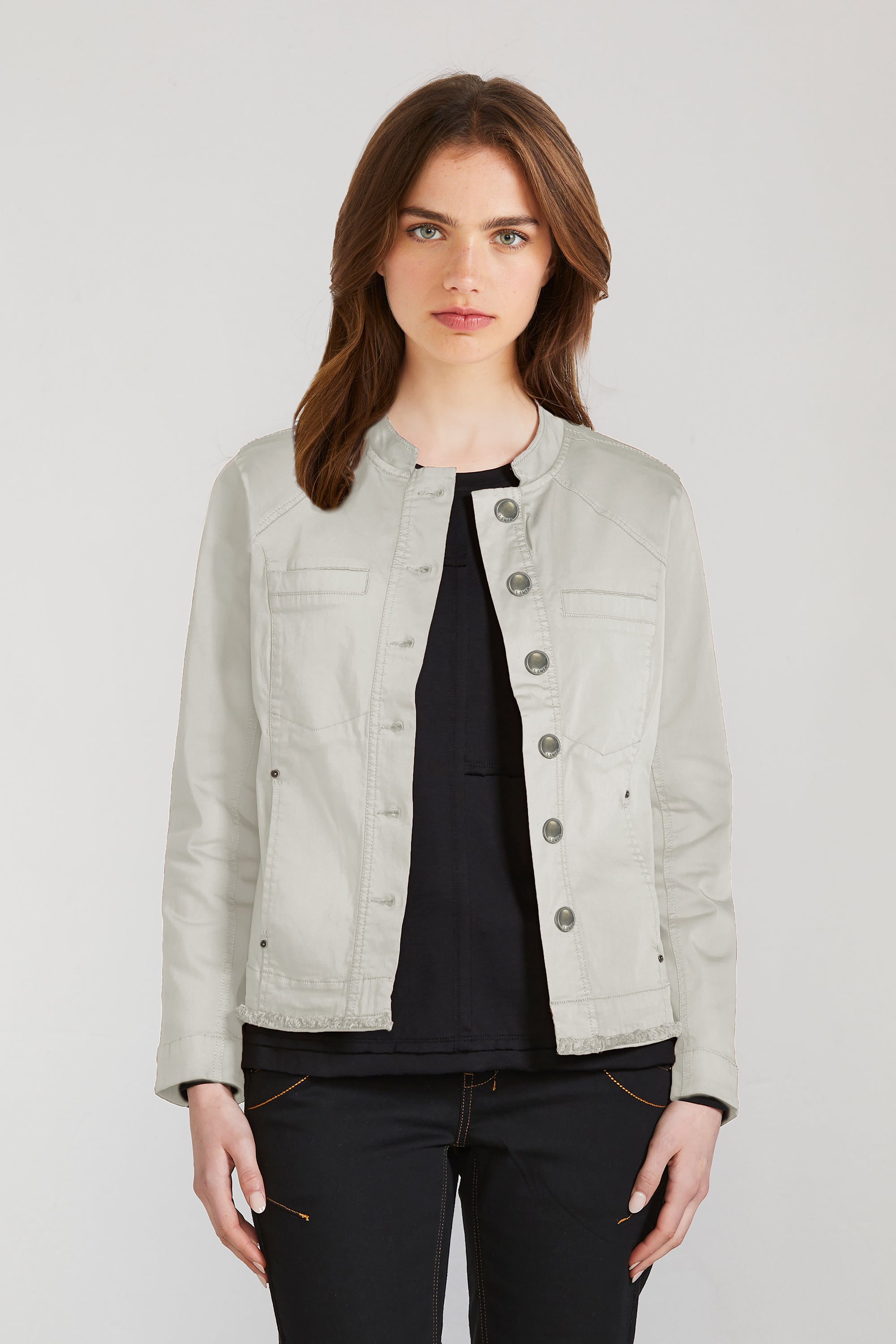 The Flint Jacket in a soft stretch cotton modal is perfect for cooler days or evenings. Designed with a frayed hem finish and heavy topstitch at yoke seams to enhance this classic wardrobe staple. This style is garment dyed to achieve a distressed look and soft hand feel.