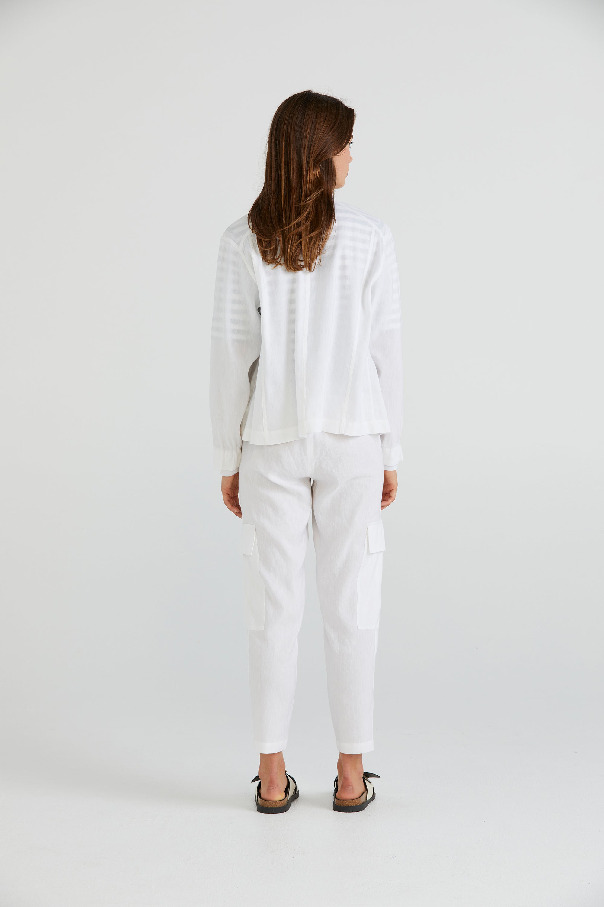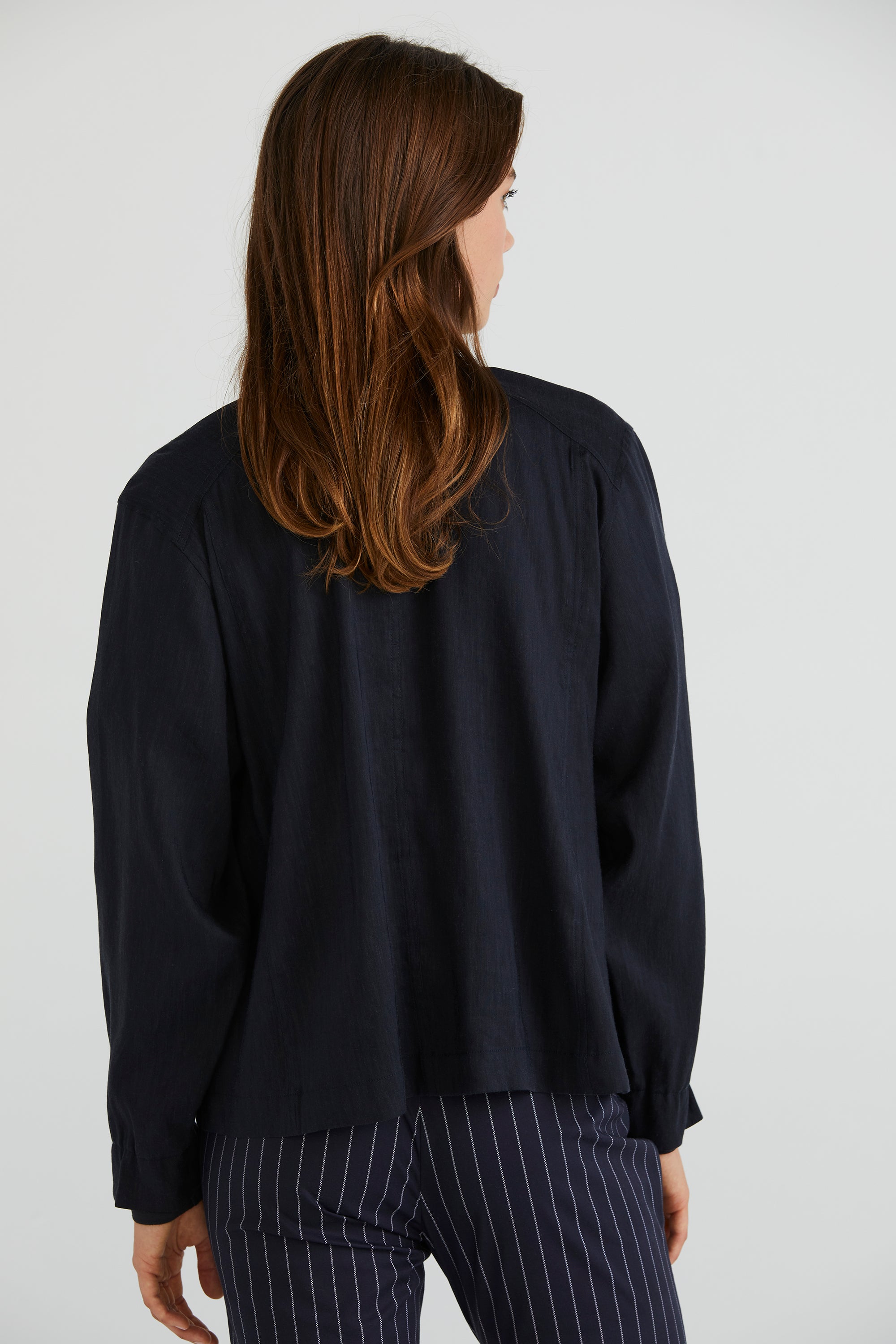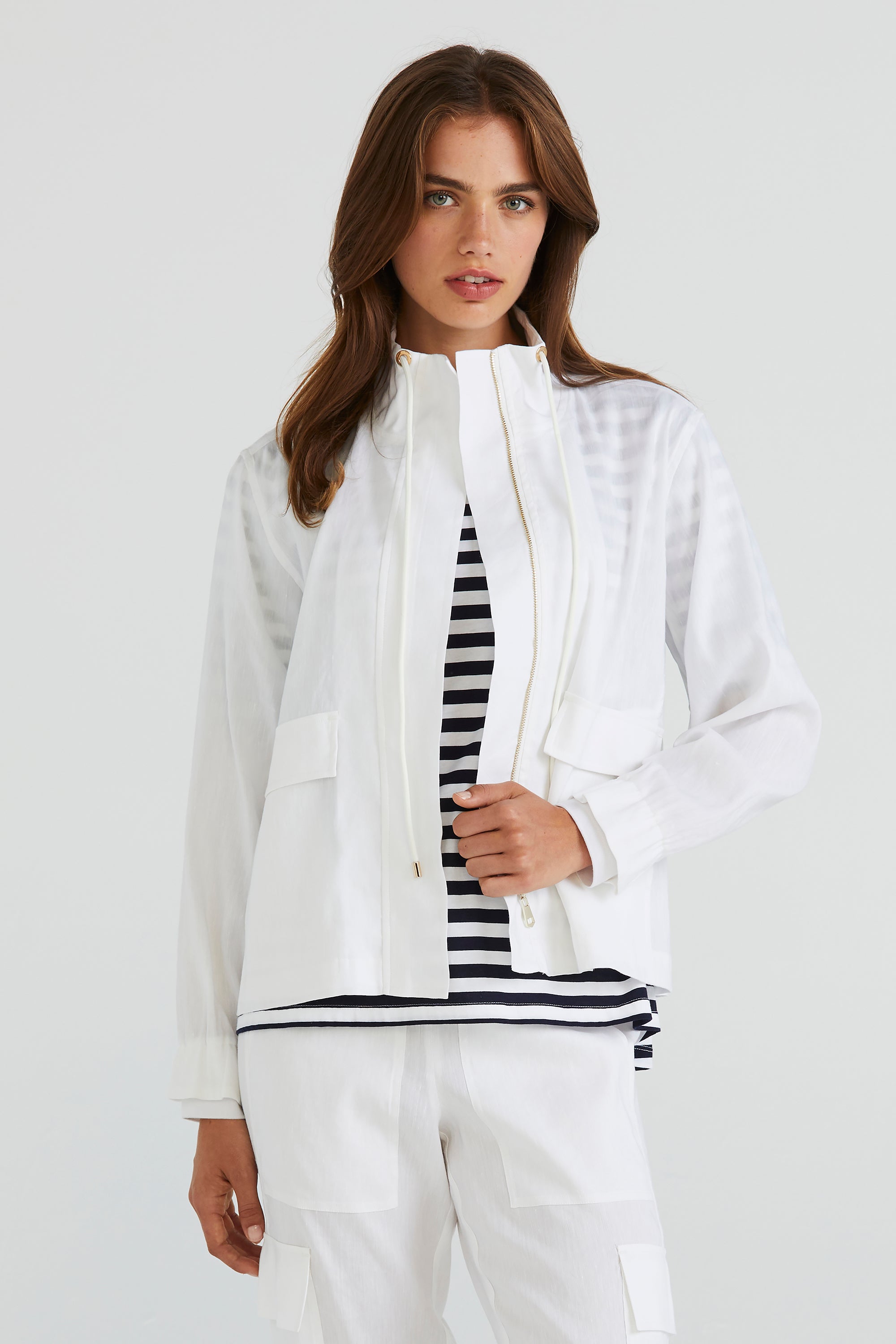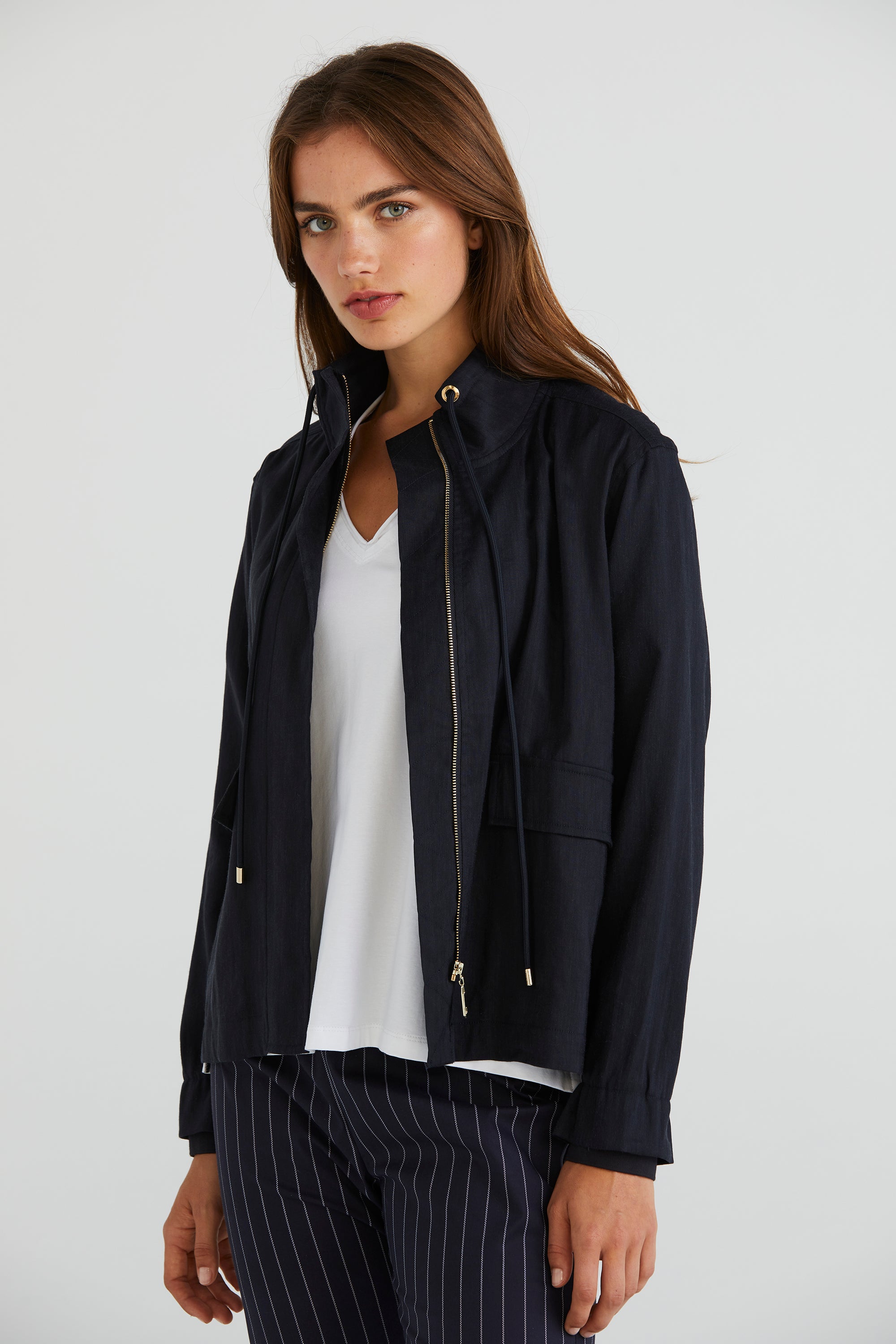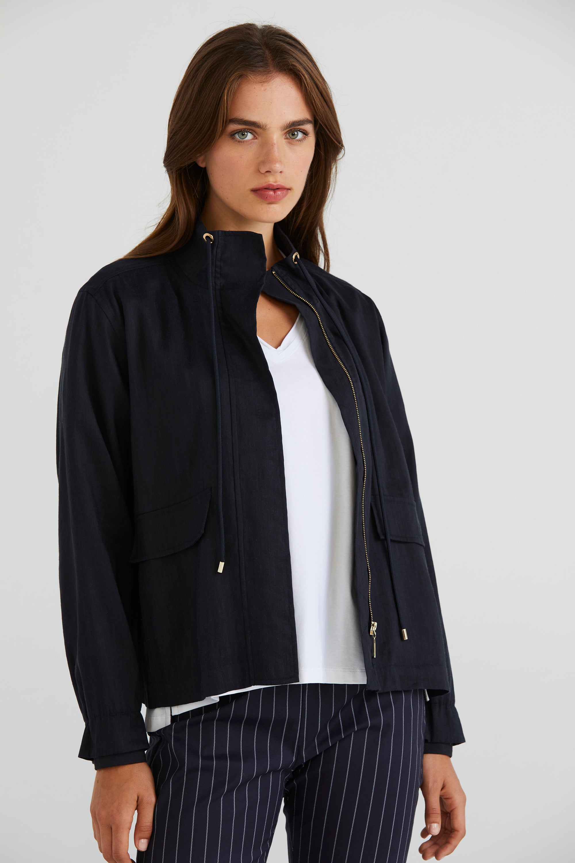 Discover timeless style with the Harrington Jacket, a relaxed linen blend design. It features faux pocket flaps at the front with functional side pockets and soft gold metal hardware. The rib cuff design adds a subtle touch of sophistication, making it a versatile addition to your wardrobe.