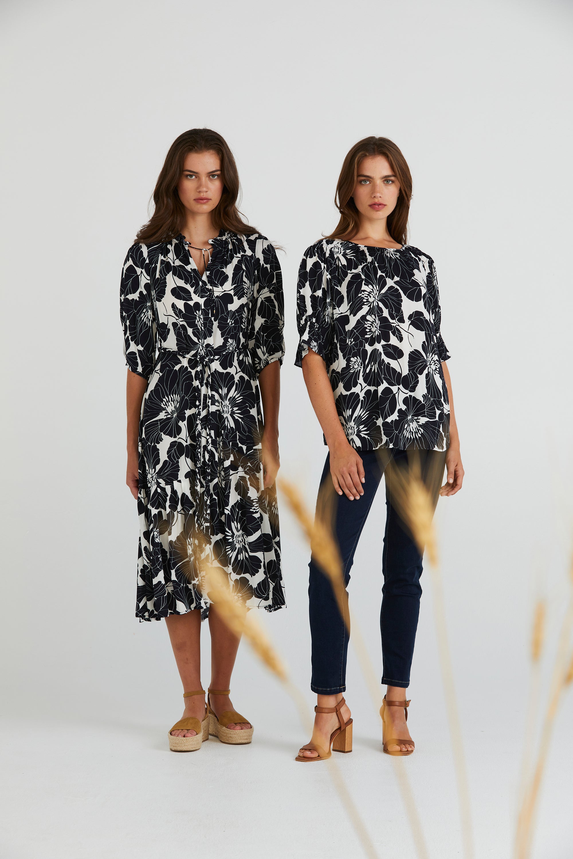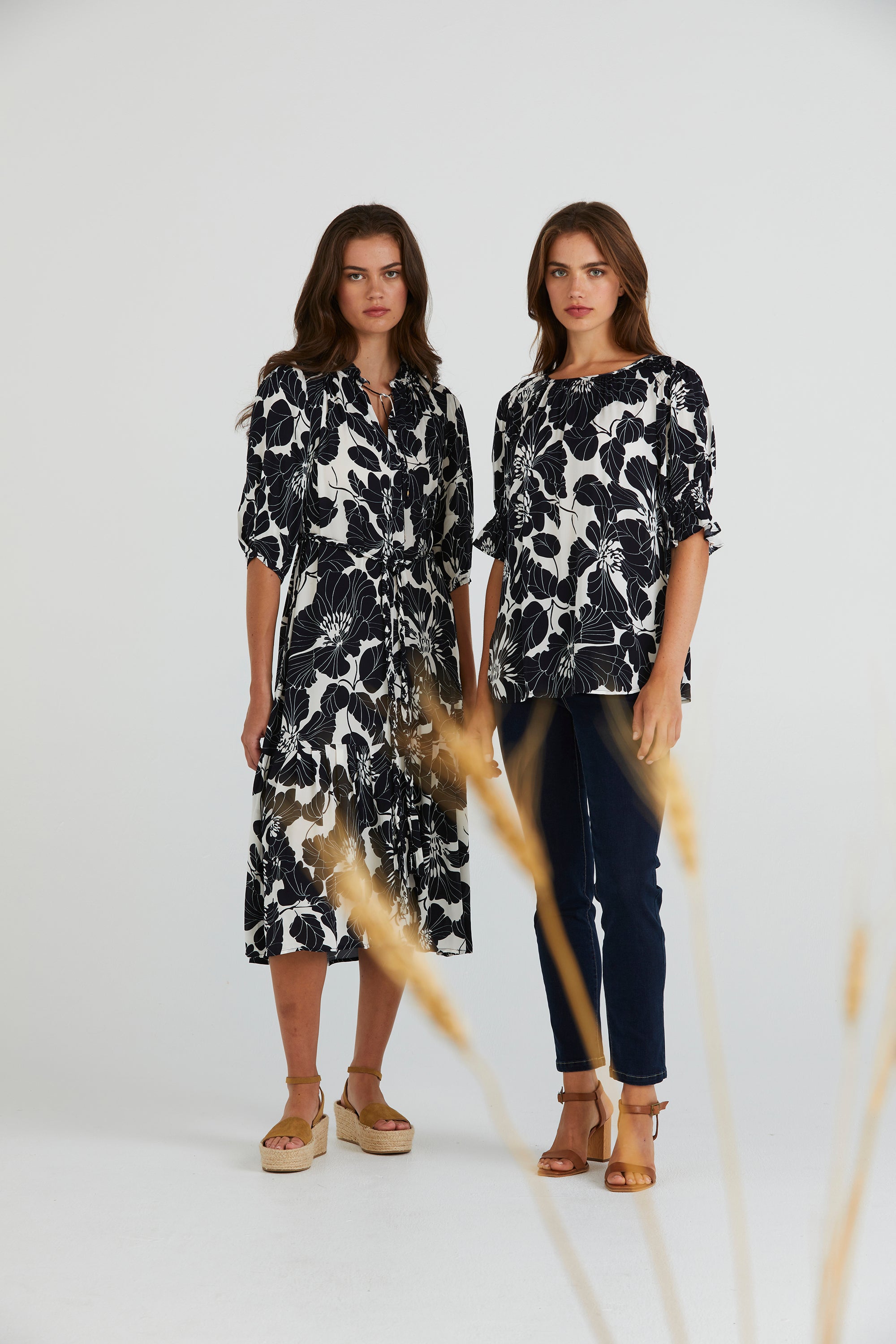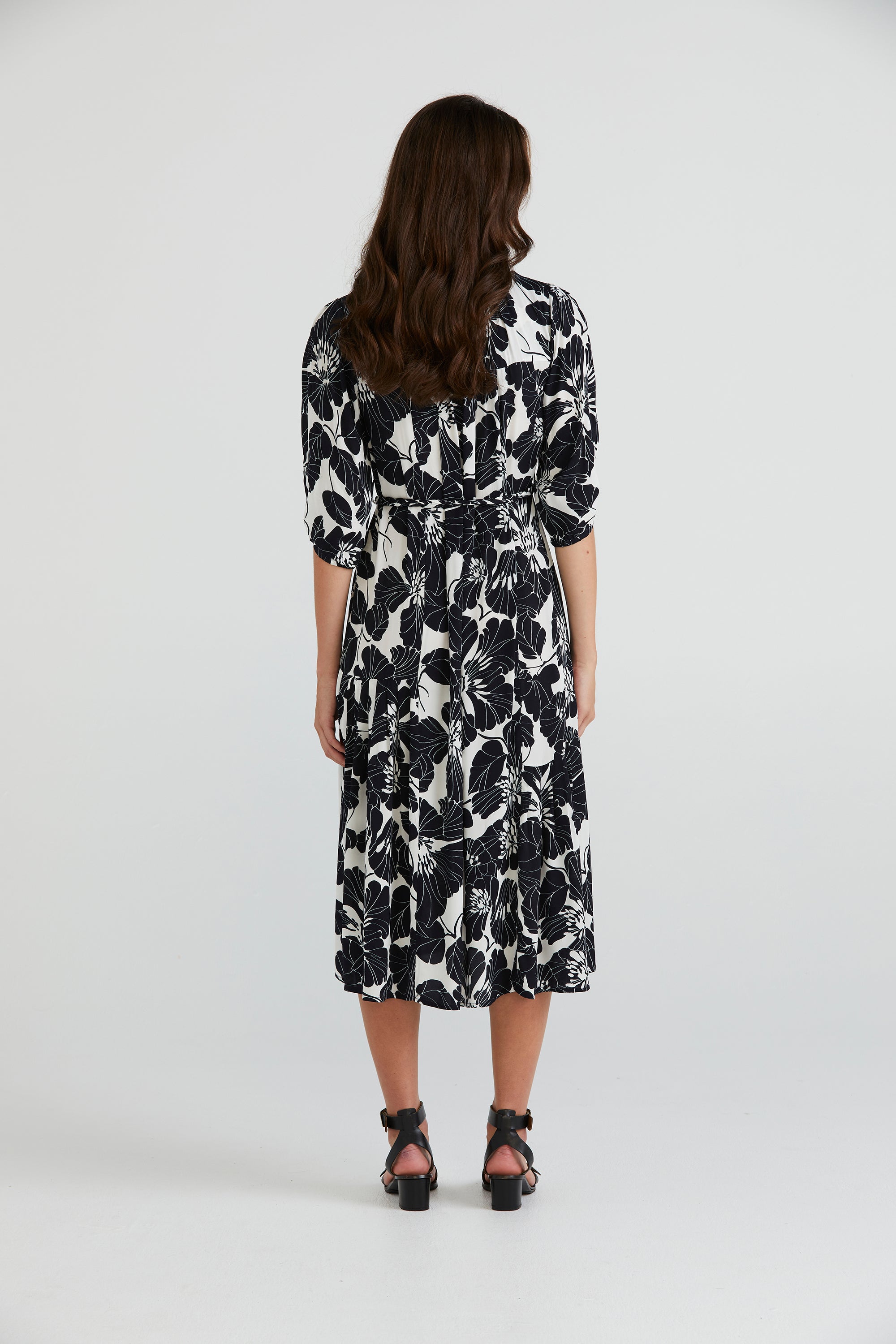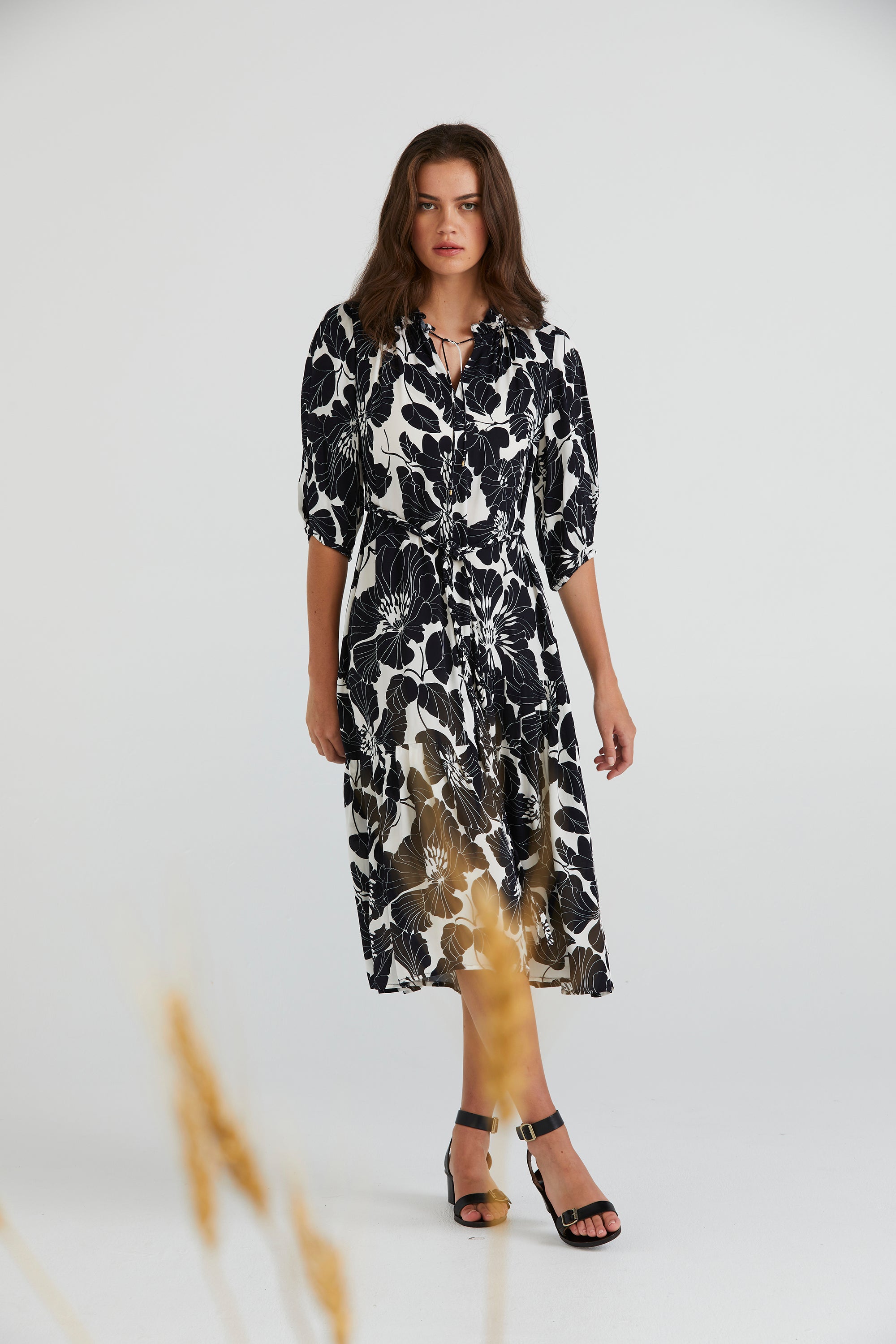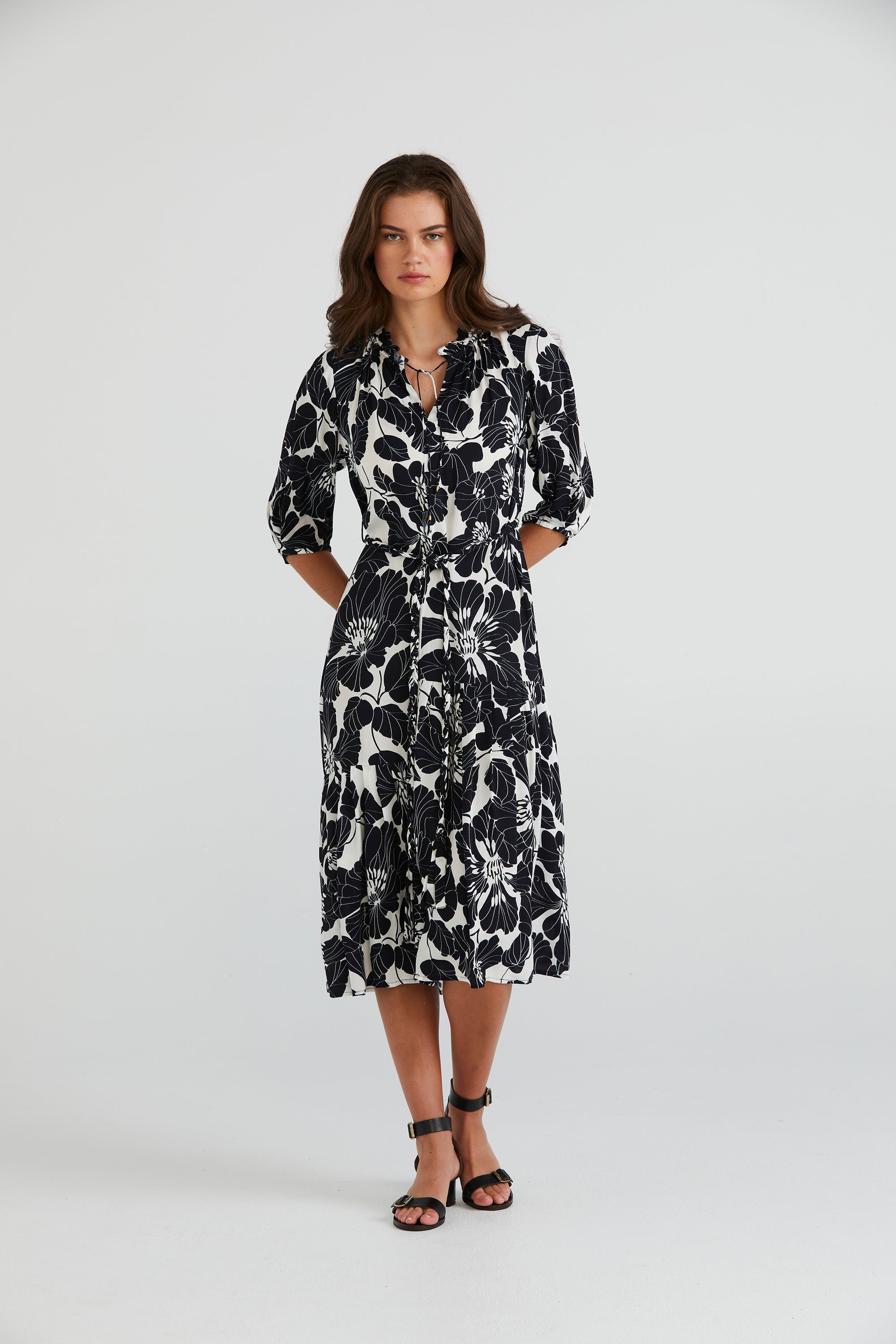 Step into timeless sophistication with the Plaza Dress, a viscose midi adorned in the Plaza floral print. Its ruffle tie gathered neckline and sleeves, complemented by soft tuck details, create a graceful silhouette. The asymmetrical stepped hem tiers add movement and interest, while the removable self-fabric plaited belt offers versatile styling options. This dress is perfect for both casual outings and special occasions.