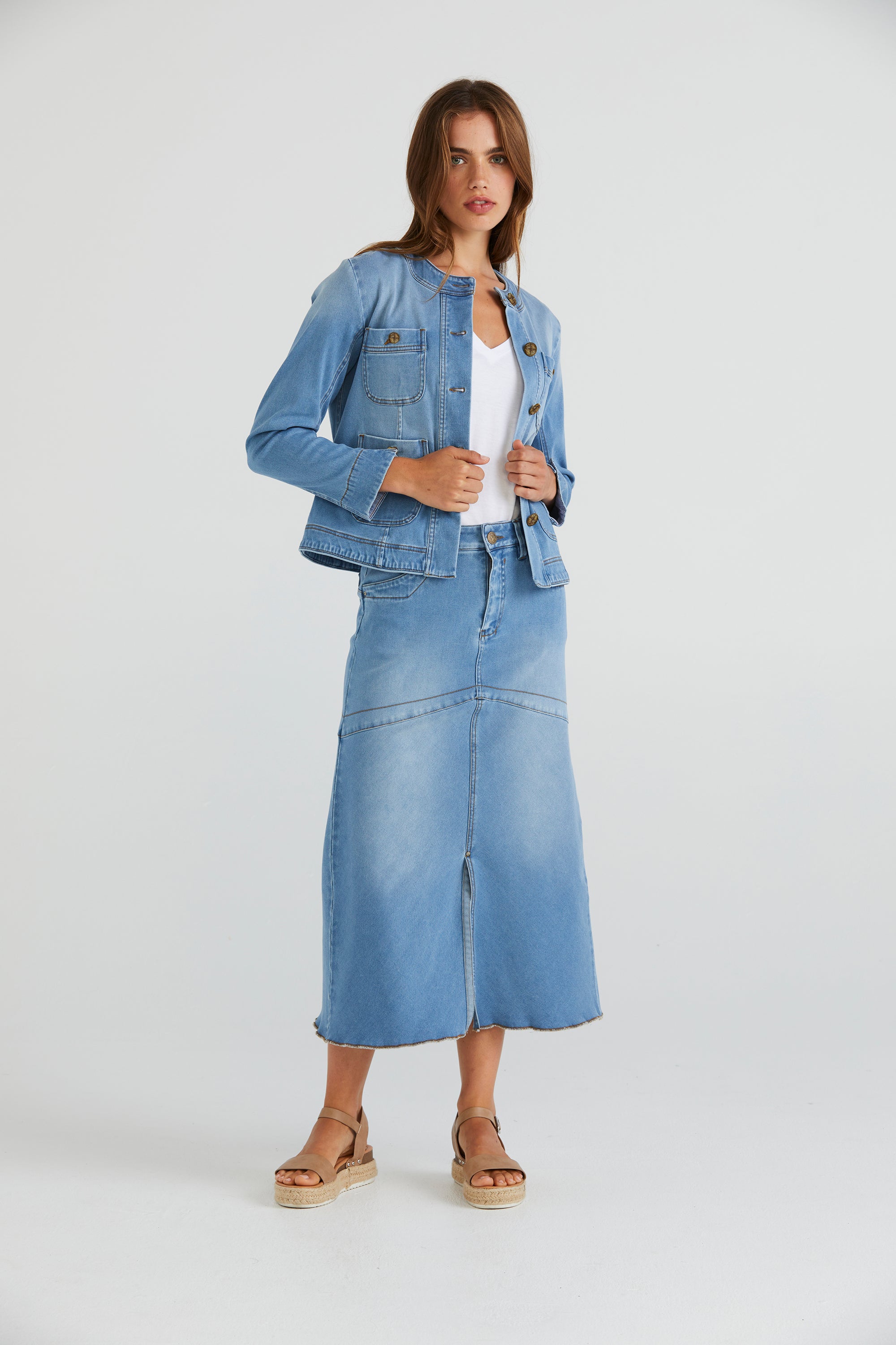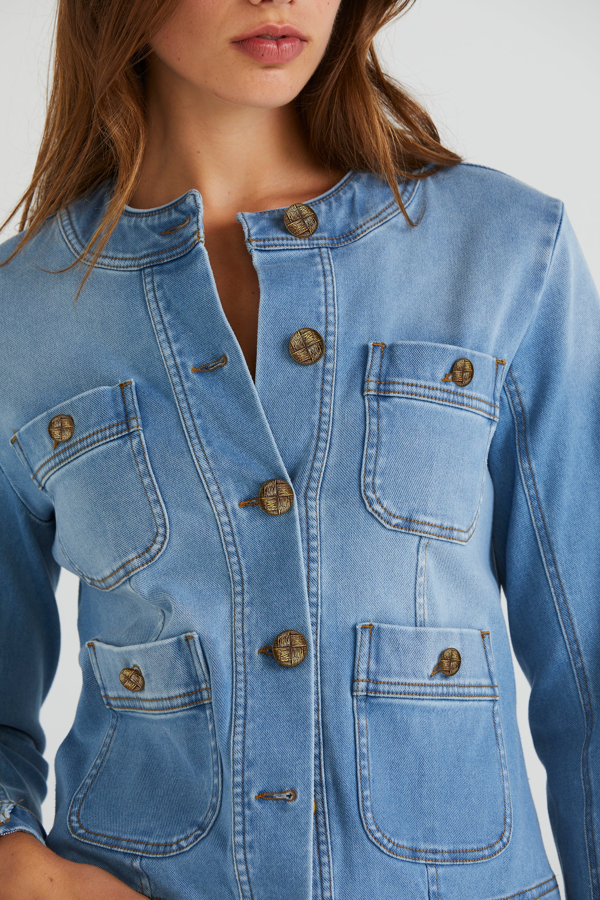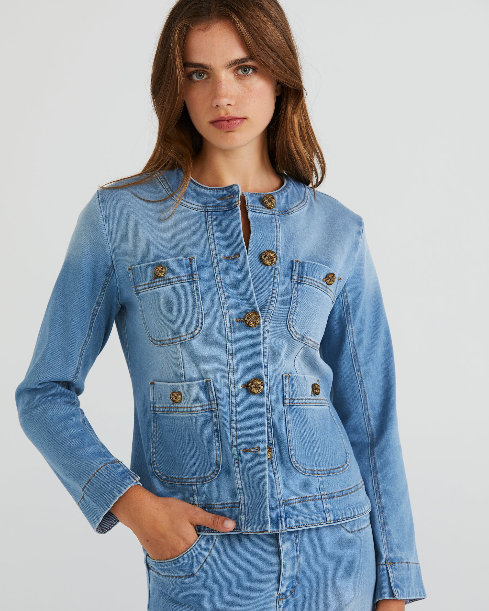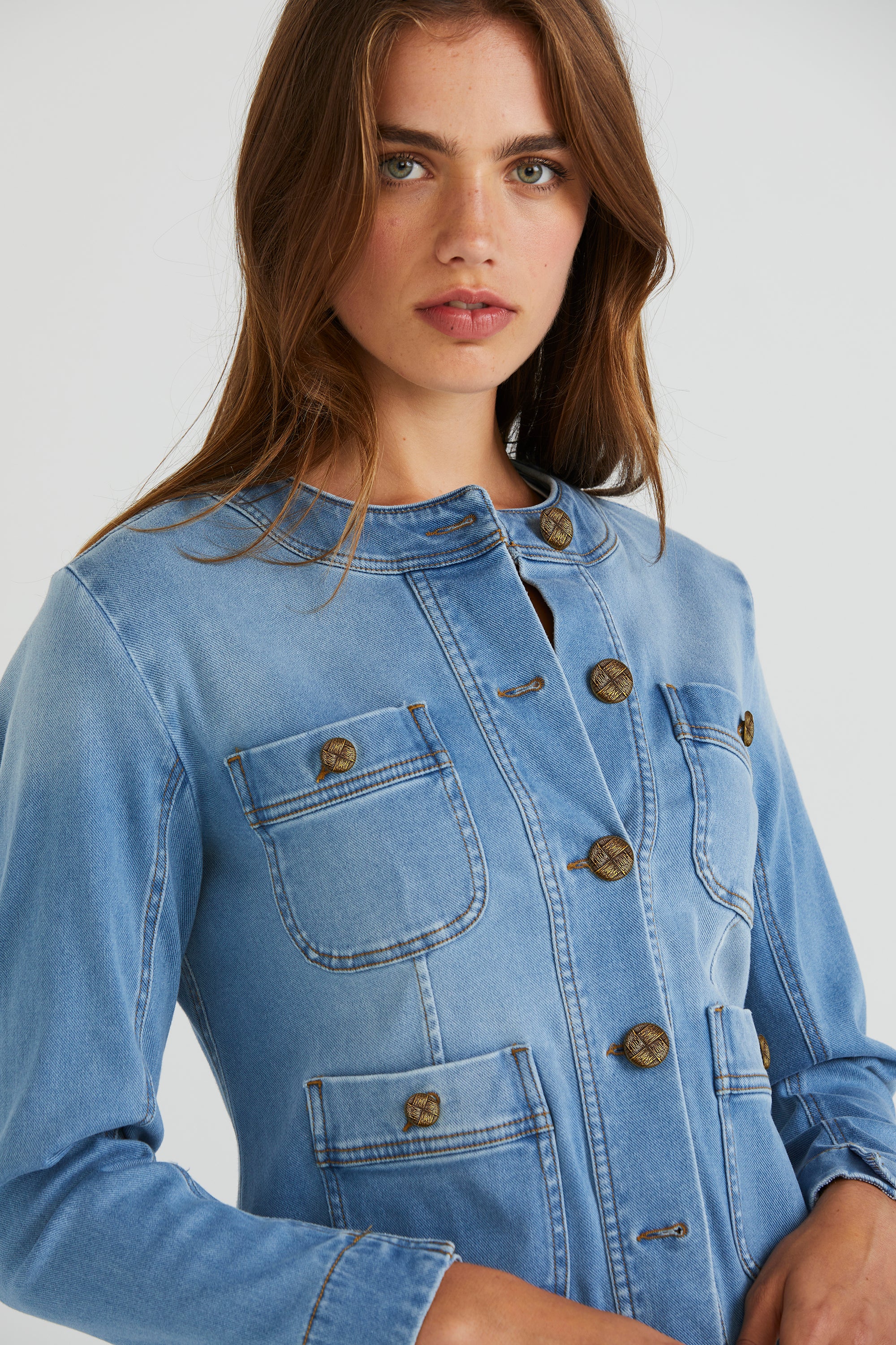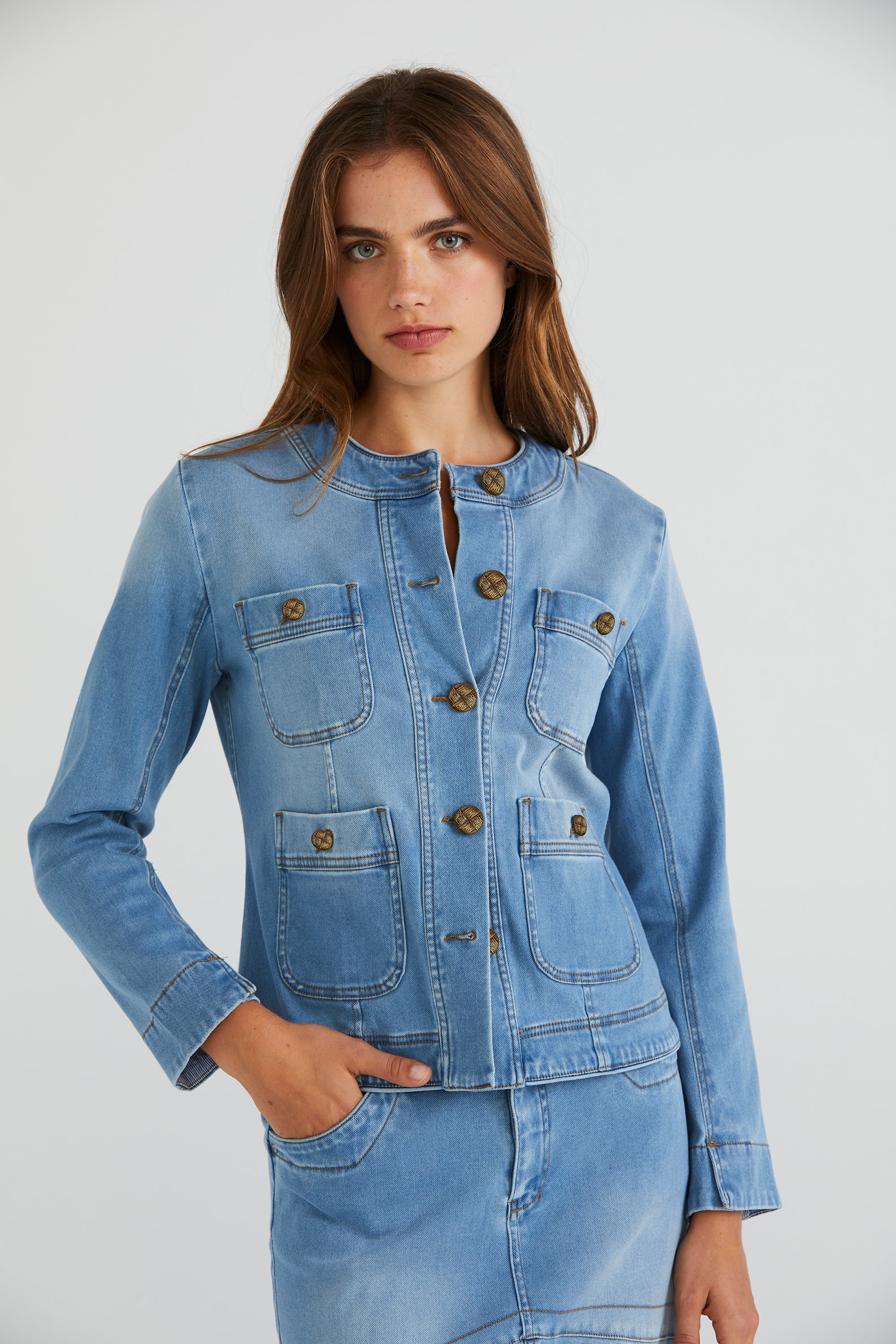 Step into effortless cool with the Rhode Jacket, a must-have addition to your wardrobe. Made from stretch denim, it features Chanel-style pocket detailing finished with antique brass basketweave buttons for a sophisticated look. Contrast topstitching enhances the jacket's design lines, while a back neck detail with a tab and small embroidery design adds a subtle pop of personality. Perfect for layering over any outfit for a stylish finish.