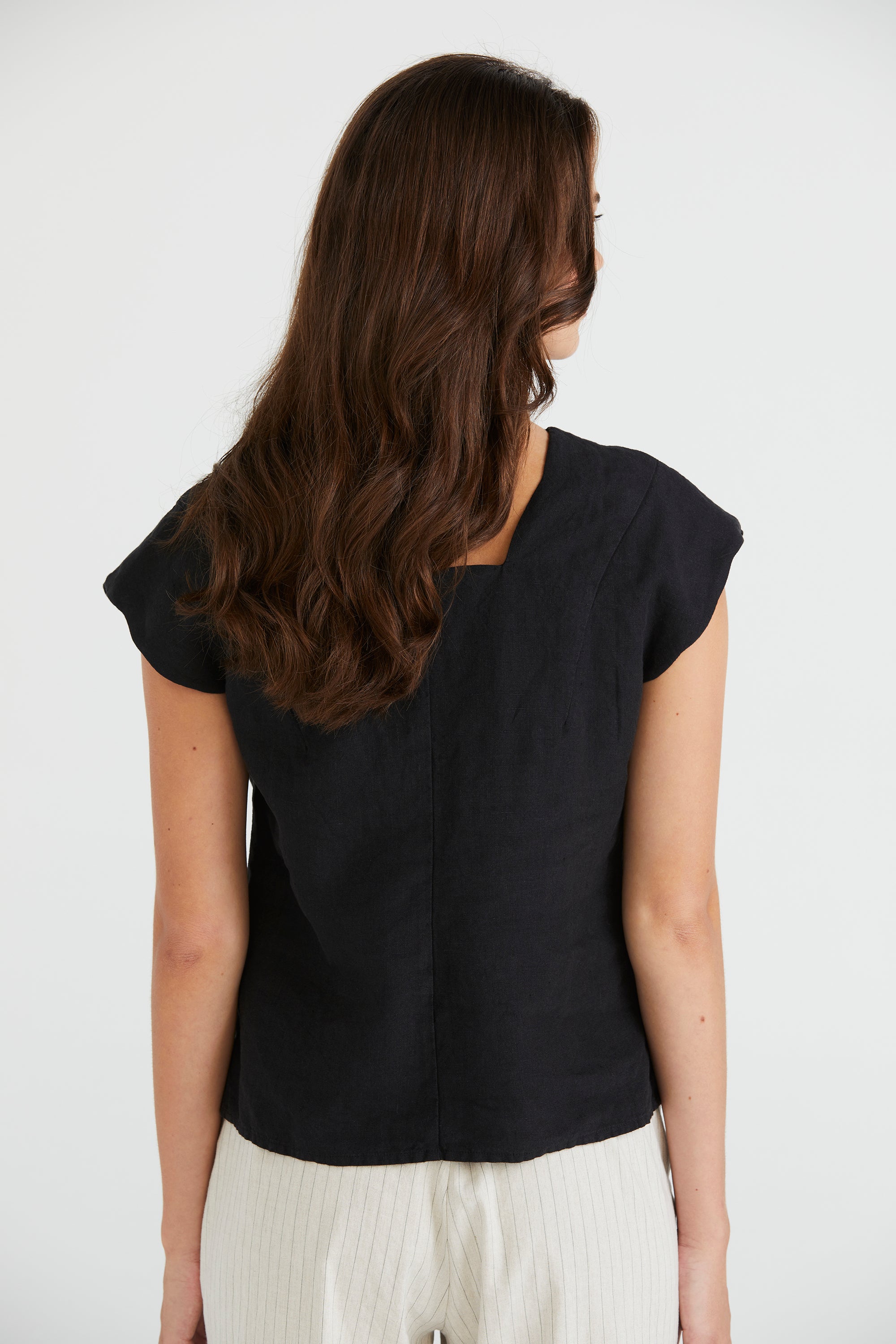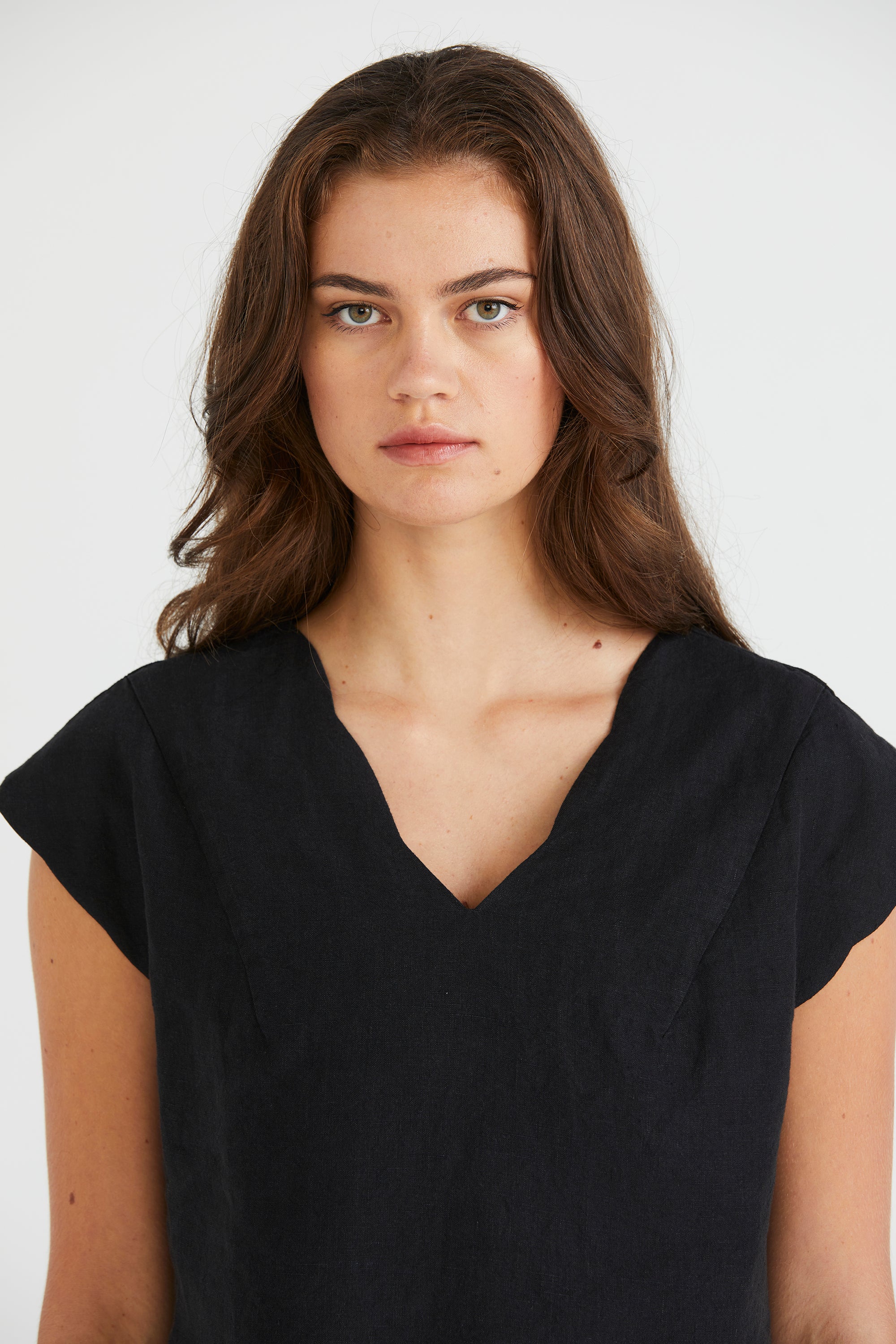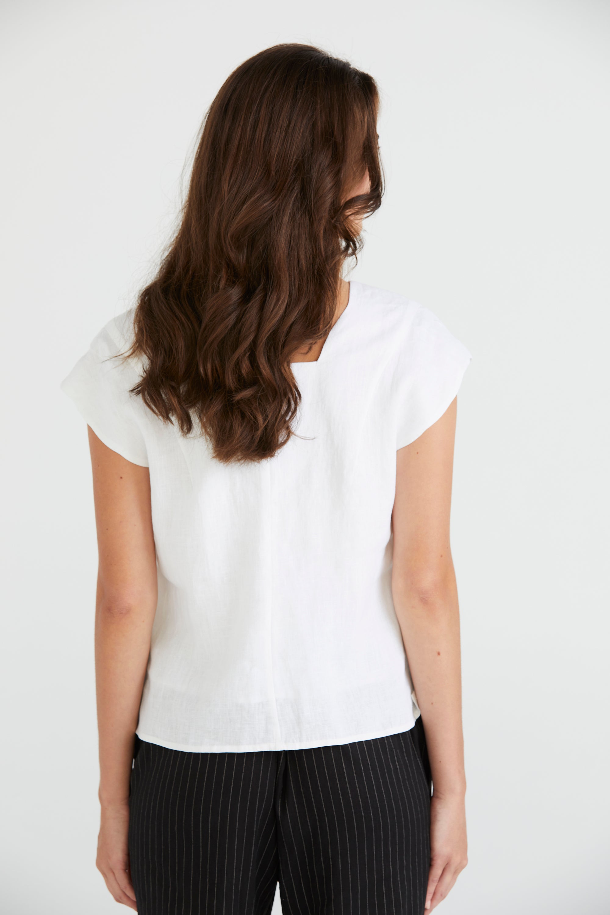 Embrace the breezy allure of summer in the Scallop Top, made from airy linen. The scallop-edged neckline and capped sleeve hem add a hint of whimsy to this classic silhouette. Fully lined, this versatile top is the perfect choice to elevate your summer wardrobe, whether paired with jeans for a casual day out or under pin-stripe suiting for a more polished look.