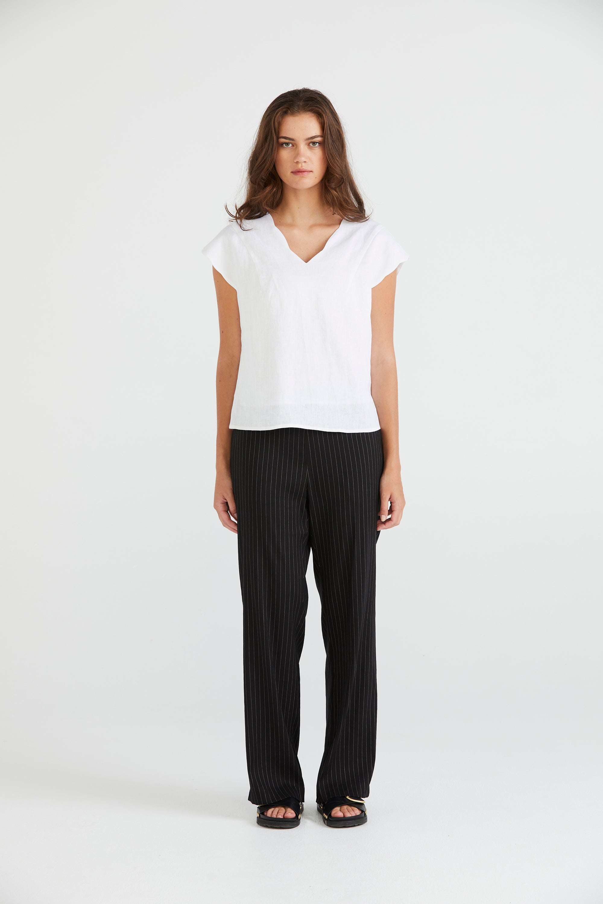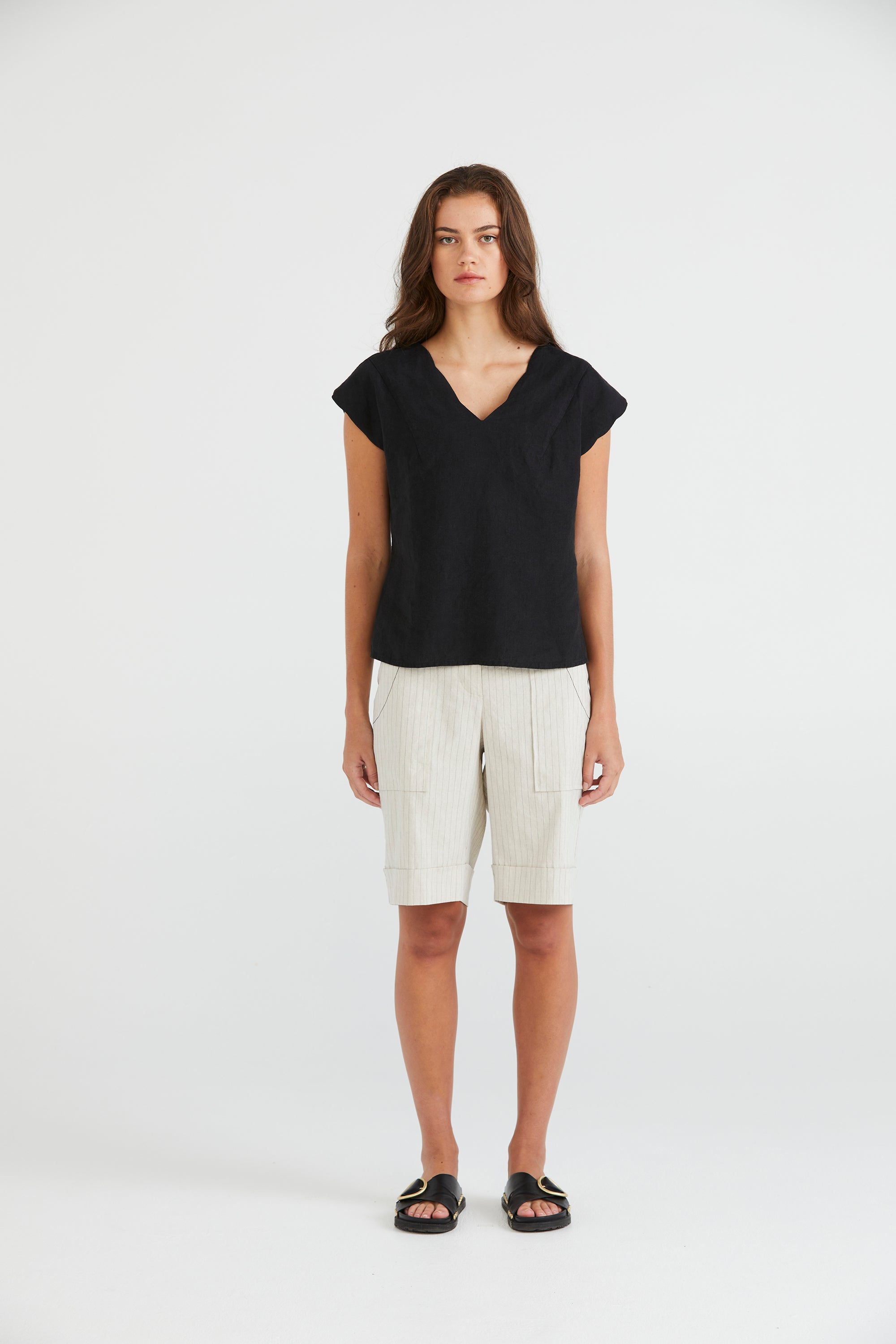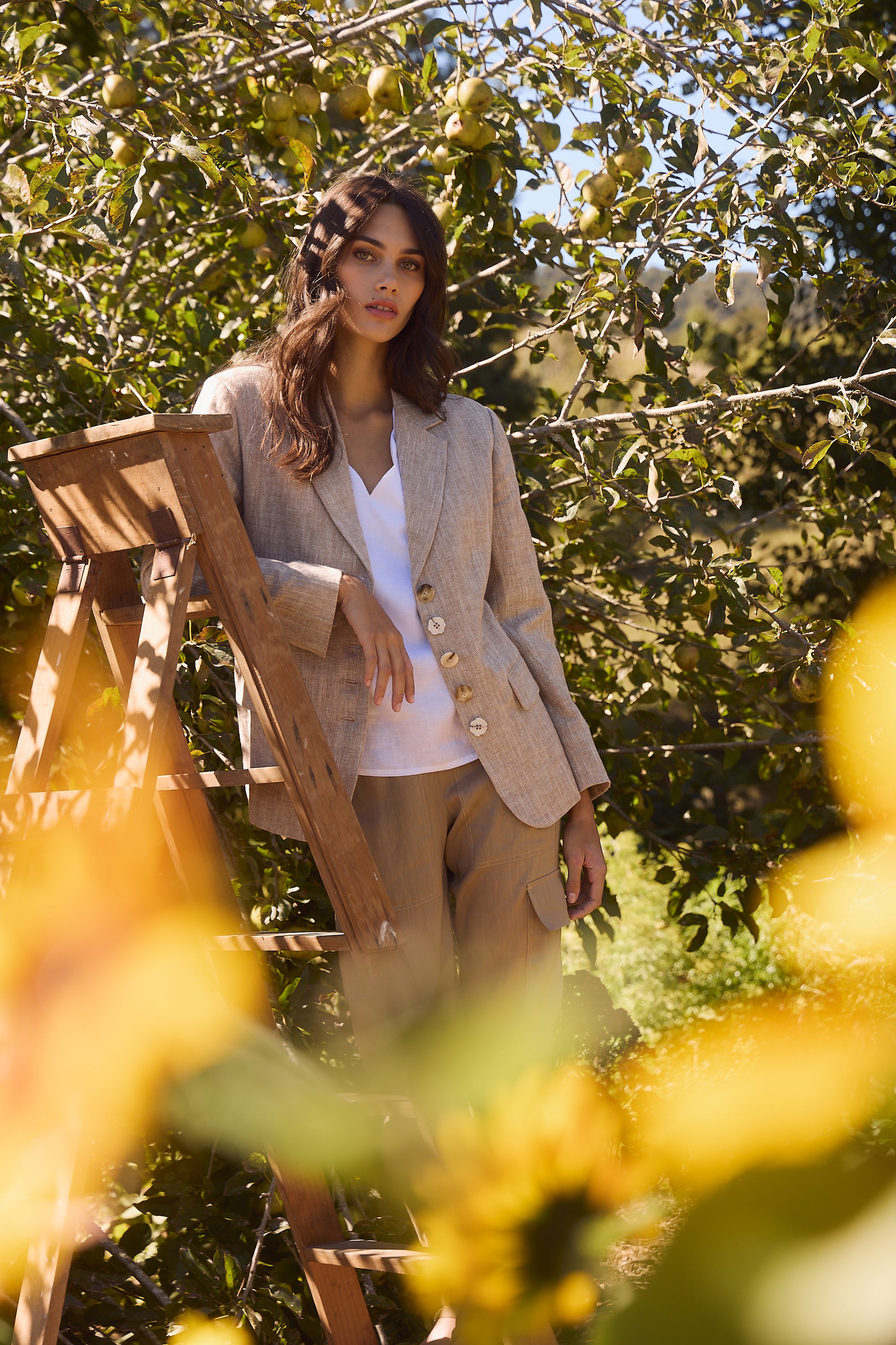 Embrace the breezy allure of summer in the Scallop Top, made from airy linen. The scallop-edged neckline and capped sleeve hem add a hint of whimsy to this classic silhouette. Fully lined, this versatile top is the perfect choice to elevate your summer wardrobe, whether paired with jeans for a casual day out or under pin-stripe suiting for a more polished look.