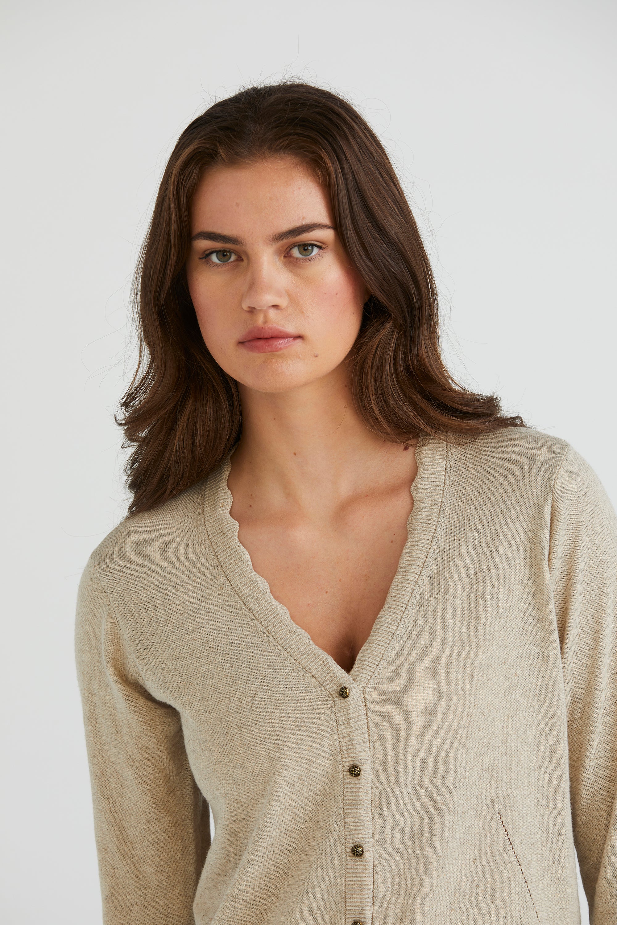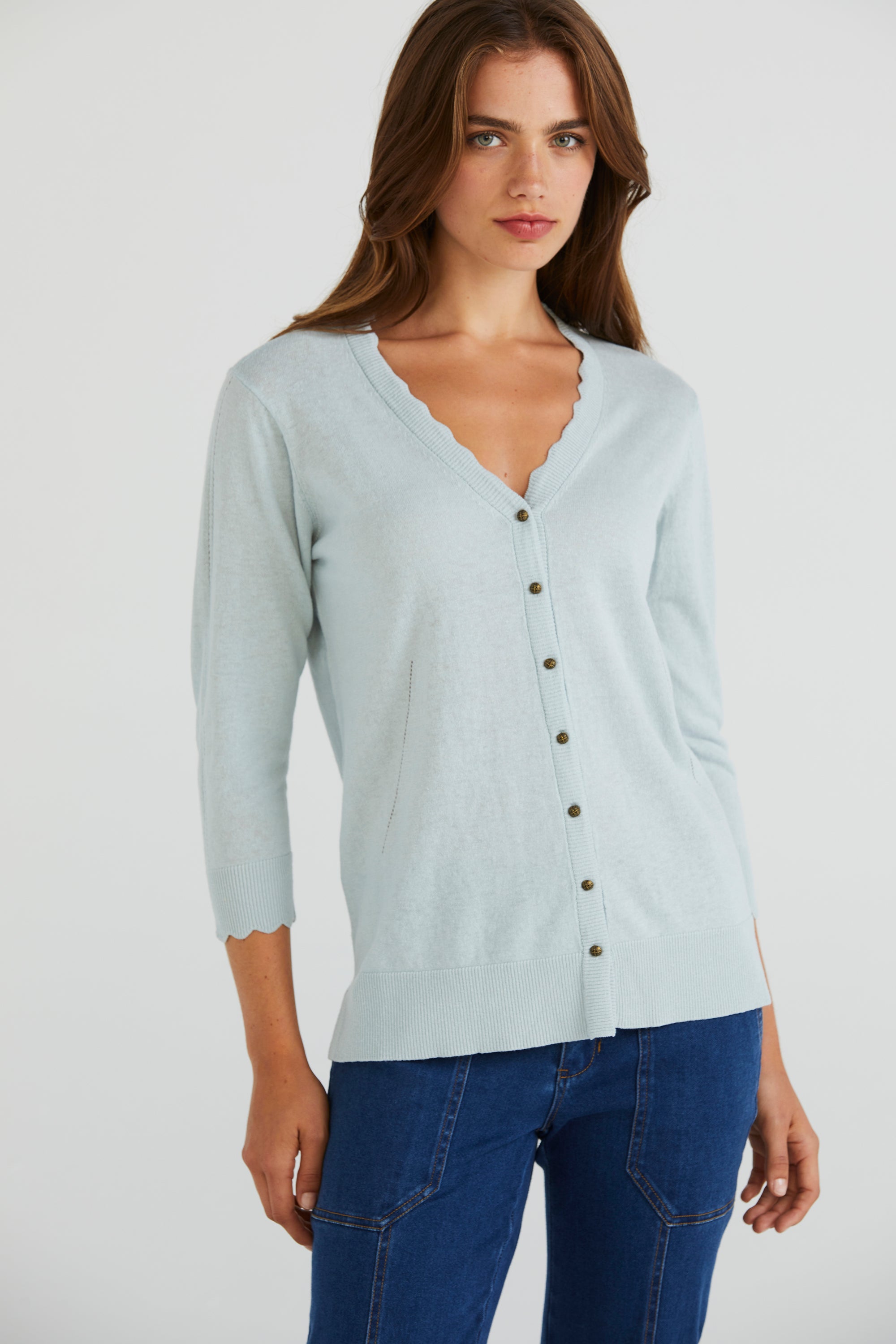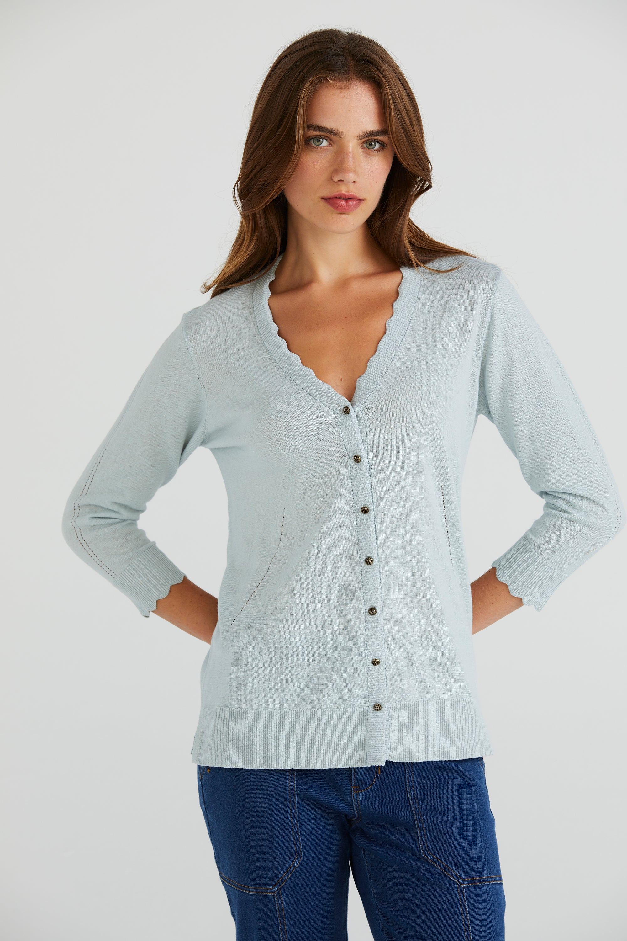 Wrap yourself in elegance with the Shell Cardi, a linen cotton blend knit in serene marled tones. The delicate scalloped rib design at the neckline and sleeve hems adds a feminine touch. Perfect for layering, this cardi brings both comfort and style to any outfit.