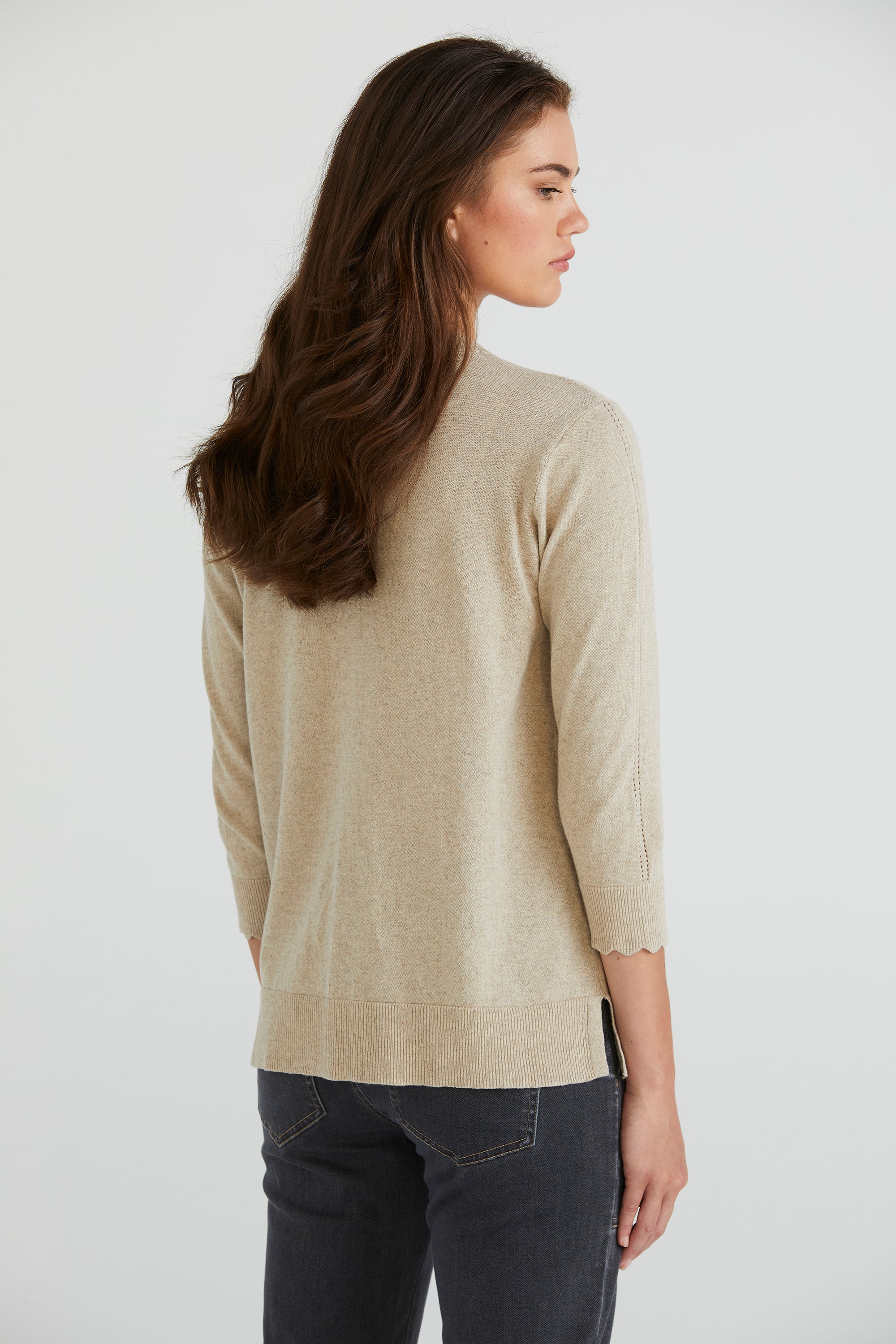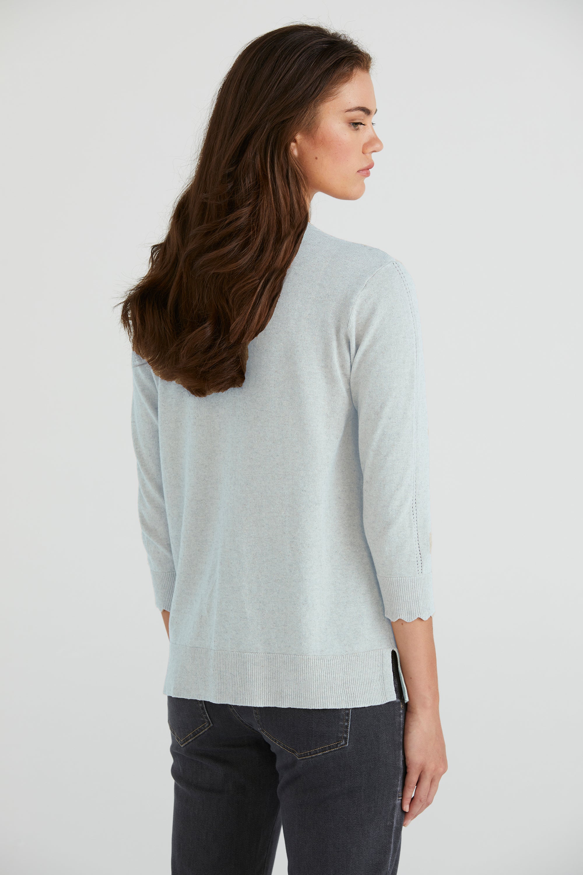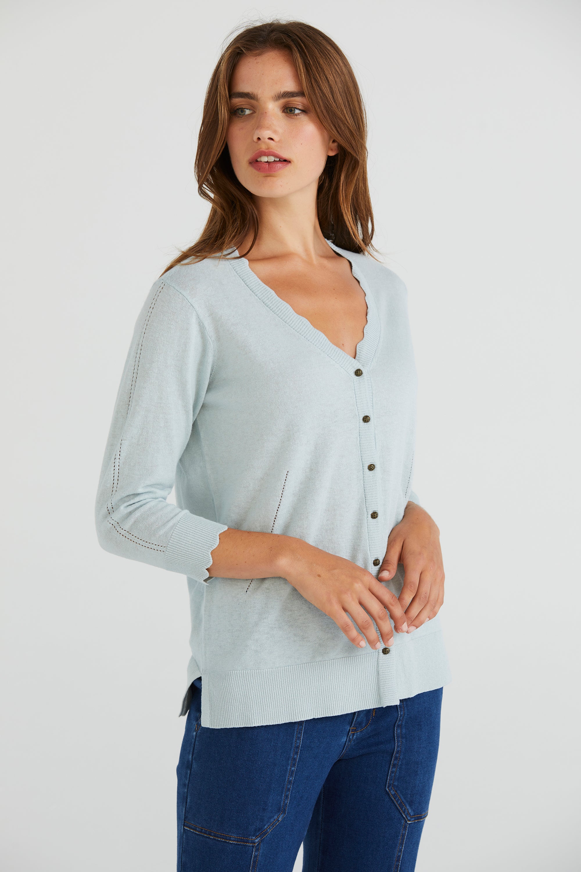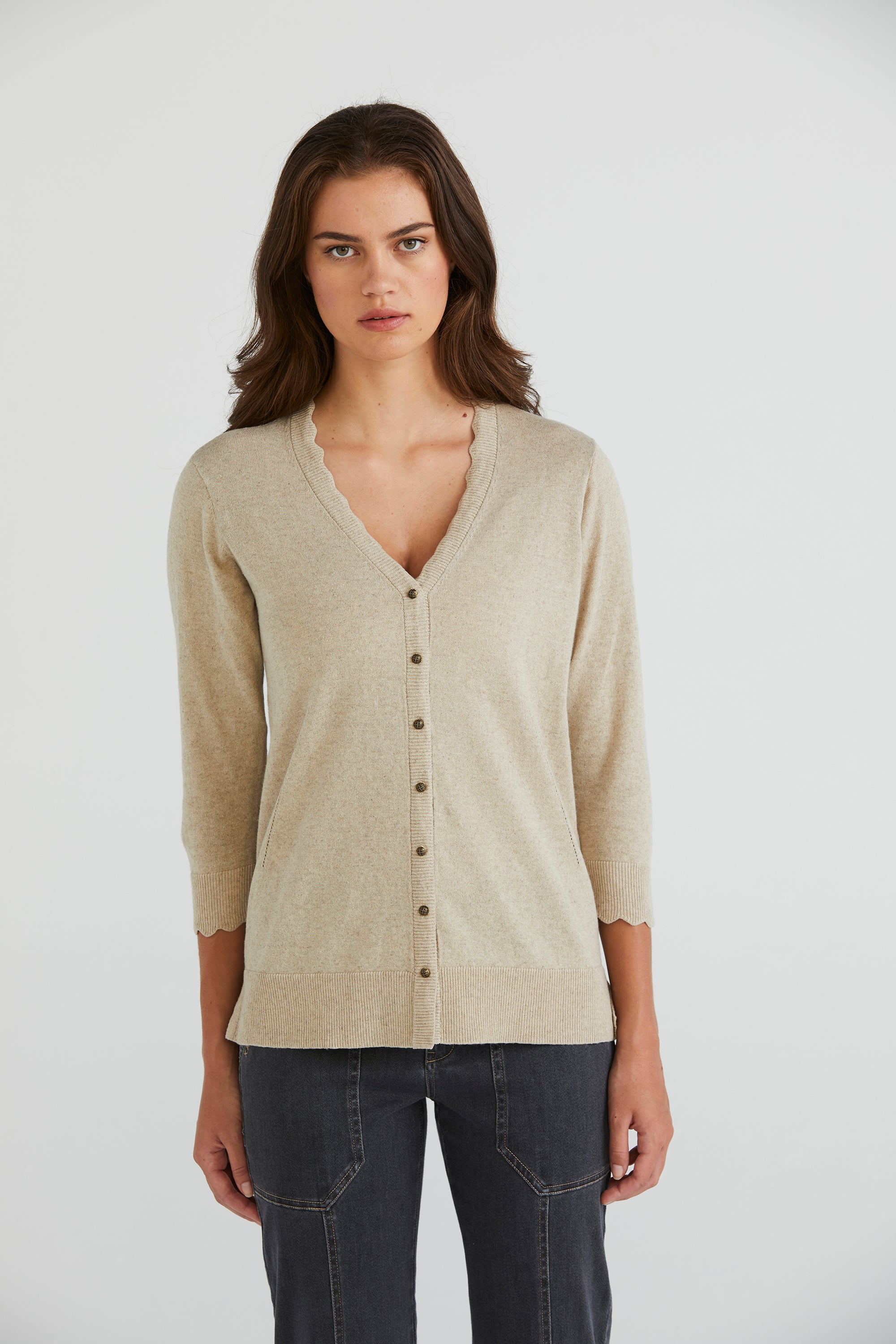 Wrap yourself in elegance with the Shell Cardi, a linen cotton blend knit in serene marled tones. The delicate scalloped rib design at the neckline and sleeve hems adds a feminine touch. Perfect for layering, this cardi brings both comfort and style to any outfit.