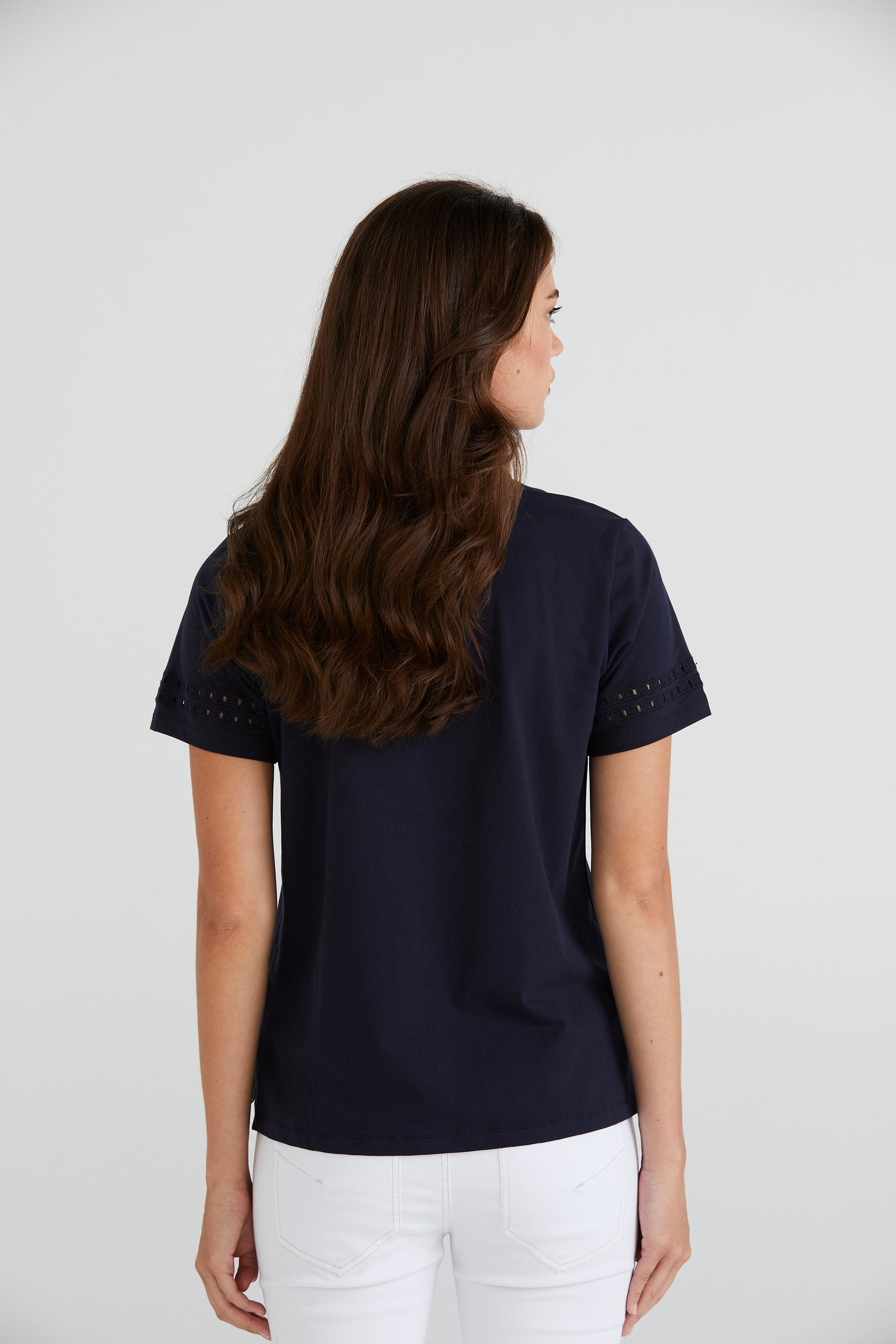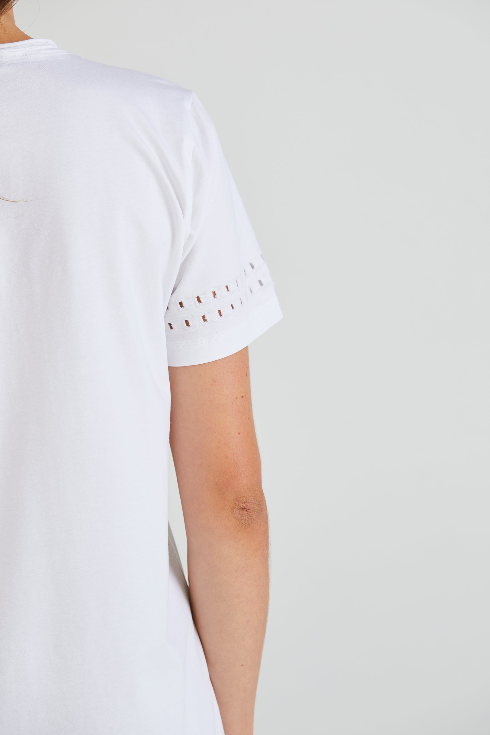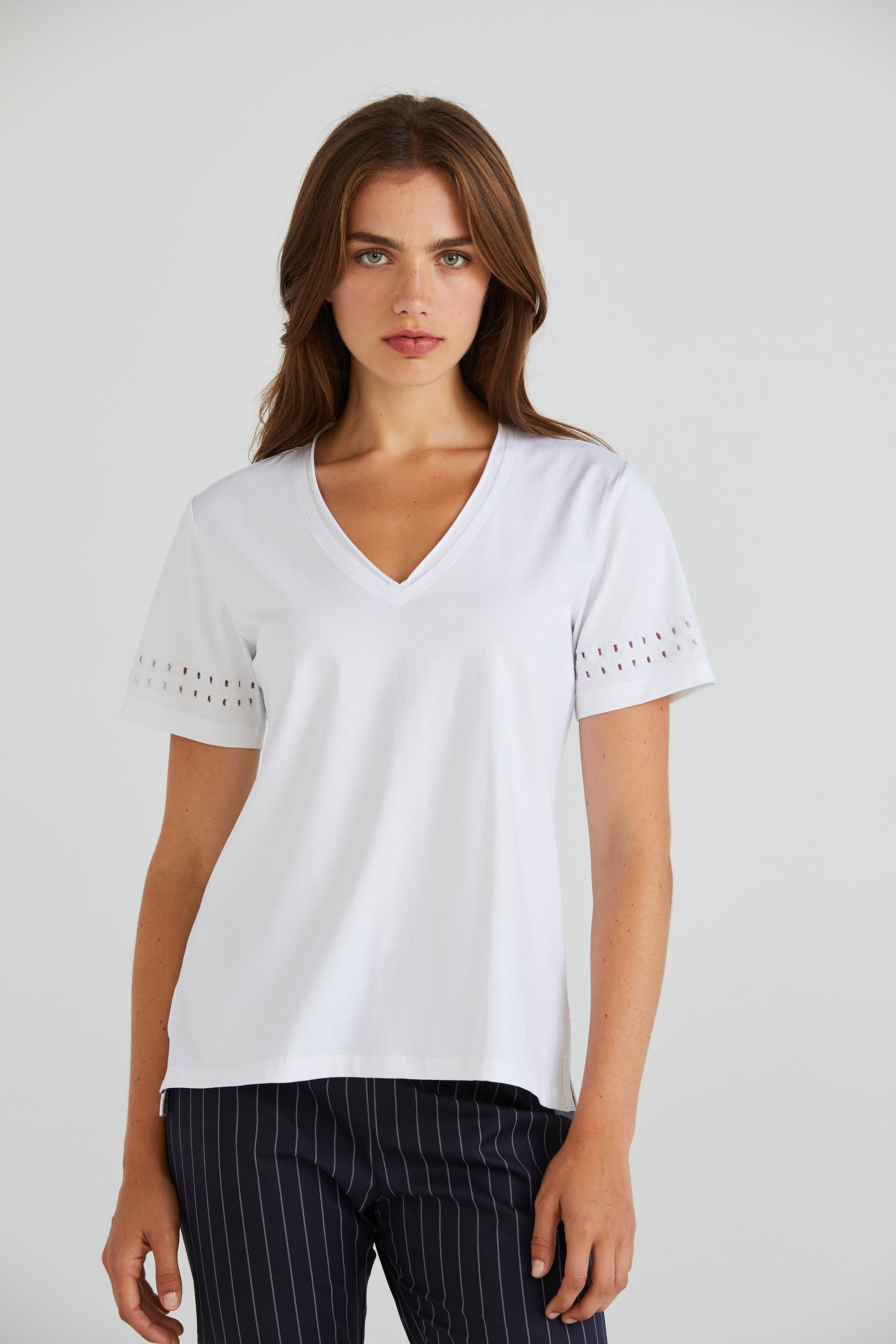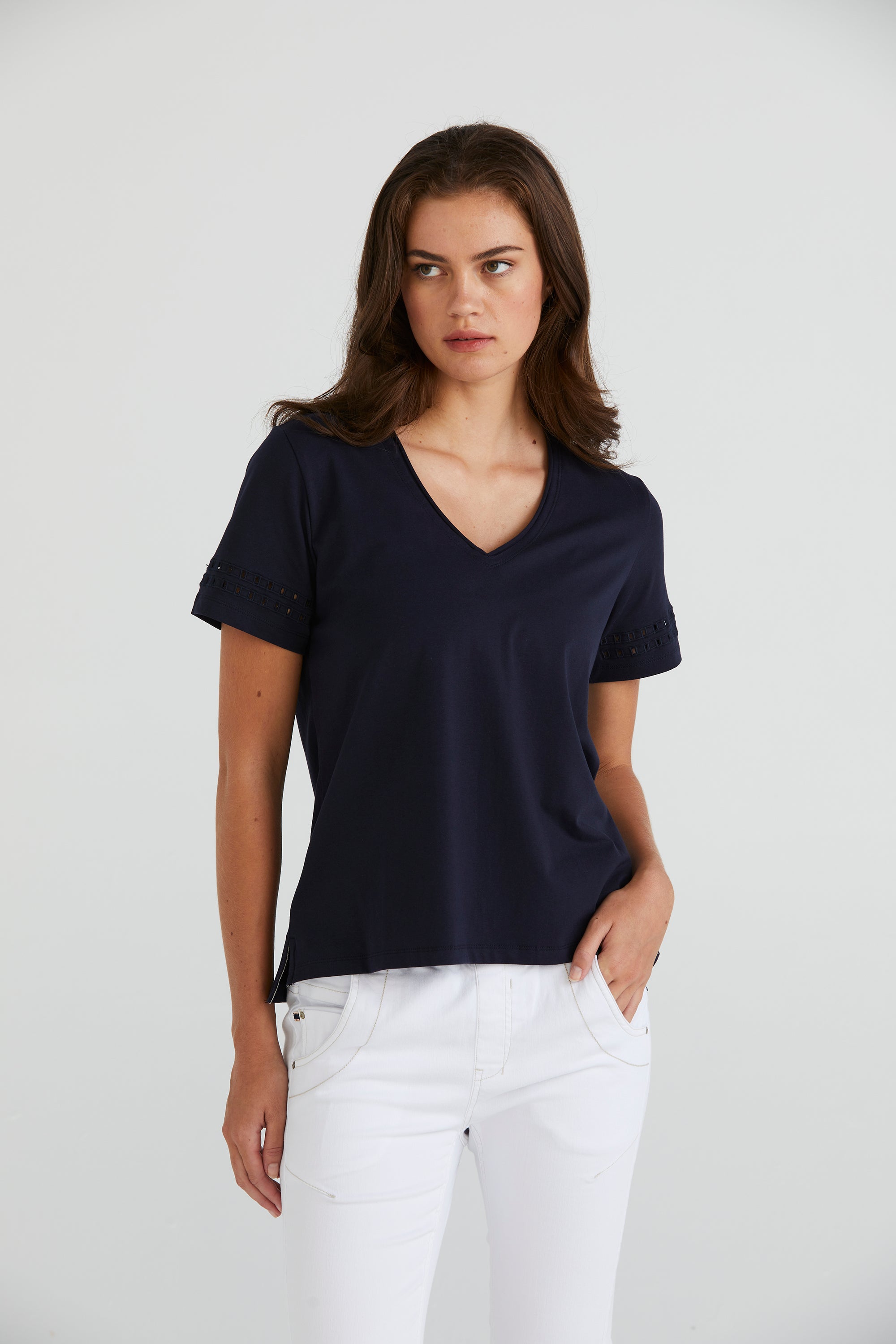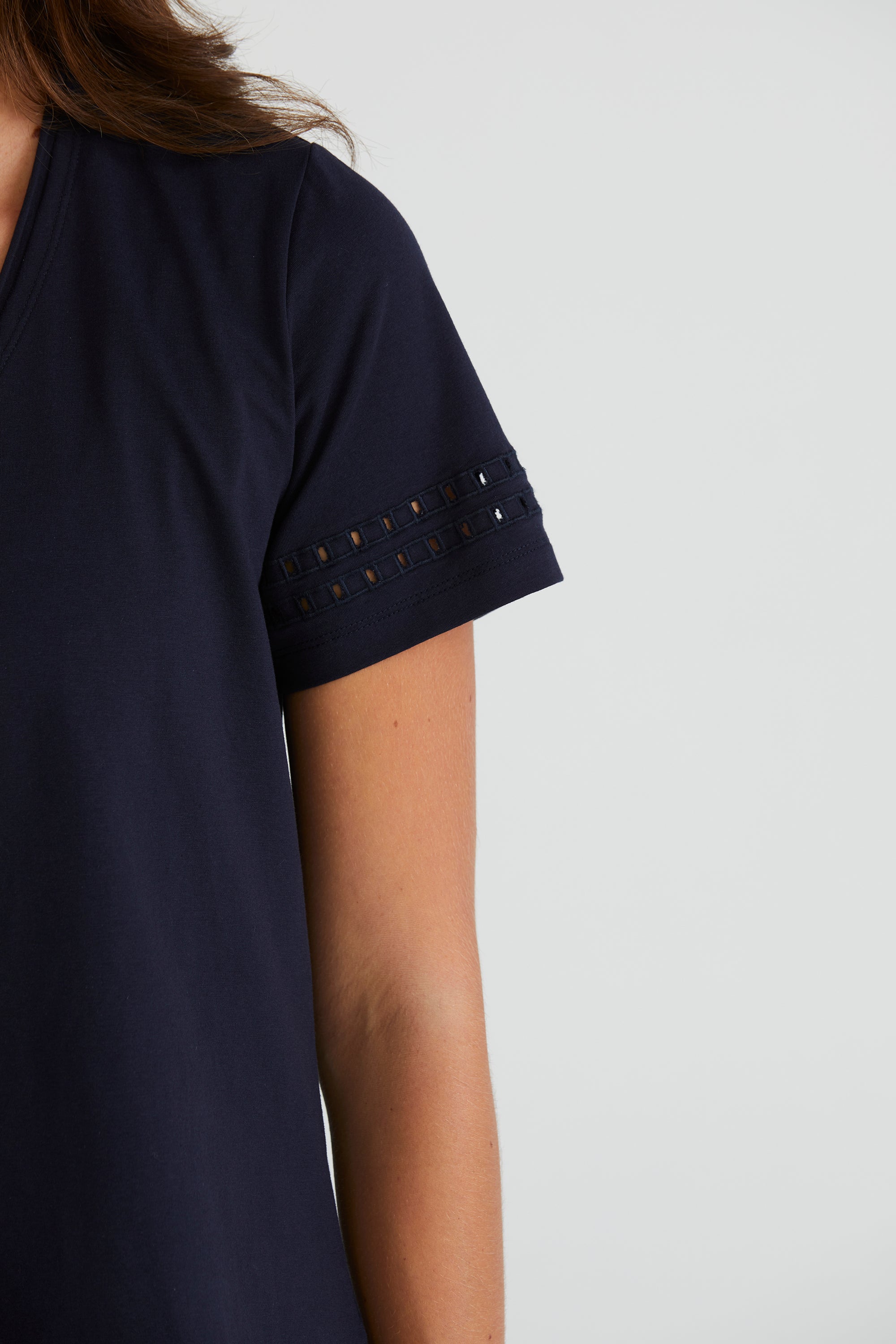 Embrace understated elegance with the Zoe Top, crafted from soft stretch cotton. Its V-neckline offers a flattering silhouette, while the cut-out embroidery design at the lower sleeve adds an element of intrigue and style to this versatile wardrobe staple.