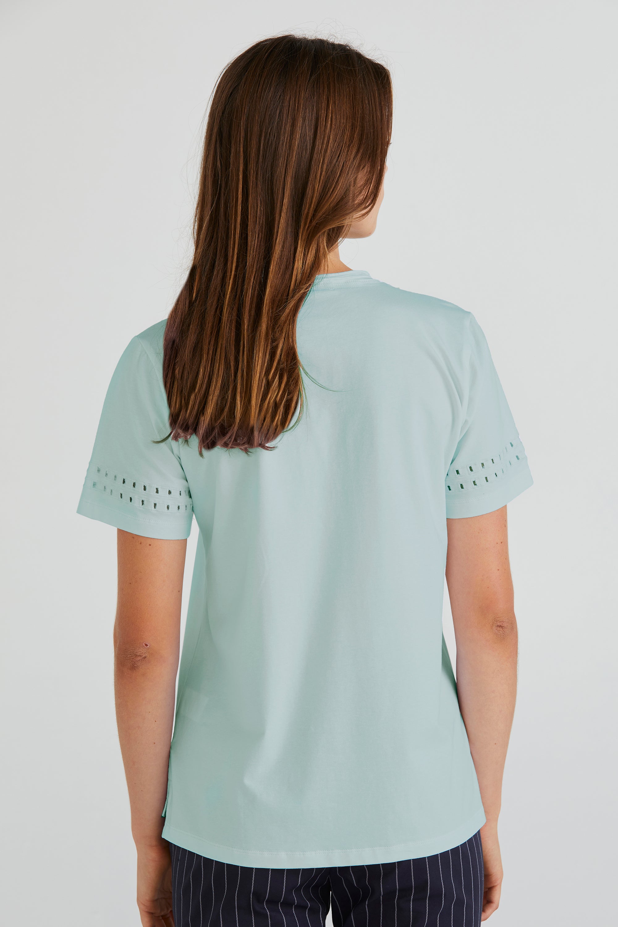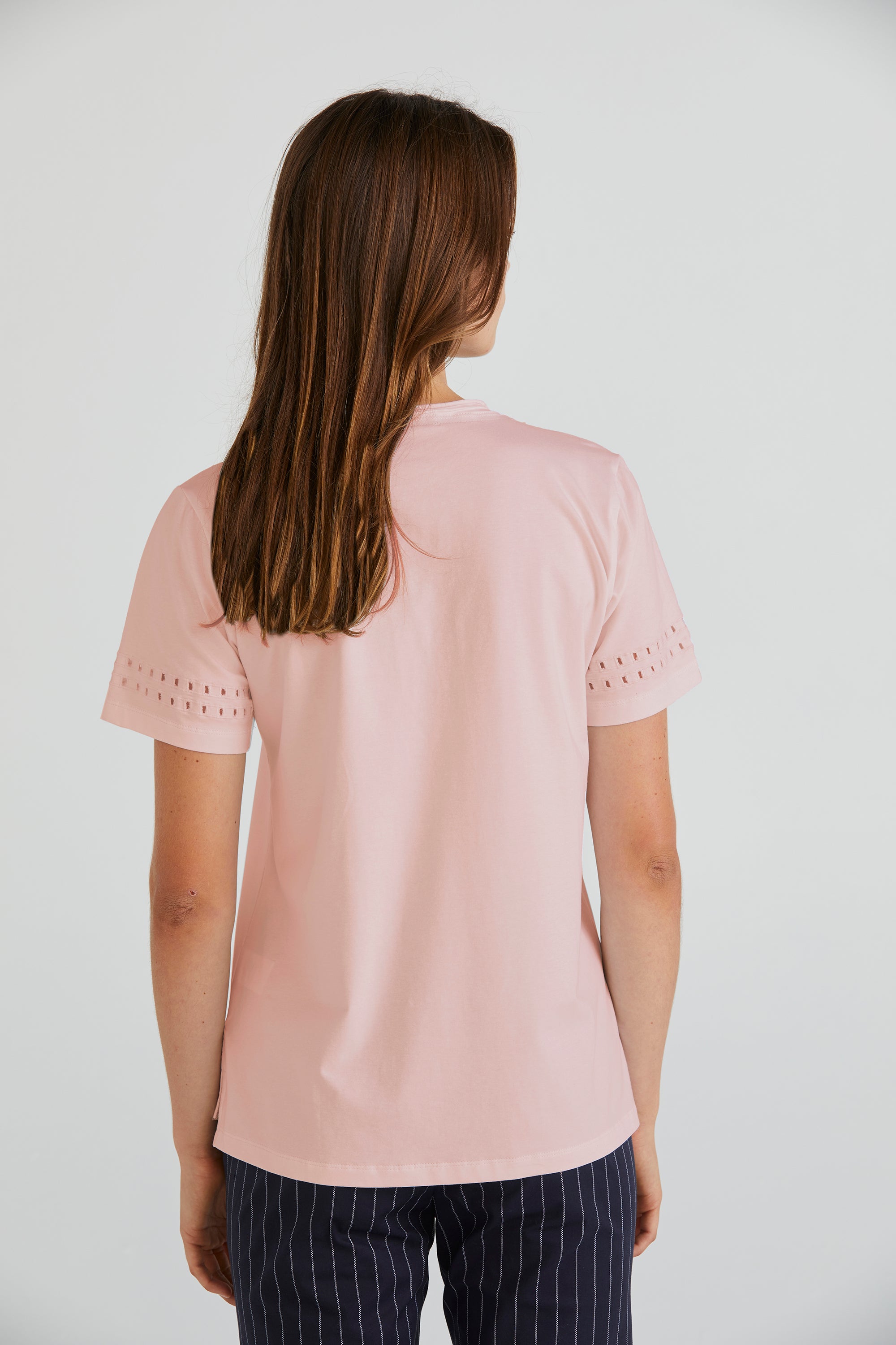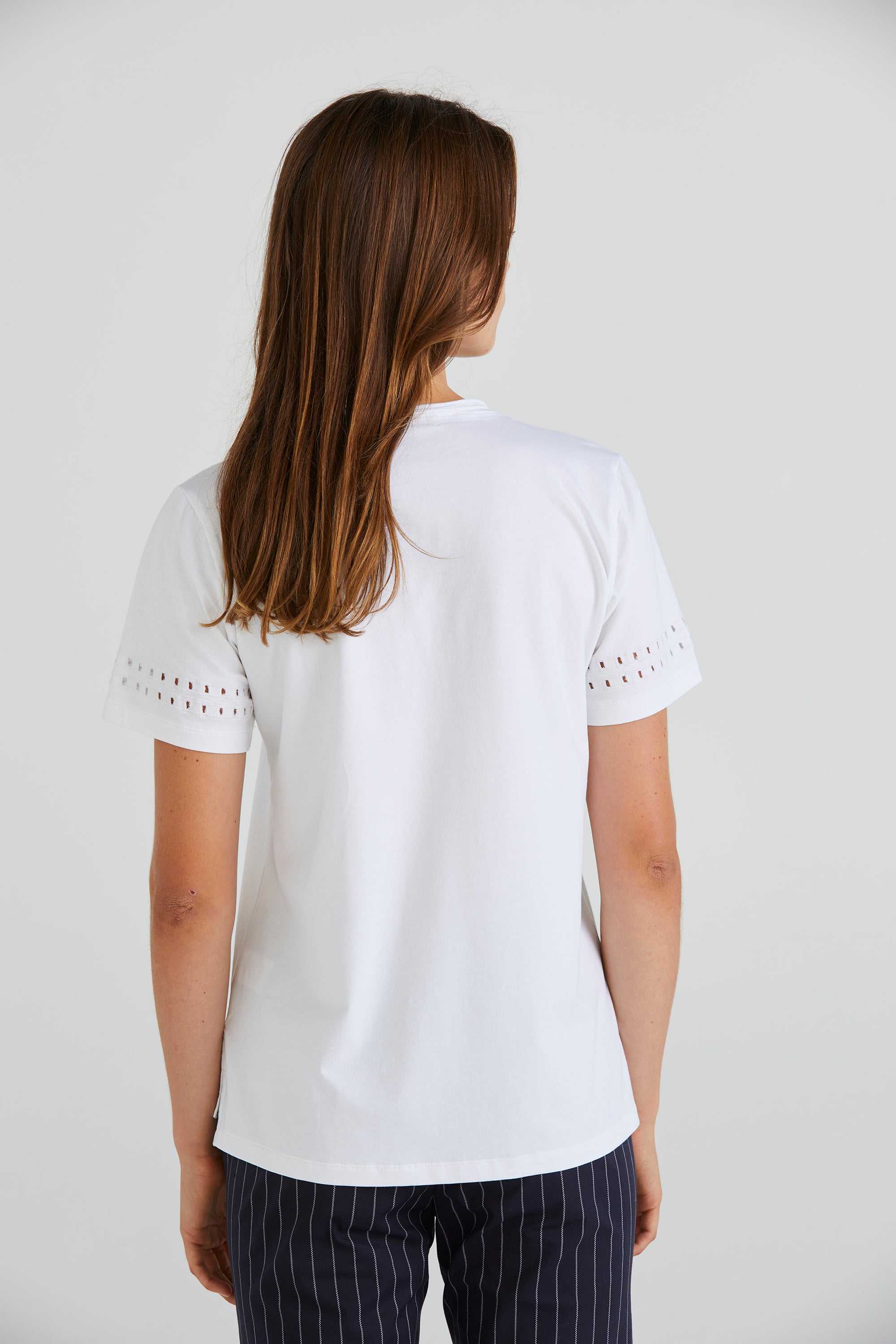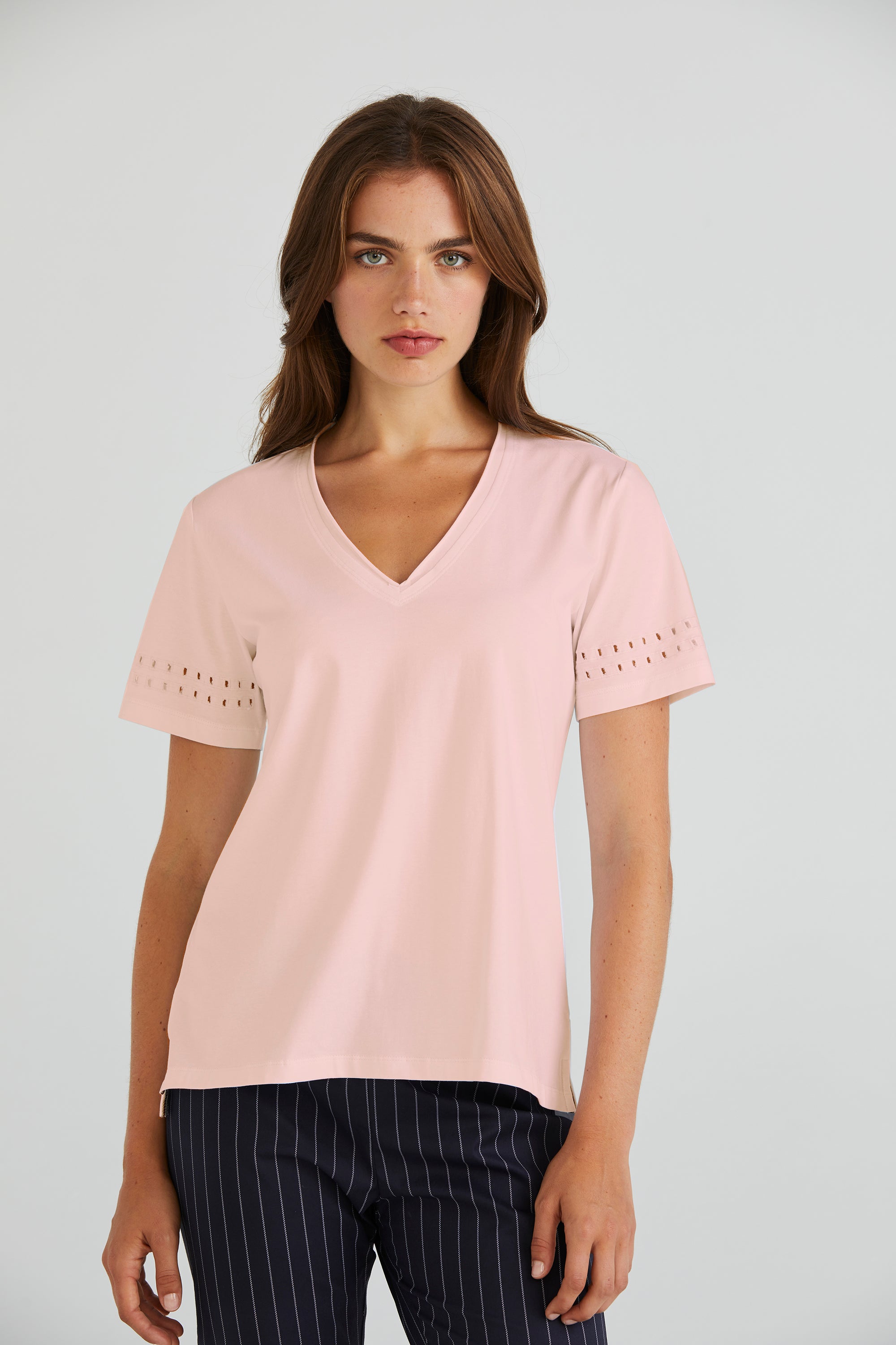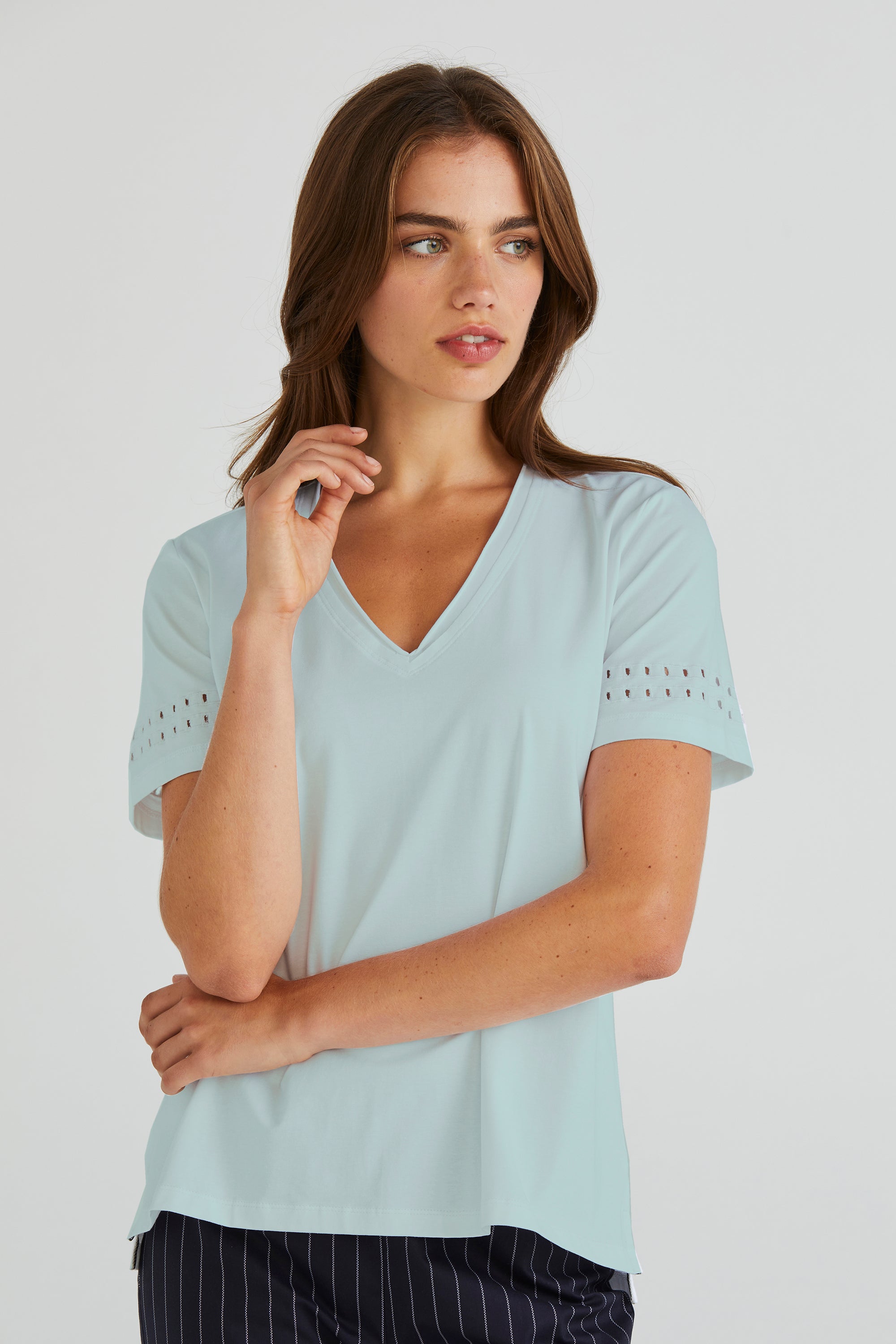 Embrace understated elegance with the Zoe Top, crafted from soft stretch cotton. Its V-neckline offers a flattering silhouette, while the cut-out embroidery design at the lower sleeve adds an element of intrigue and style to this versatile wardrobe staple.