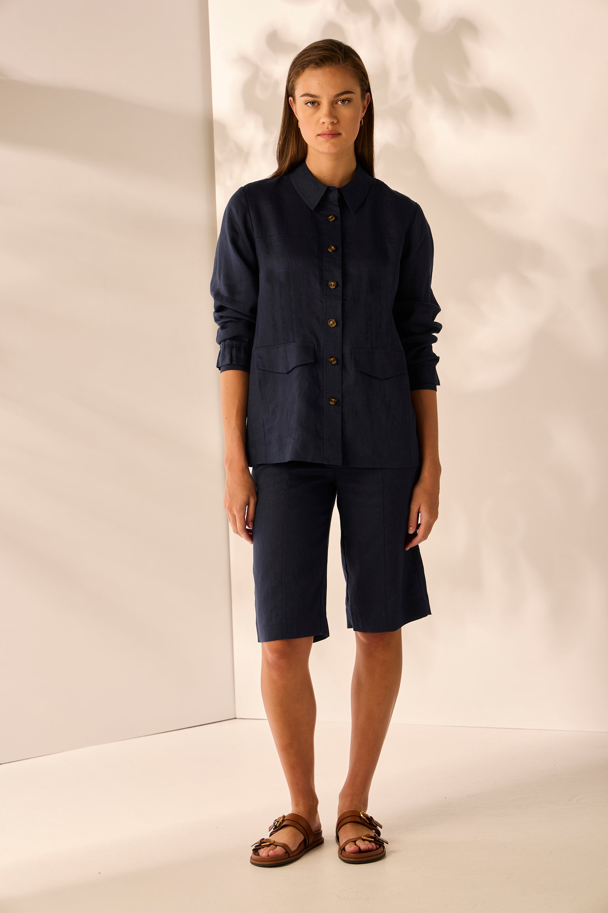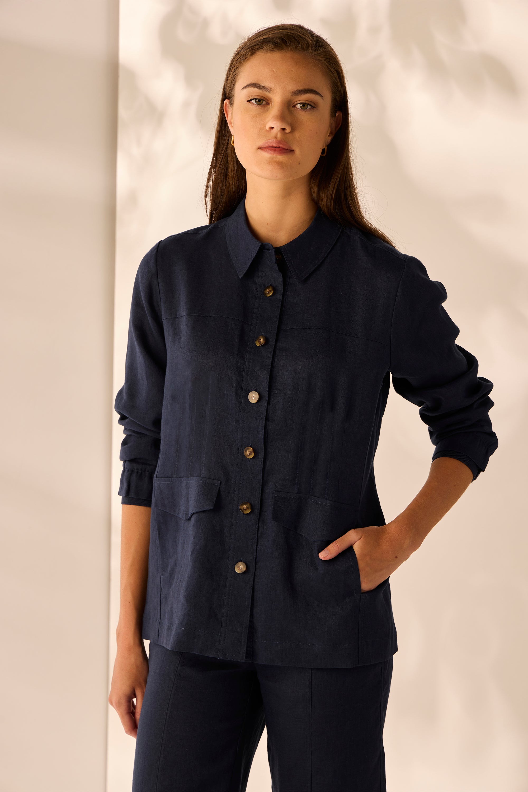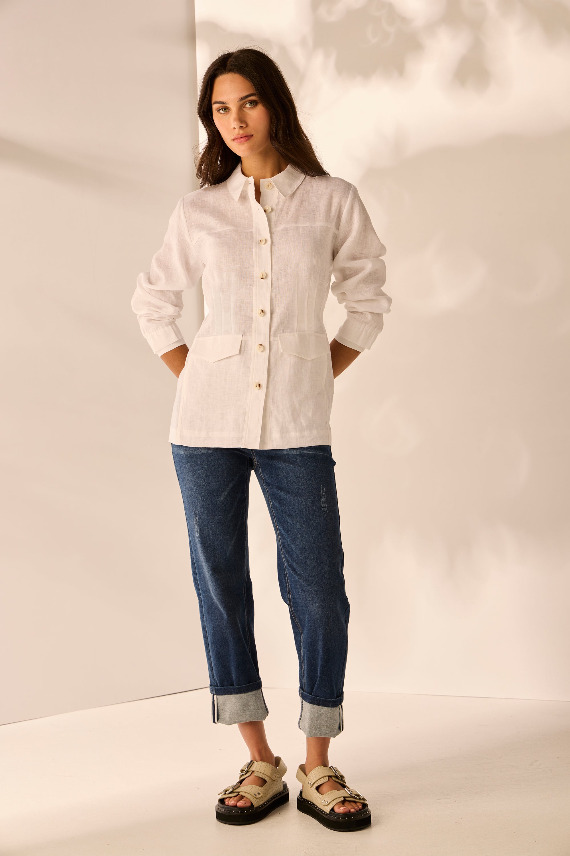 The Hayden Jacket is a smart-casual staple, crafted from breathable linen and designed for effortless style. Featuring refined pin-tuck detailing at the front, ribbed cuffs, and an elasticated back waist, it offers a flattering silhouette with a relaxed, modern feel—perfect for layering through the seasons.