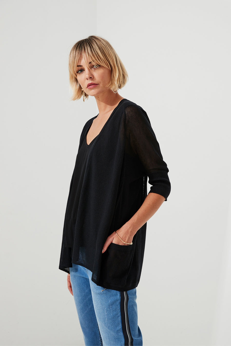A light weight cardigan handy for those cooler mornings or evenings. 3/4 sleeve length with rib cuff.