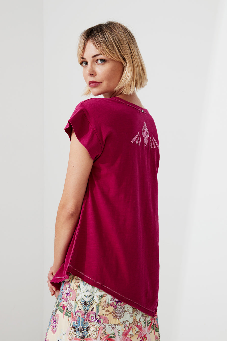 Soft handle 100% slub cotton, easy wear, featuring asymmetrical raw edge hemline and embroidered detail at back. Slightly distressed finish is achieved by special garment wash.