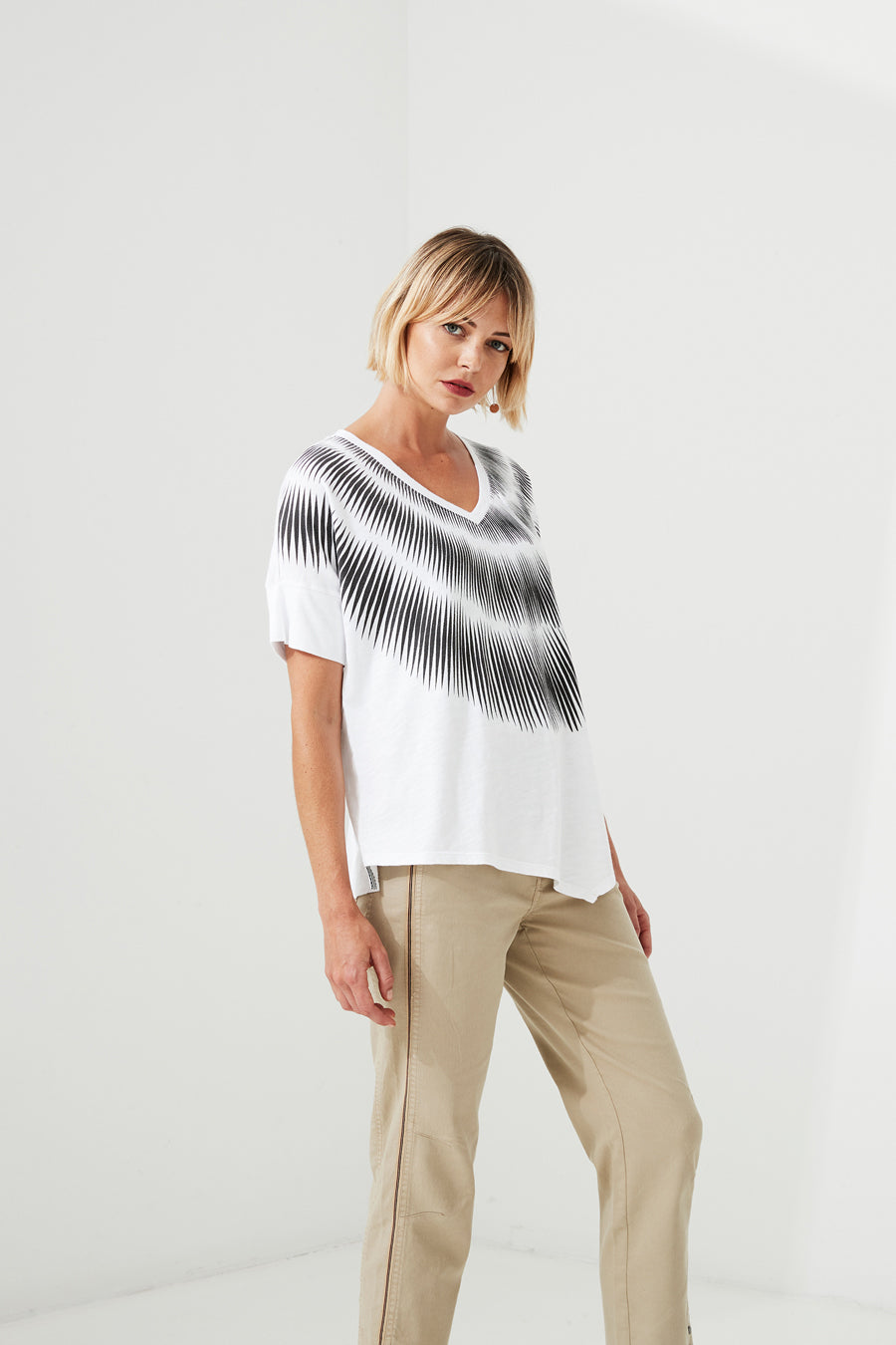 Simple but edgy, in our soft handle 100% slub cotton, featuring drop shoulder, and asymmetrical hemline and dash screen print.