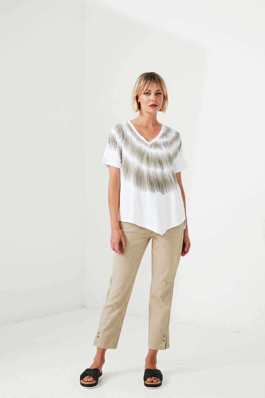 Simple but edgy, in our soft handle 100% slub cotton, featuring drop shoulder, and asymmetrical hemline and dash screen print.