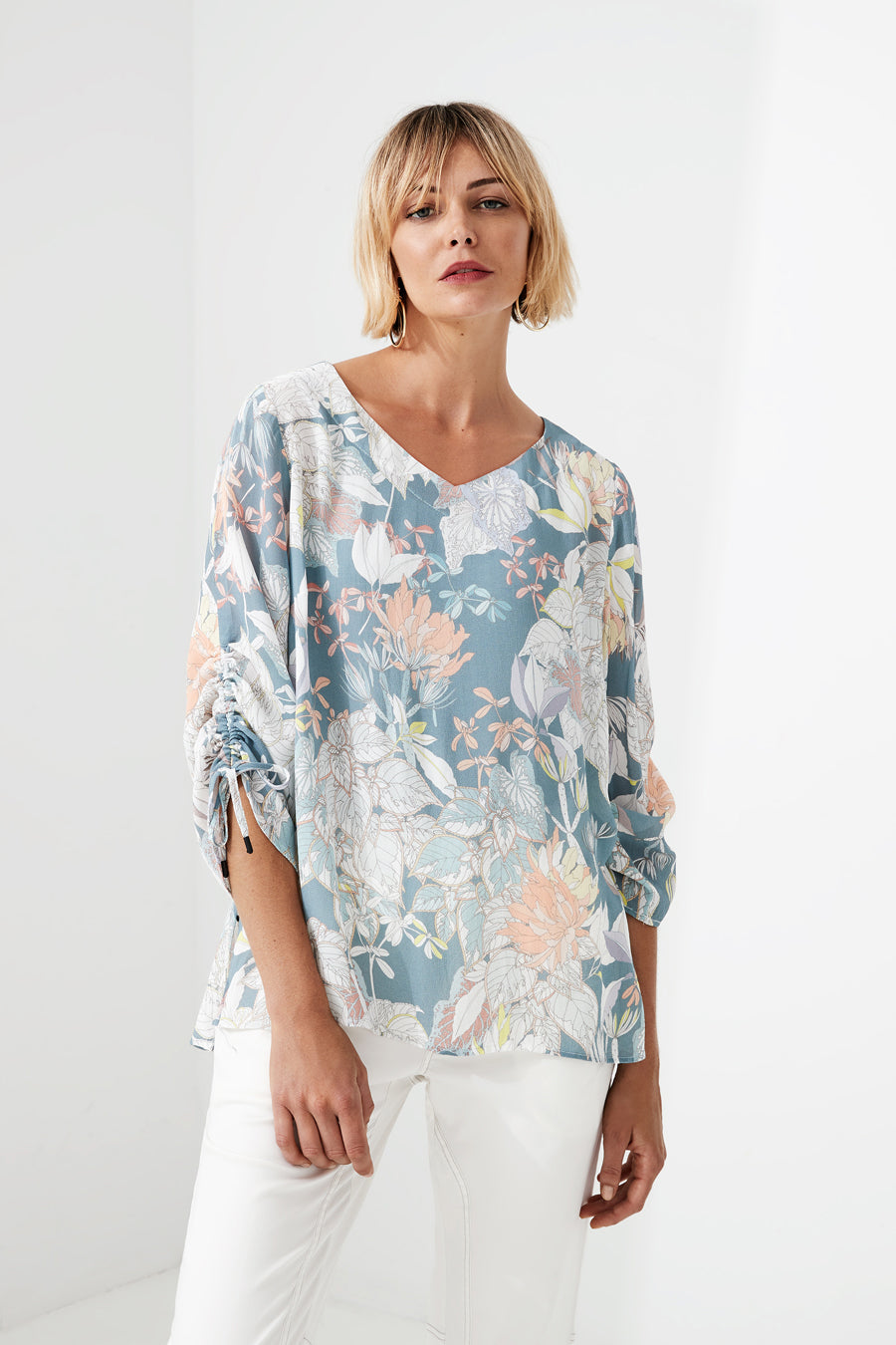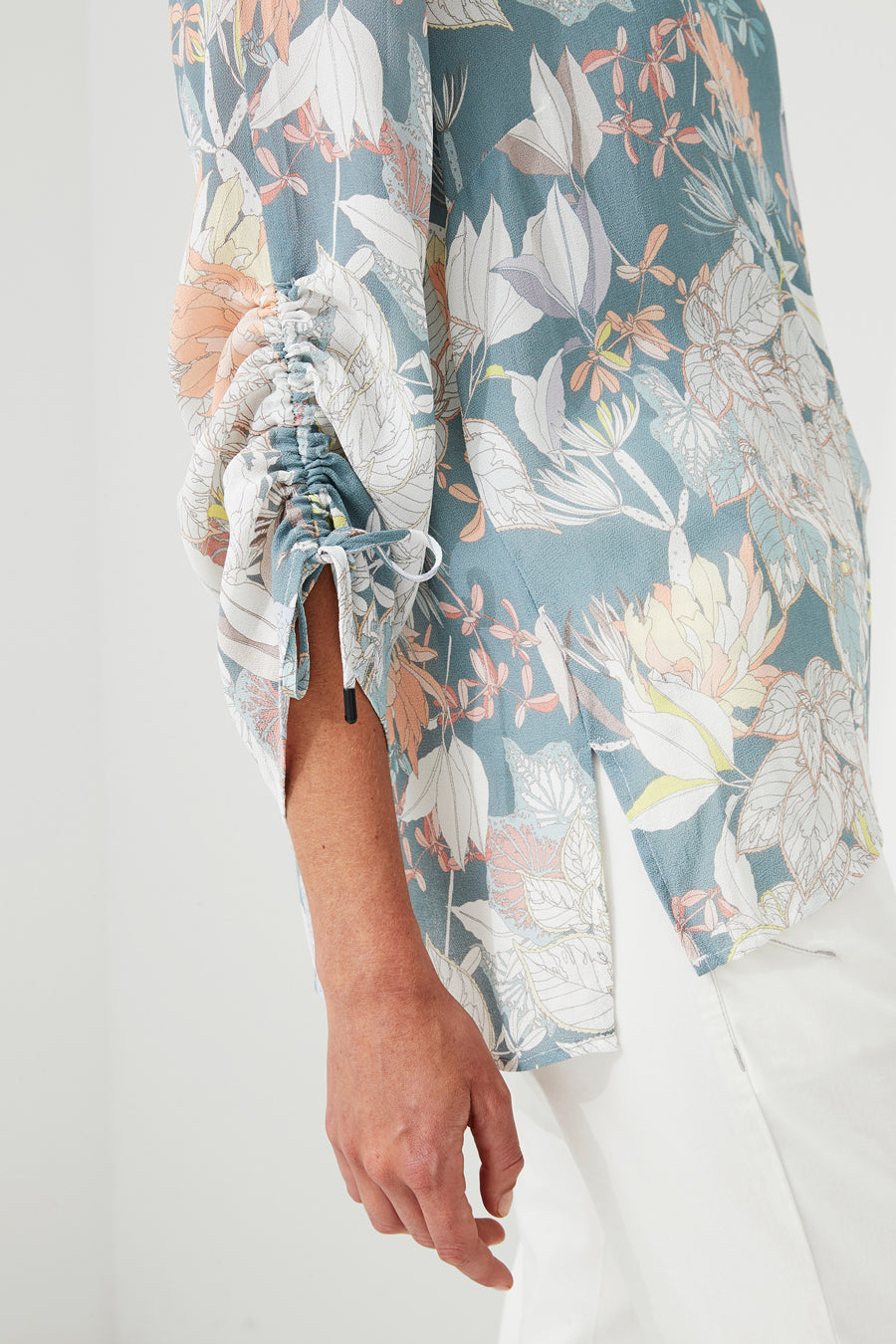 Dress yourself up in the emerson print, soft and luxurious. Delicate neckline, side hem split feature and 3/4 sleeves gathered with self ties.