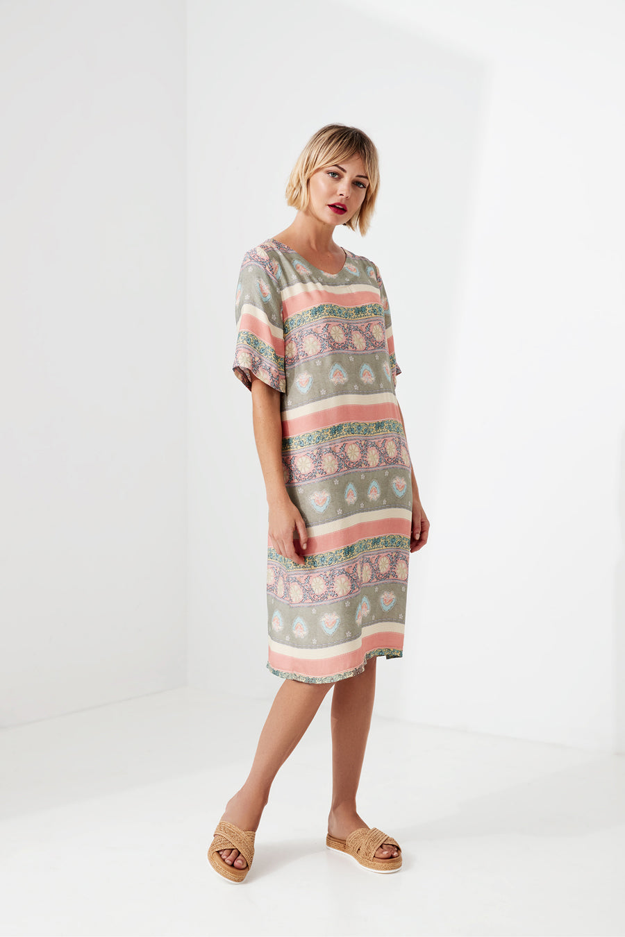 This dress features a simple floaty skirt ending at the knee with a smooth V neckline and short sleeves. The perfect pop to your wardrobe with this dazzling Knox print.