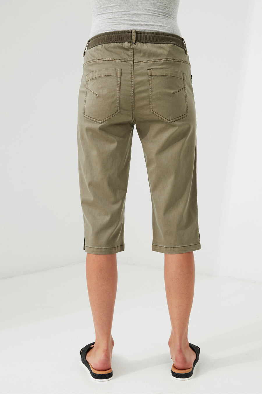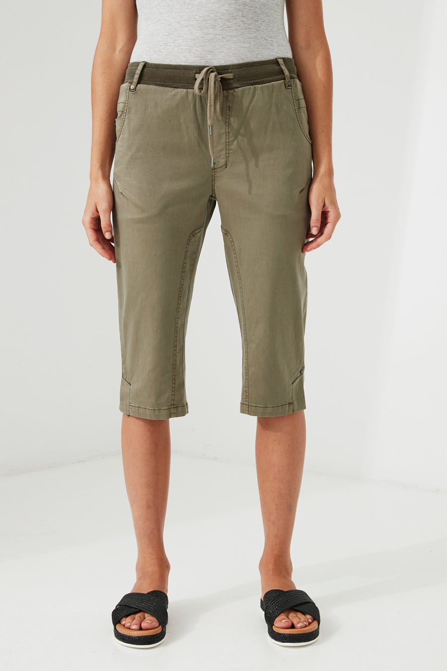 A cool casual knee length short, elastic rib waistband with drawcord, mock fly and front pockets. The soft handle and slightly distressed finish is achieved by special garment wash.
