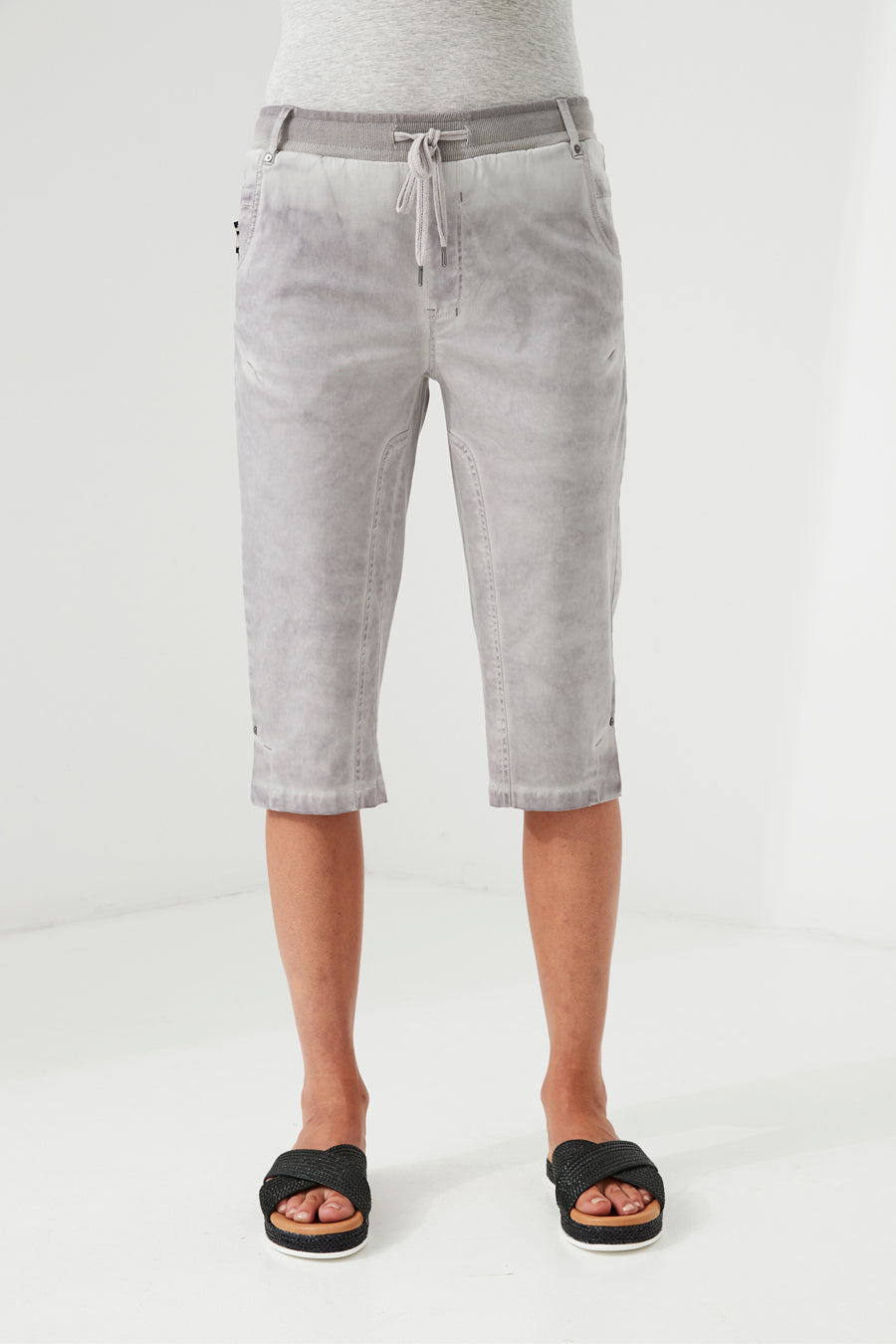 A cool casual knee length short, elastic rib waistband with drawcord, mock fly and front pockets. The soft handle and slightly distressed finish is achieved by special garment wash.