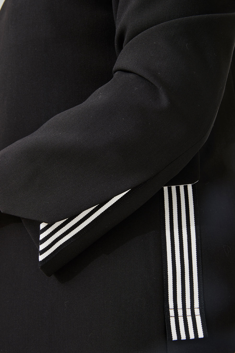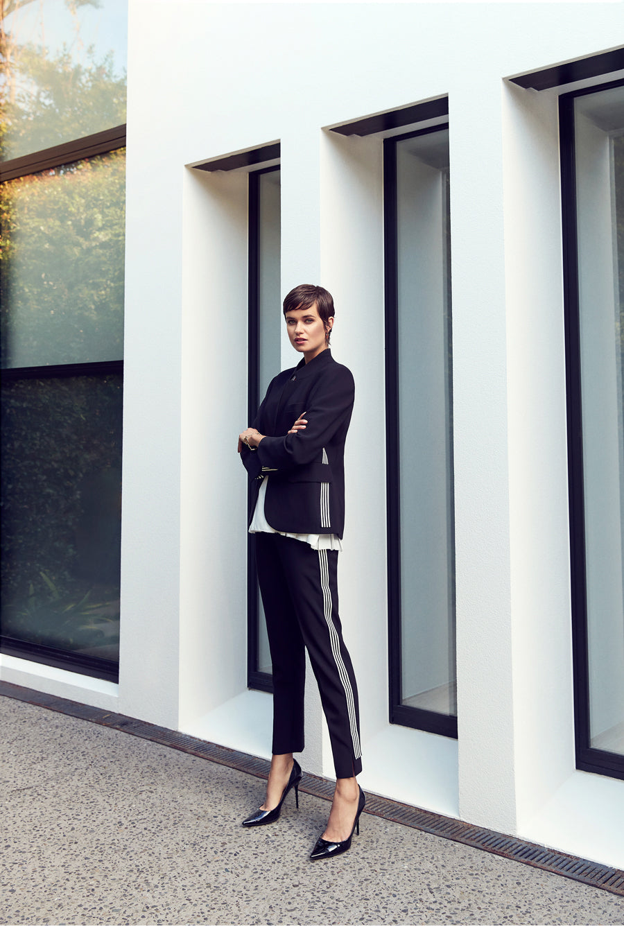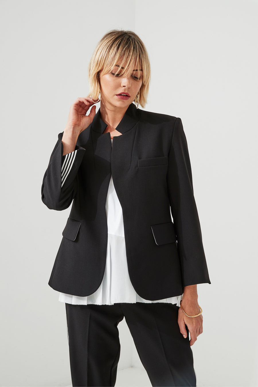 Tailored jacket, featuring novelty tape at side and sleeve placket, paired with Maize pants.