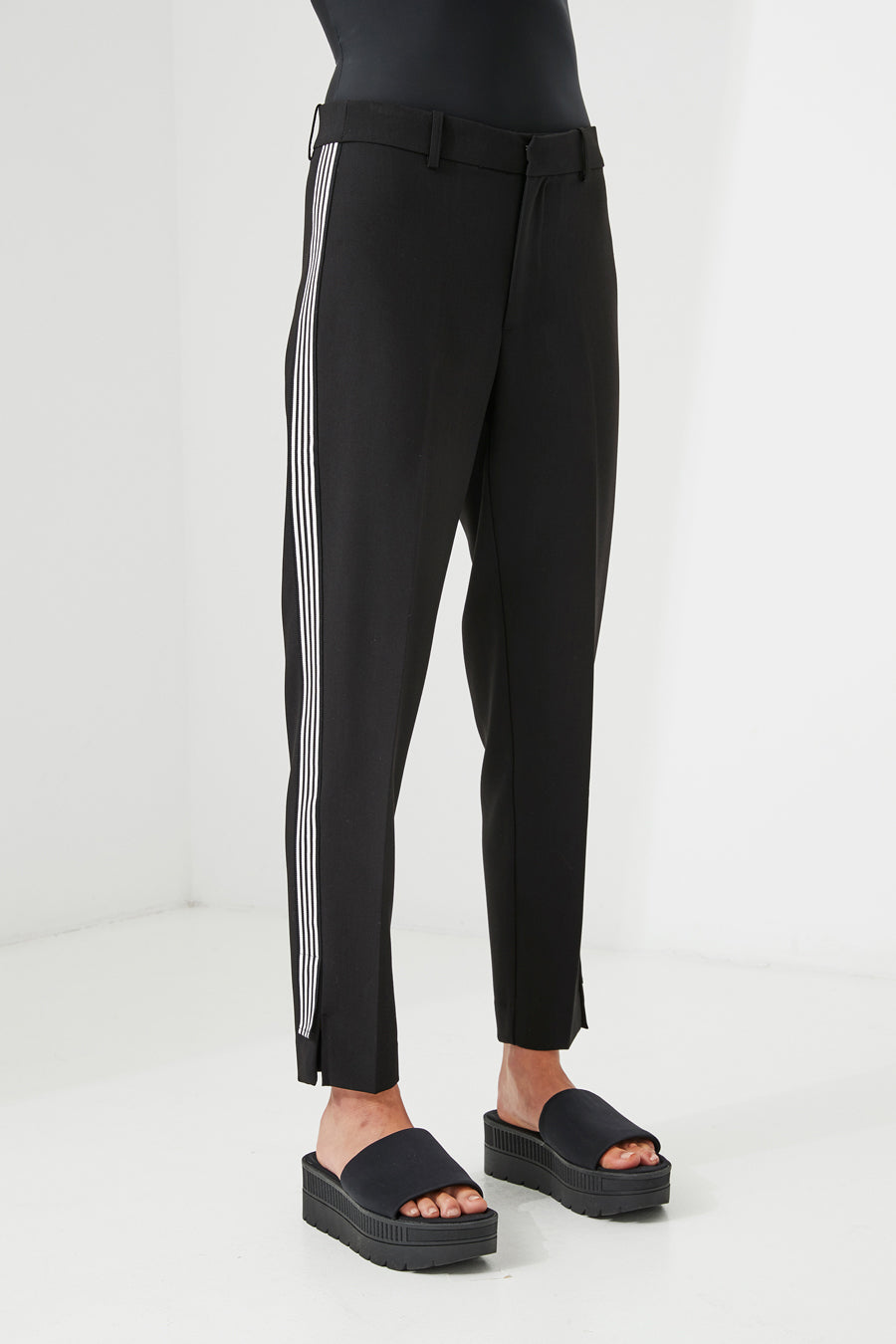 Dressy pant, slim leg, fly front with hem split, featuring novelty tape on outer leg, and our extra comfort waistband.
