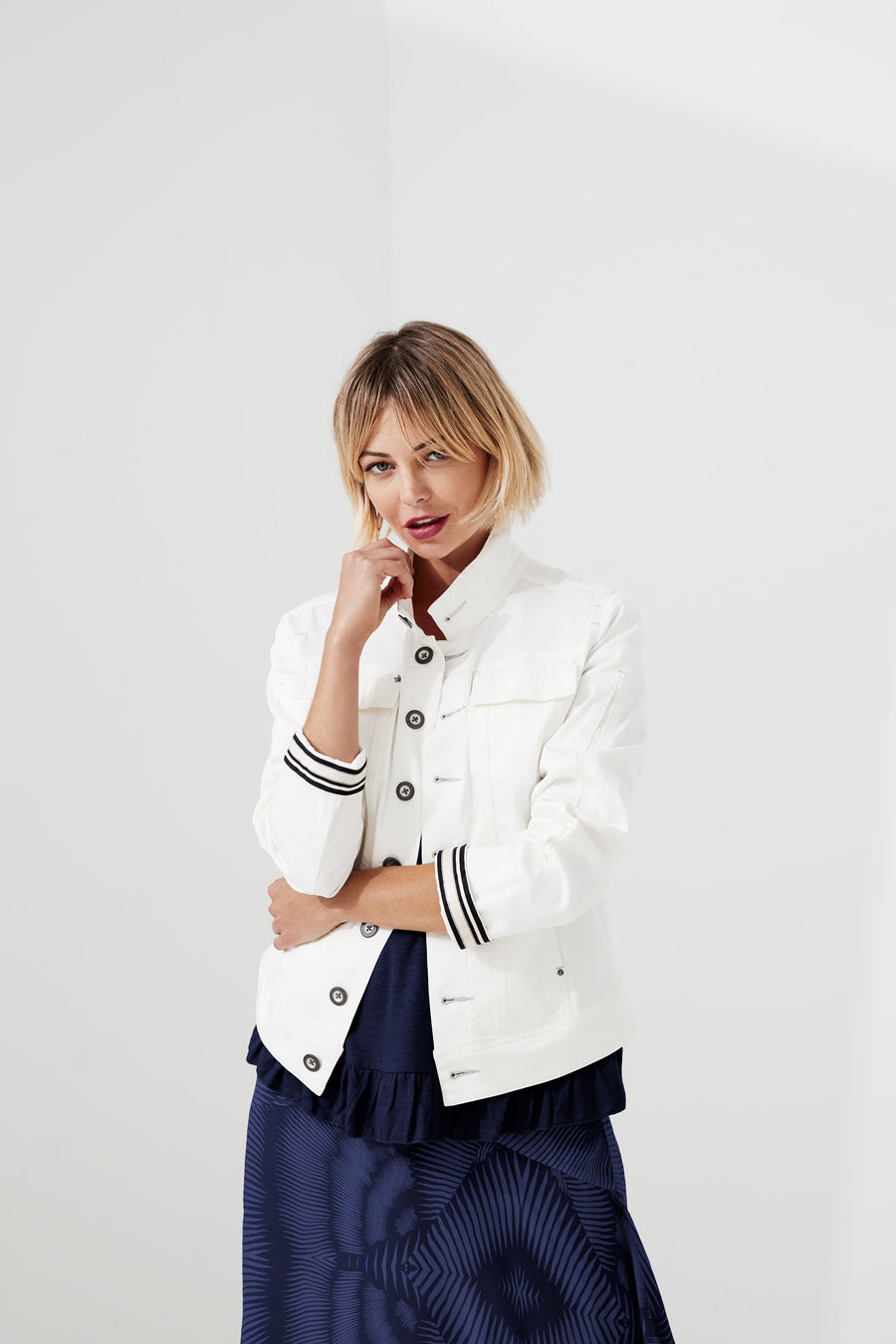 Our spring essential, soft cotton modal jacket, super stretch comfort with flattering silhouette, with hardware features and stripe cuff detail.