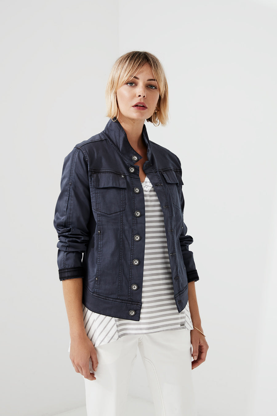 Our spring essential, soft cotton modal jacket, super stretch comfort with flattering silhouette, with hardware features and stripe cuff detail.