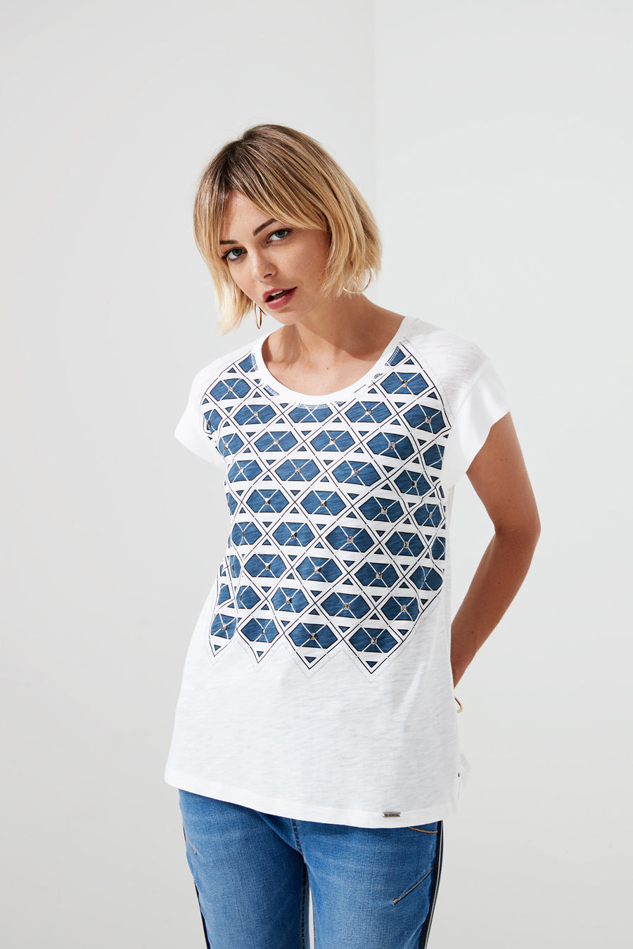 An essential soft stretch cotton blend tee, scooped neck, cap sleeve, with screen print and embellishment on front.