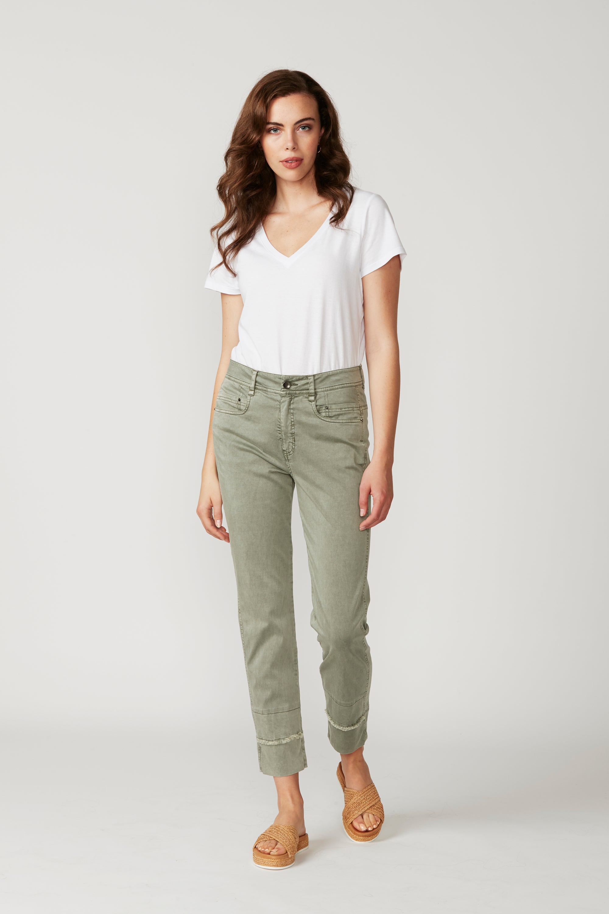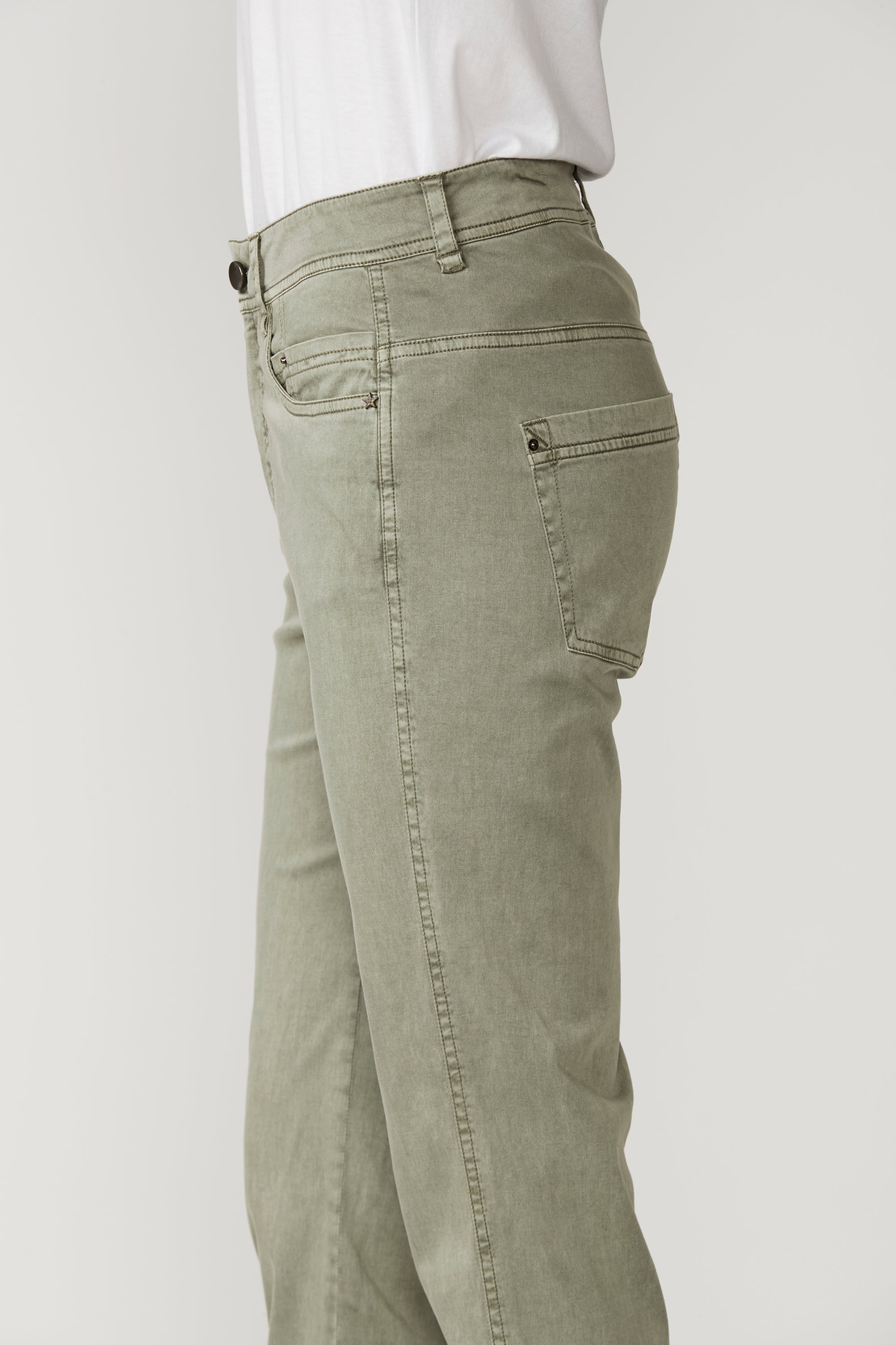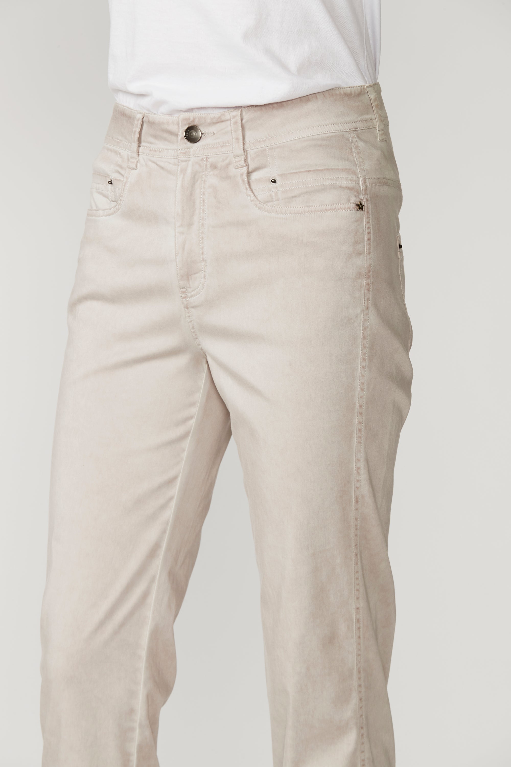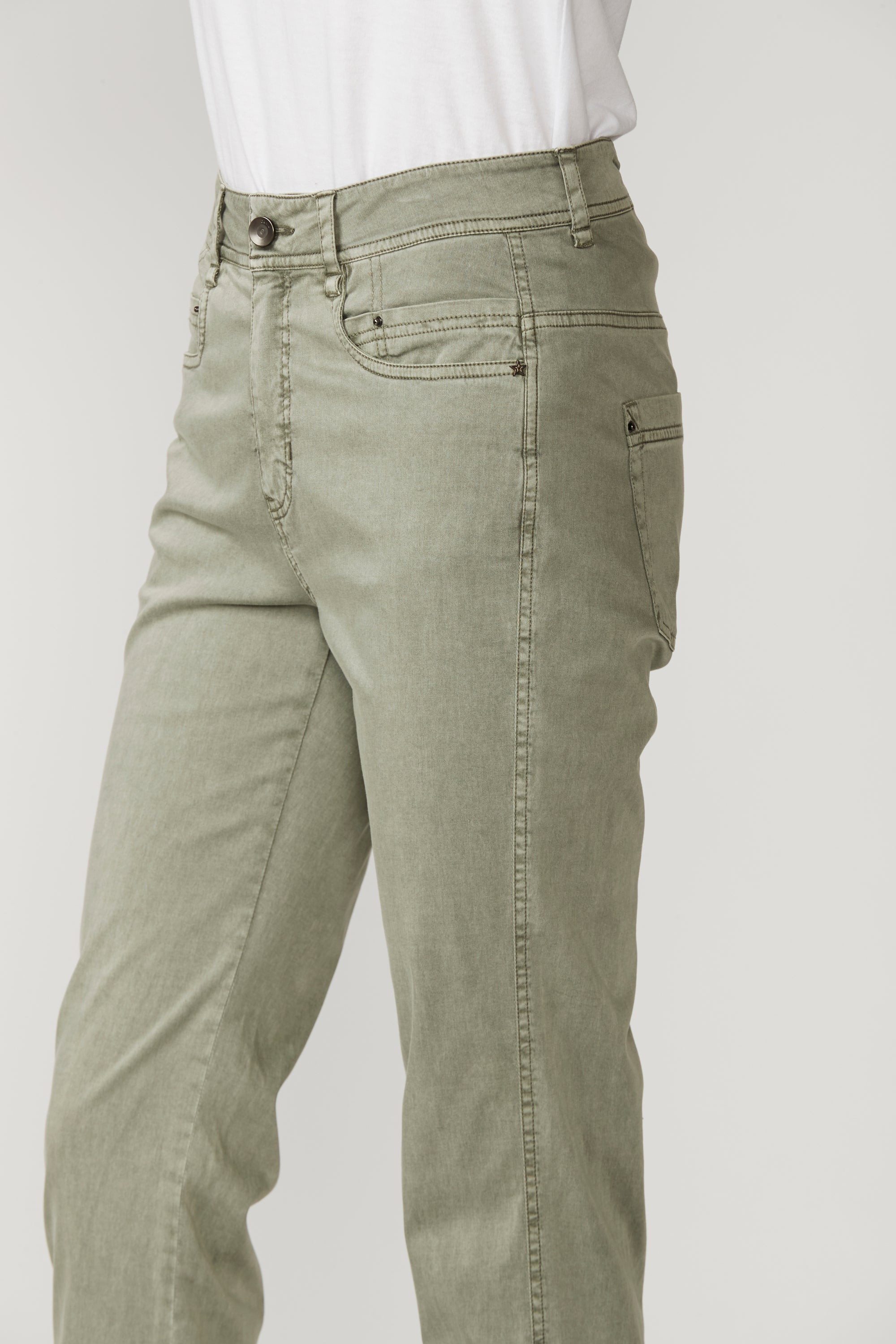 Casual jean style pant with fly front, hardware and 5 pockets. The frayed detailing at the hem panel means this pant pairs nicely with the Utility Jacket. The soft handle and slightly distressed finish is achieved by special garment wash. Can be worn with cuff rolled or unrolled.