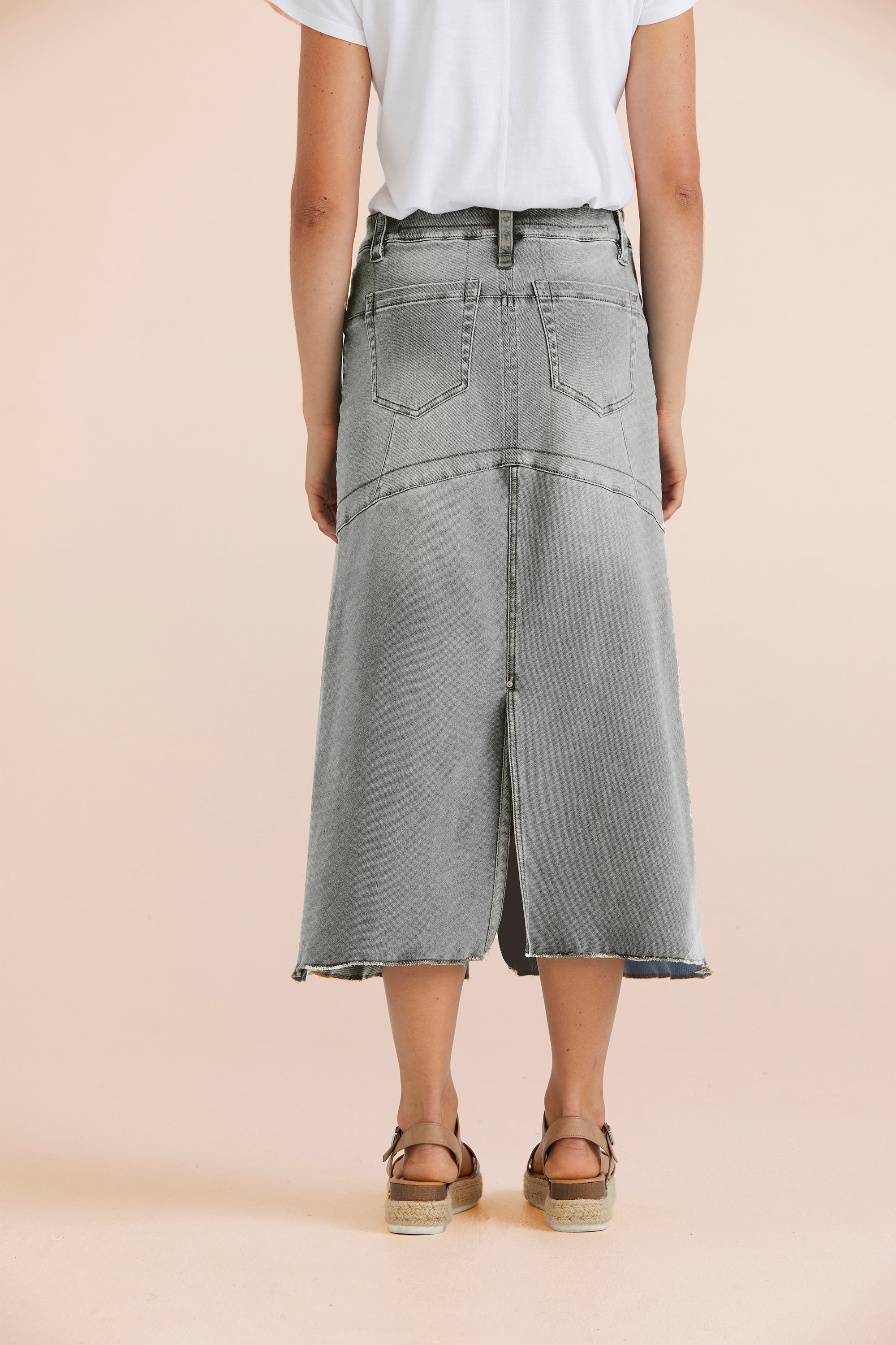 Elevate your denim collection with the Abby Skirt, a midi-length design that combines classic styling with thoughtful detail. Embroidery around the pocket adds a subtle statement, while the bias-cut lower skirt and centre back split, crafted in soft stretch denim, offer a flattering fit with ease of movement.