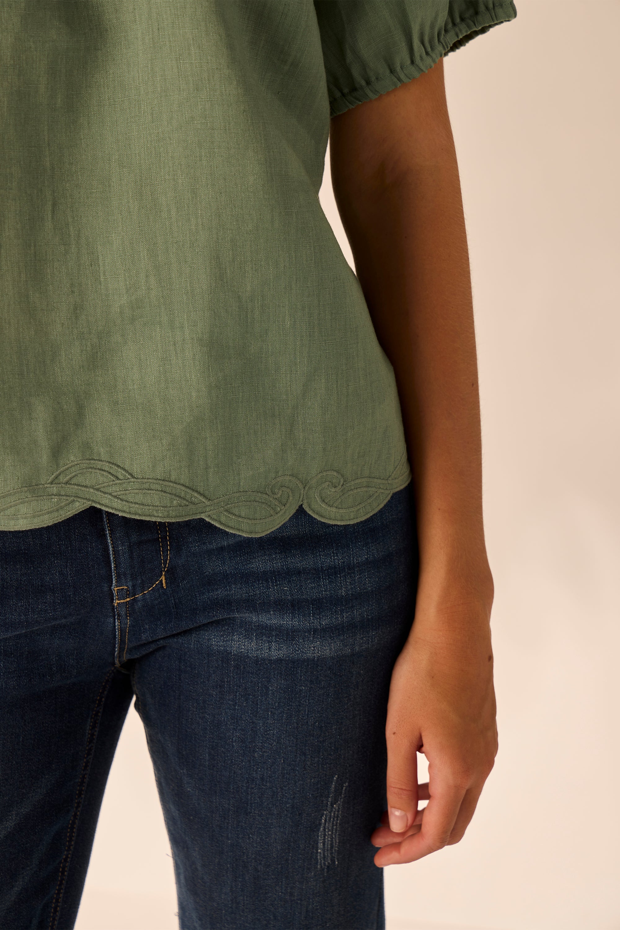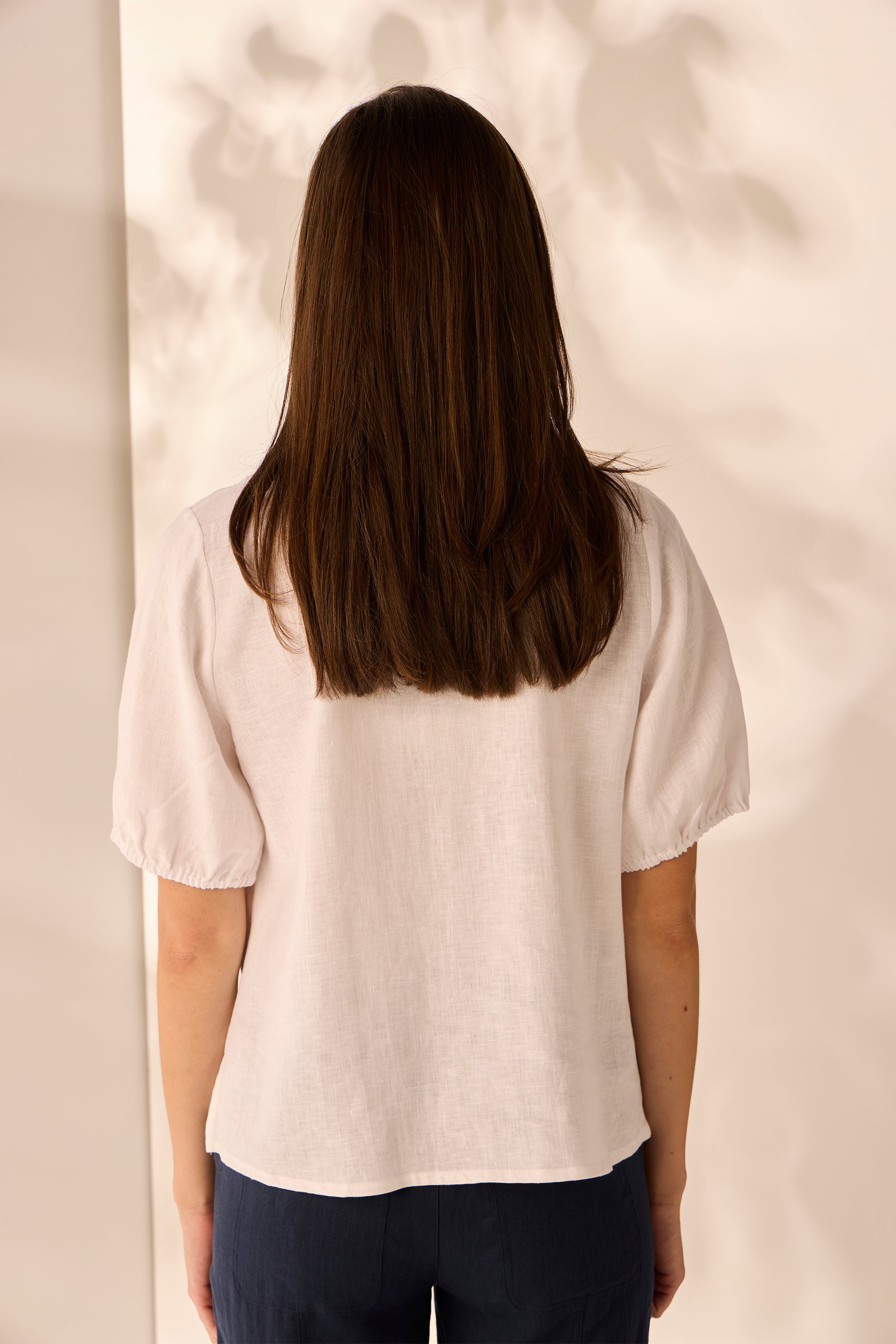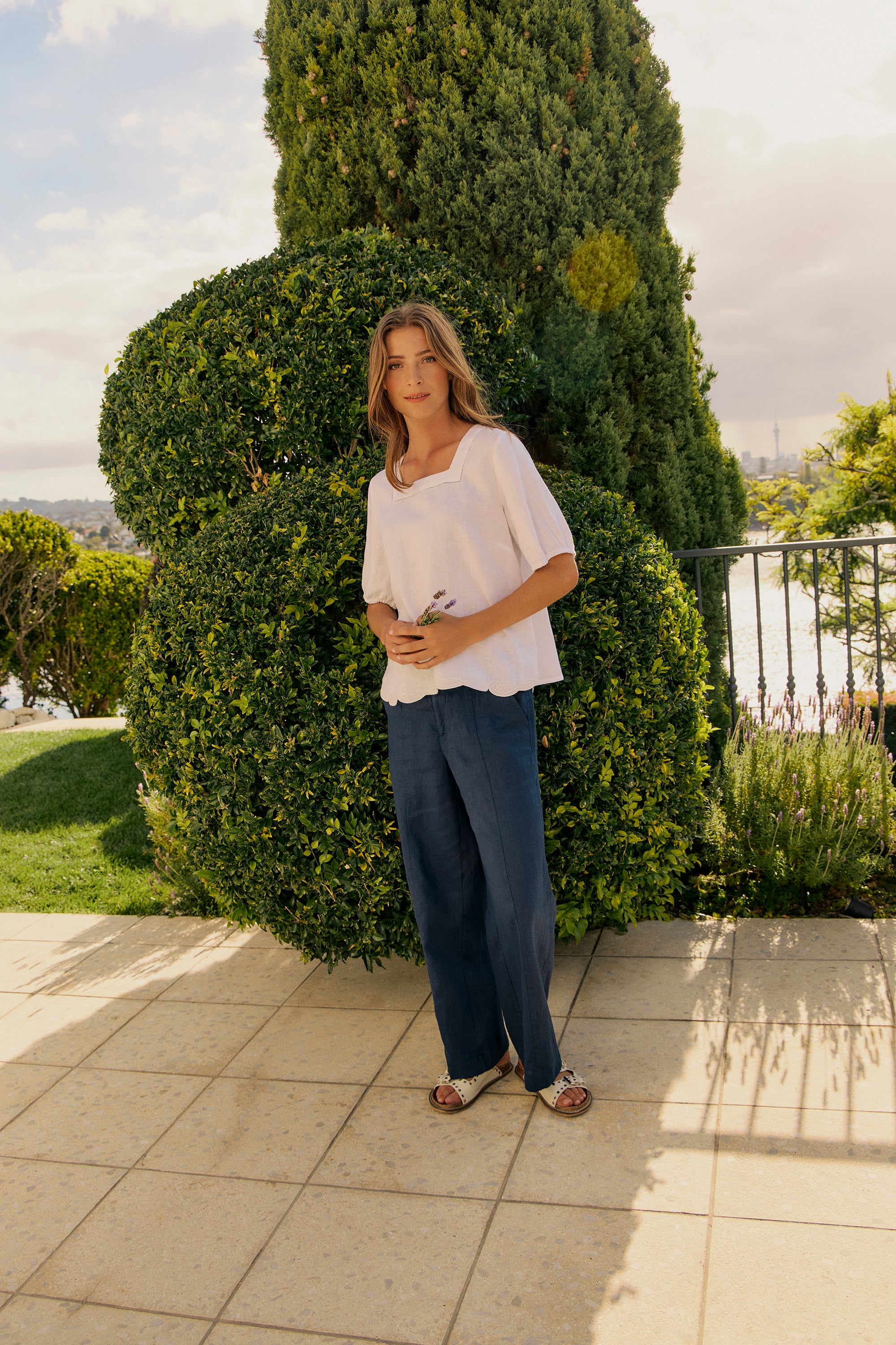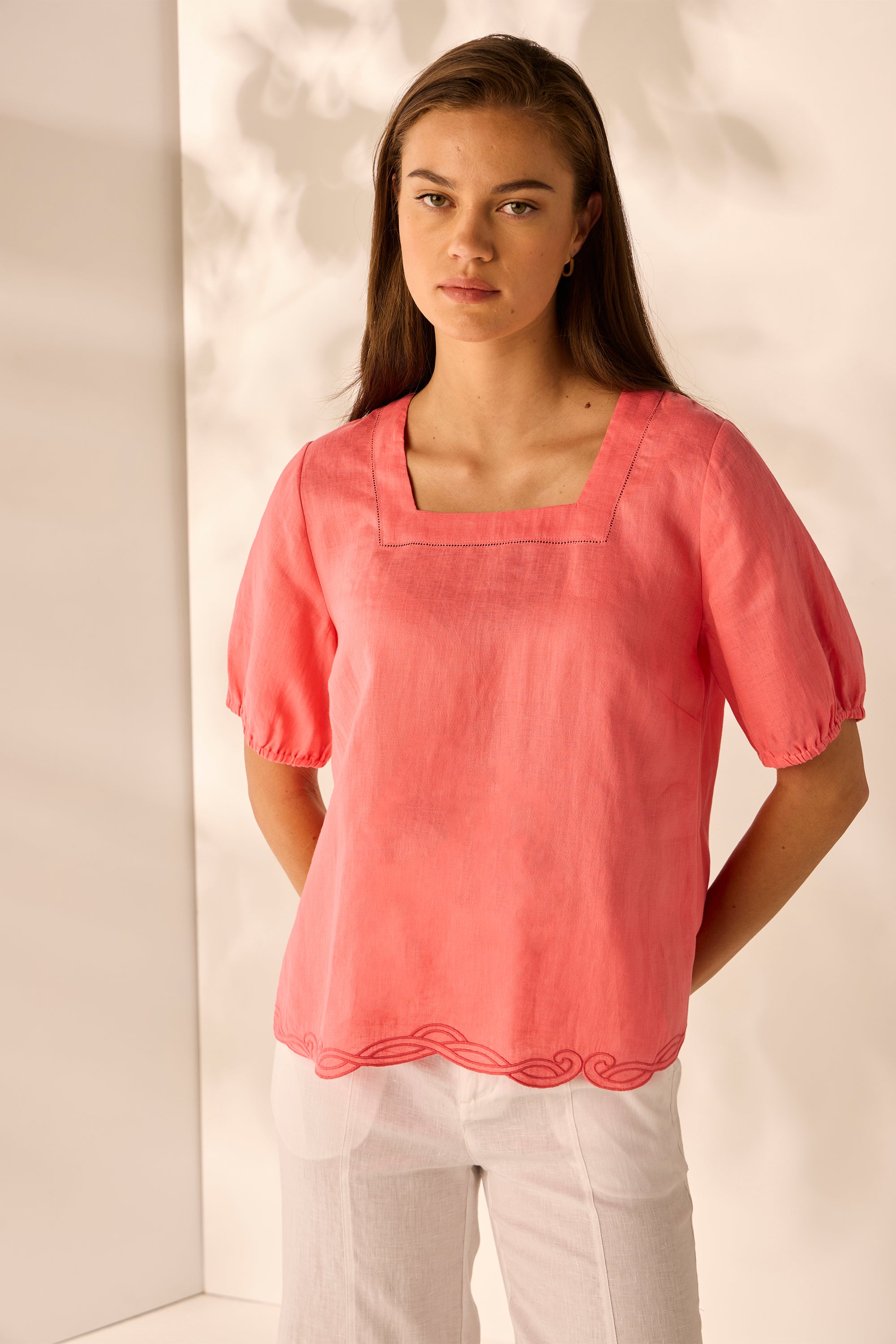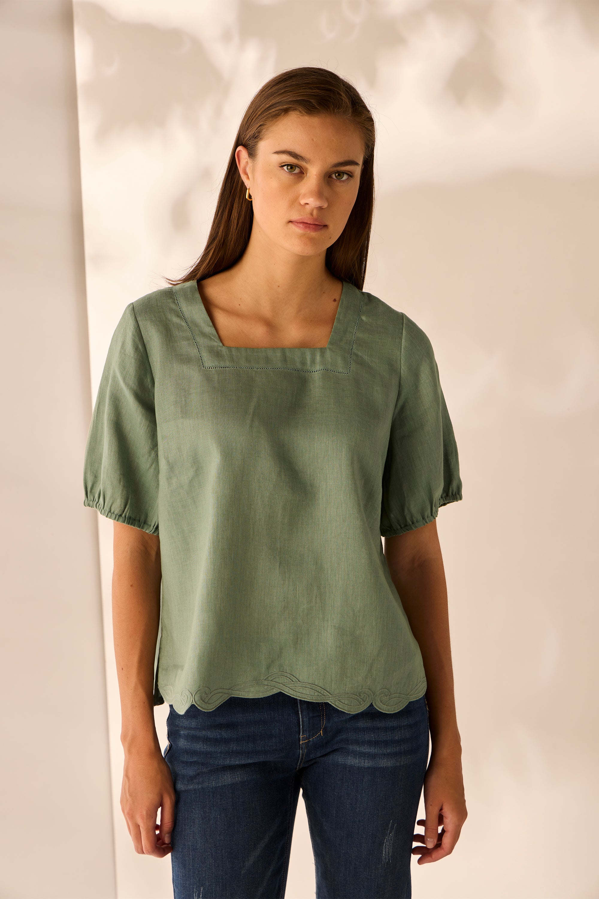 A delicate lace embroidery mirroring the square neckline creating a feminine vibe on the Marlo Top. A soft embroidery design along hemline balance out the elasticated sleeves. Pair with any linen bottoms or jeans for an elevated look.