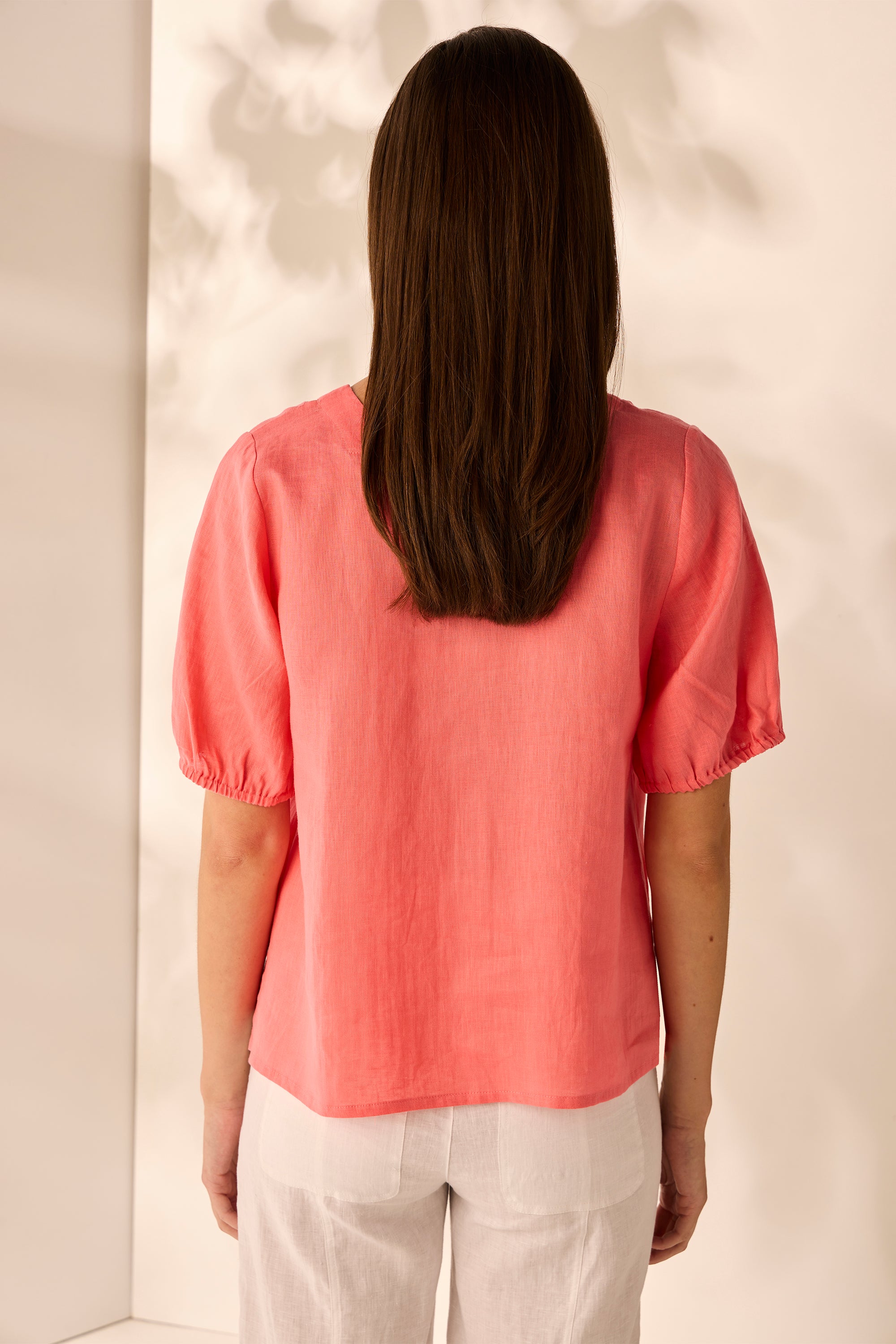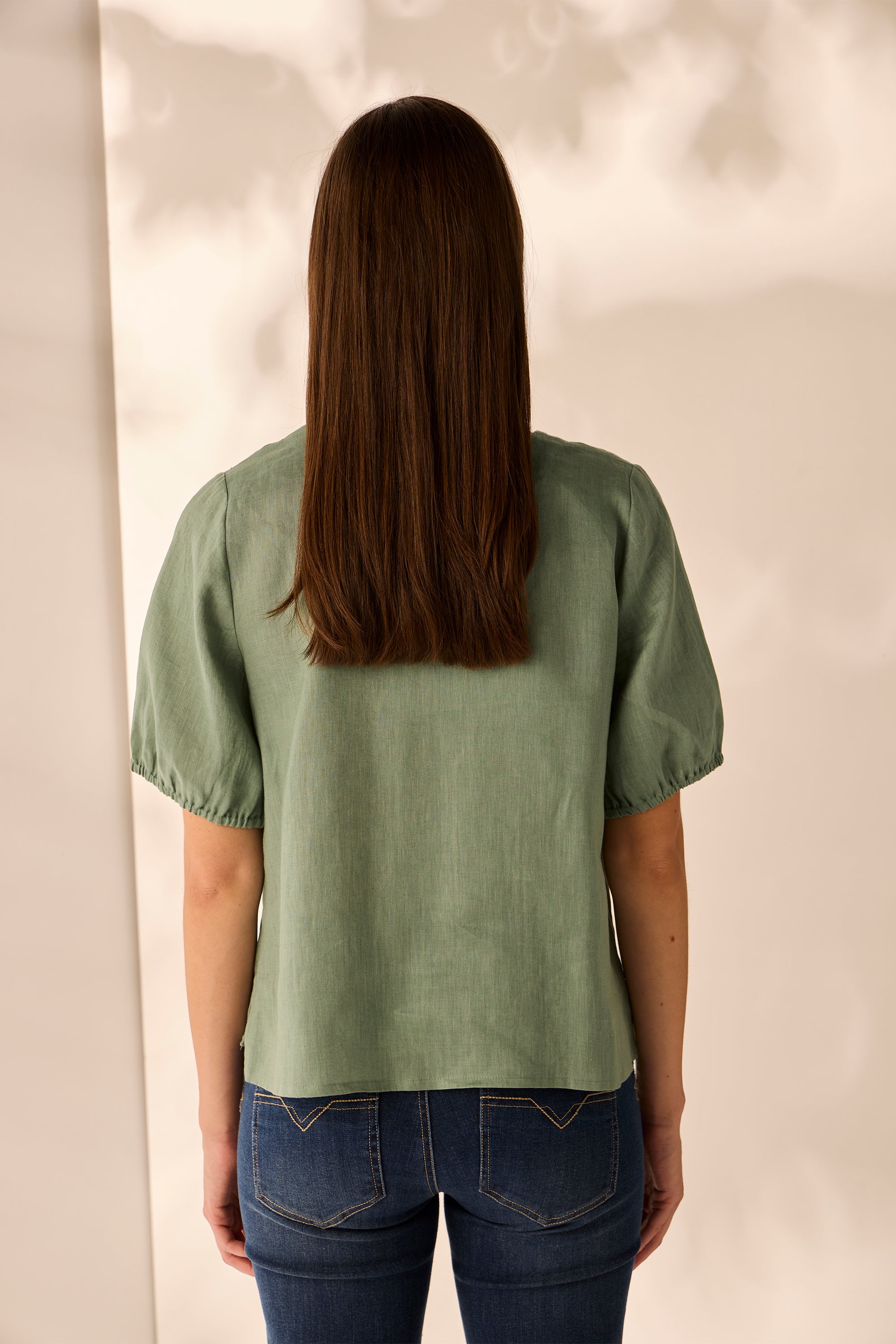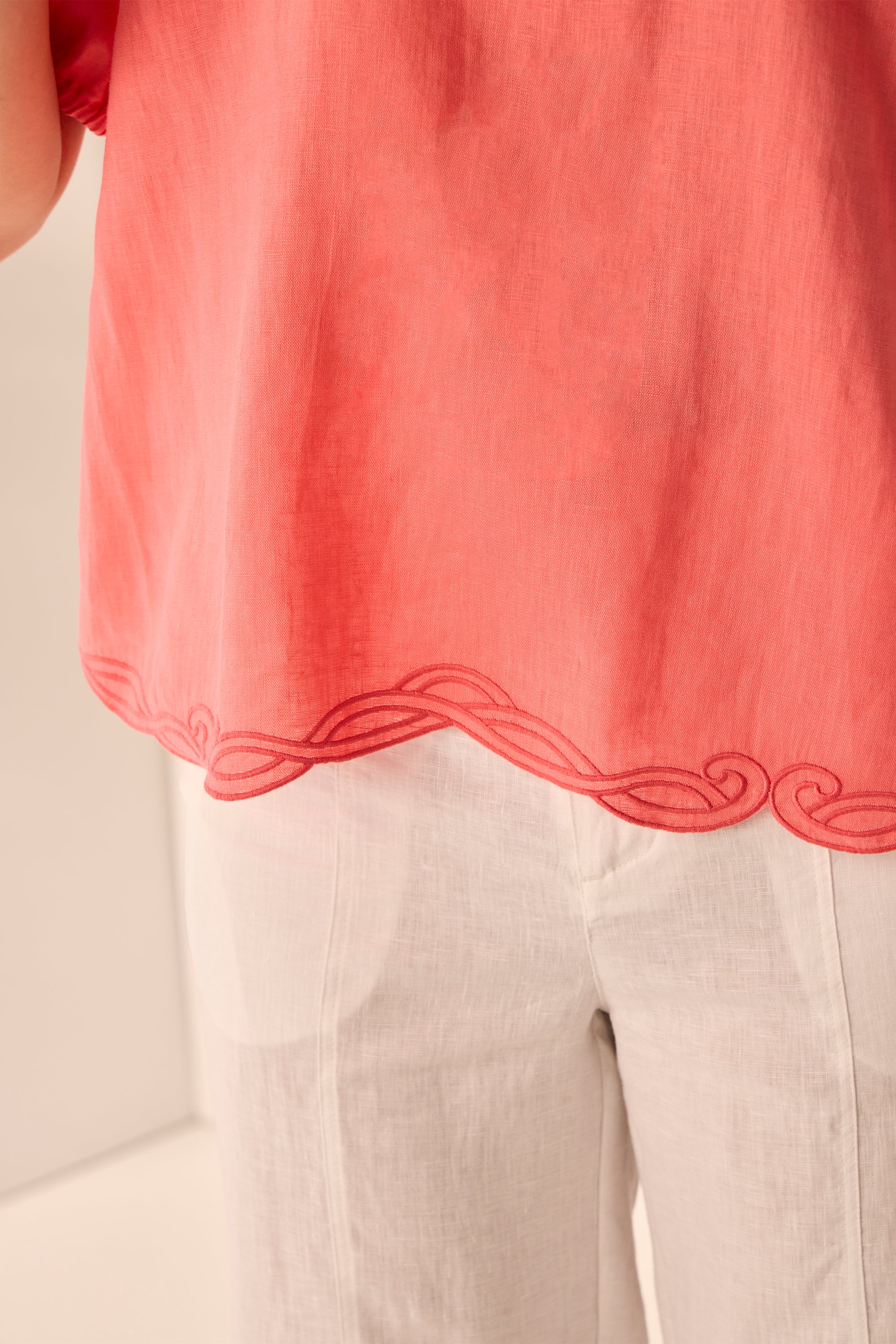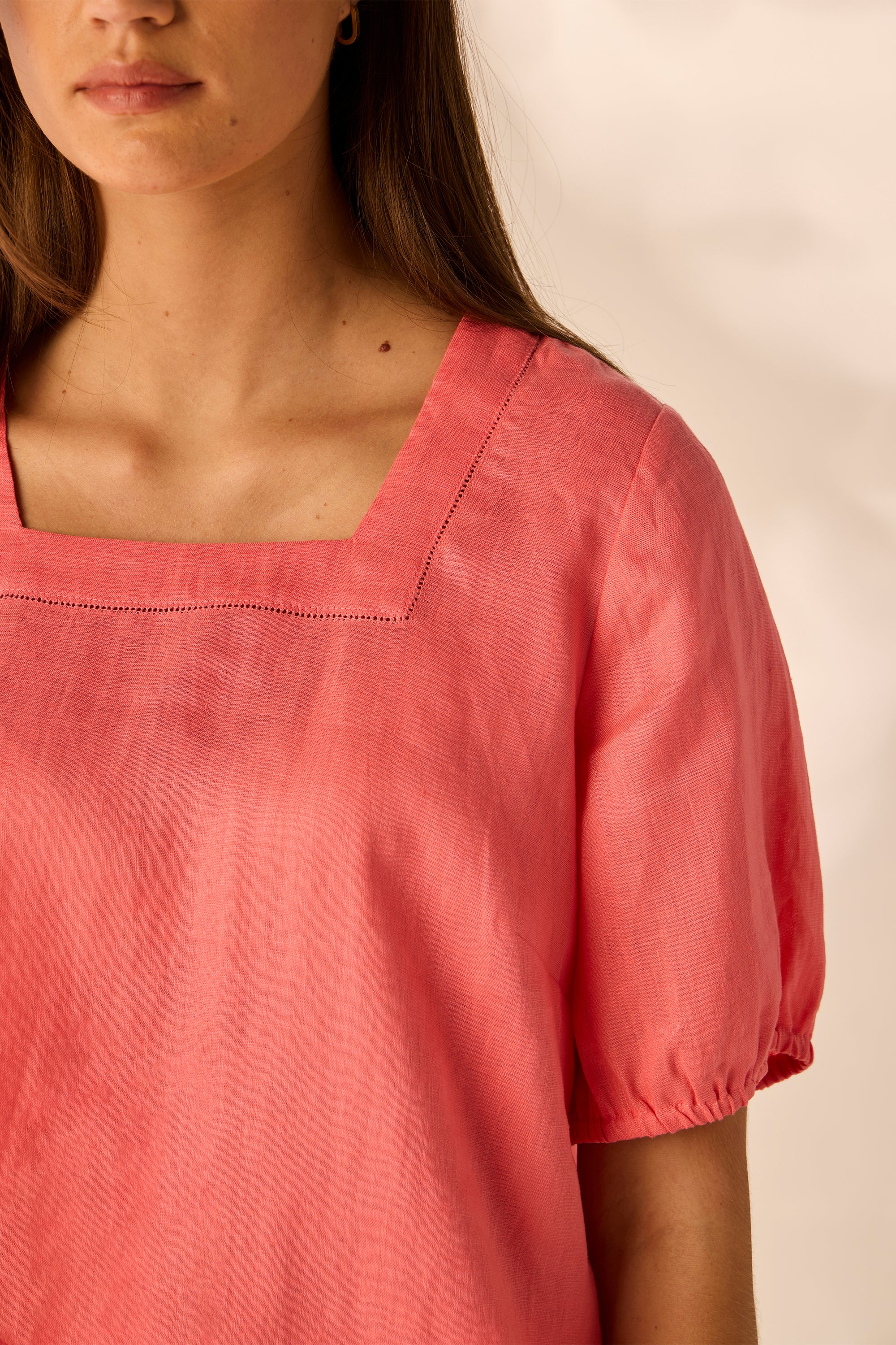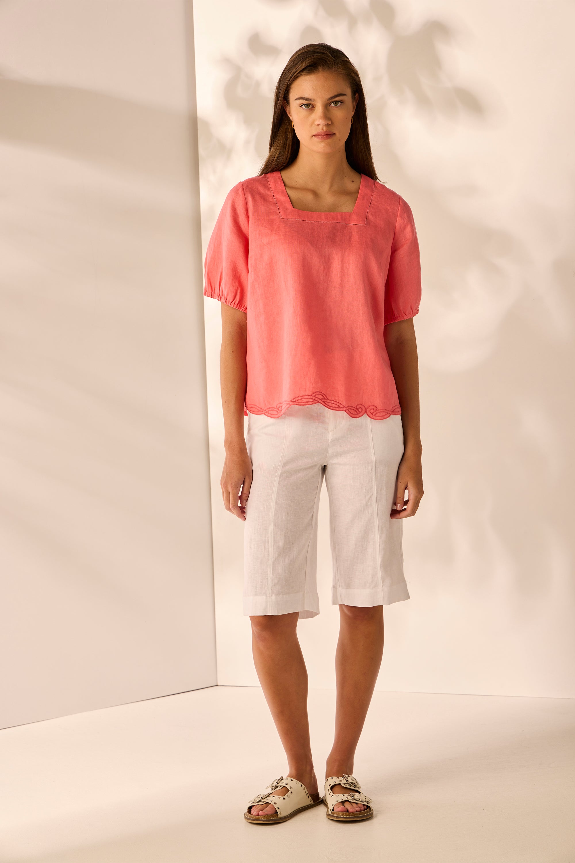 A delicate lace embroidery mirroring the square neckline creating a feminine vibe on the Marlo Top. A soft embroidery design along hemline balance out the elasticated sleeves. Pair with any linen bottoms or jeans for an elevated look.