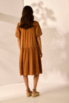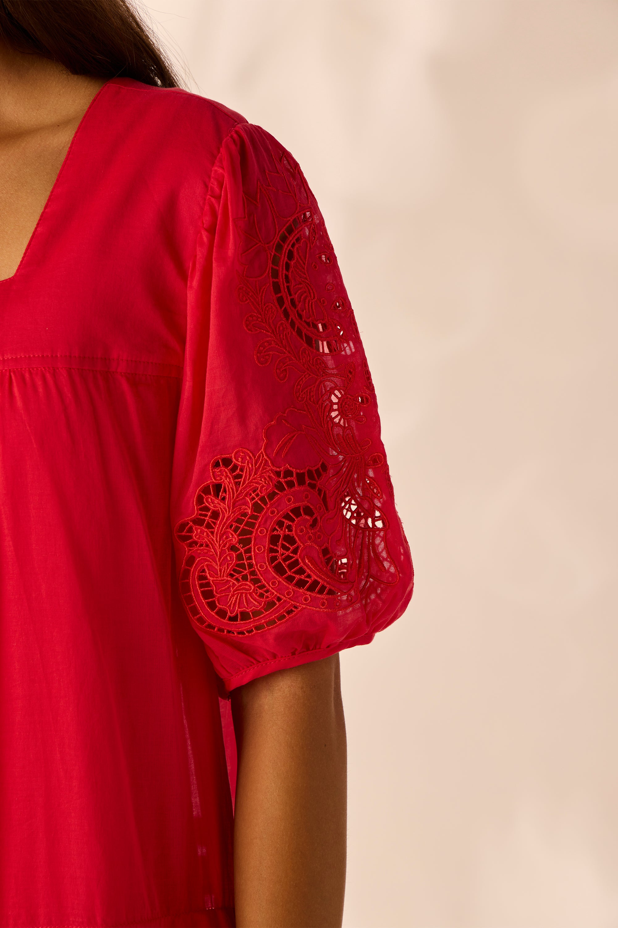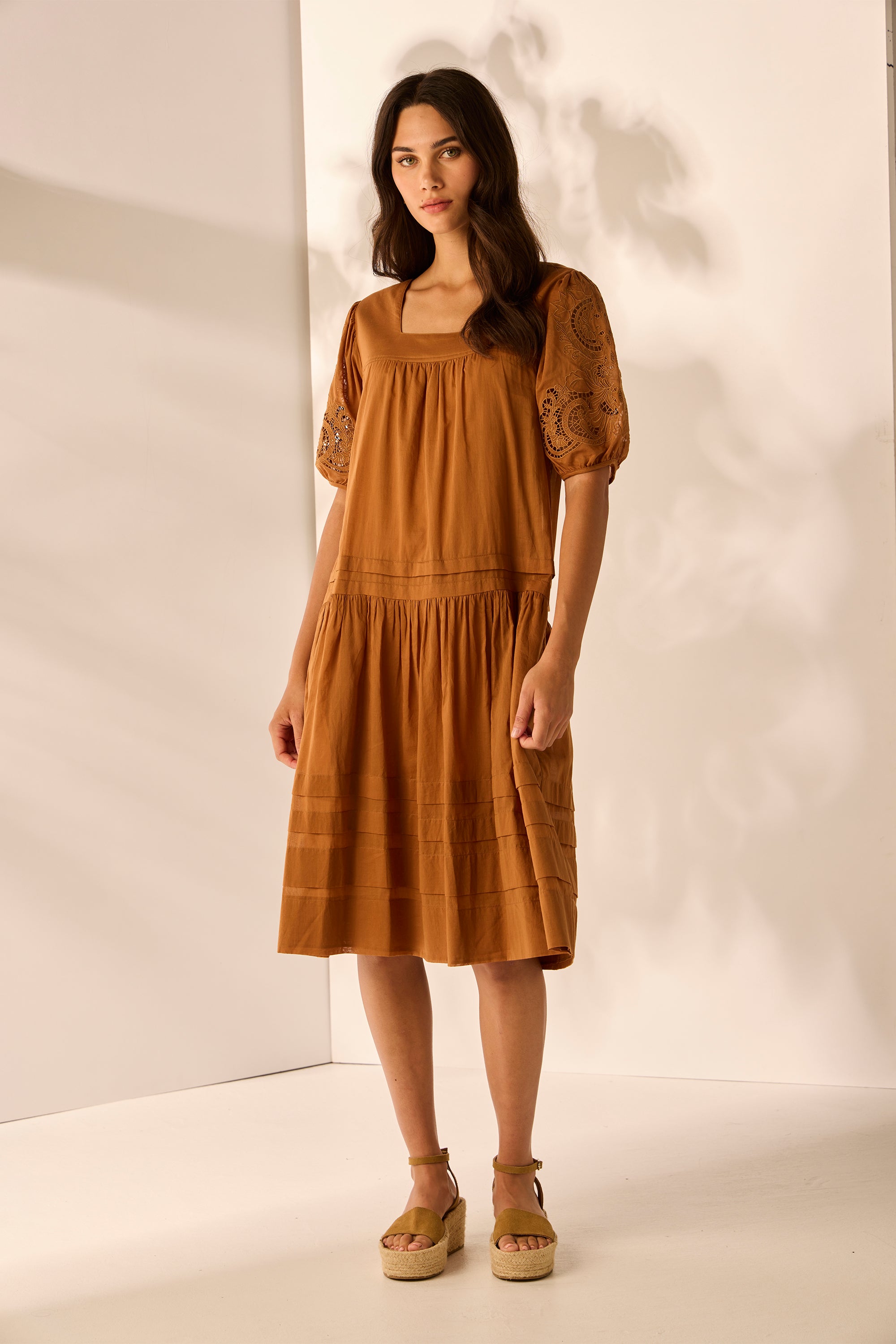 A relaxed fit dress, with a square neckline which is balanced with the tuck detailing around the waist and skirt hem. The cut-out embroidery on the sleeve adds a elegance touch to the dress. Gathered panels adds a beautiful flare to this flattering silhouette, making it the perfect summer occasion dress.