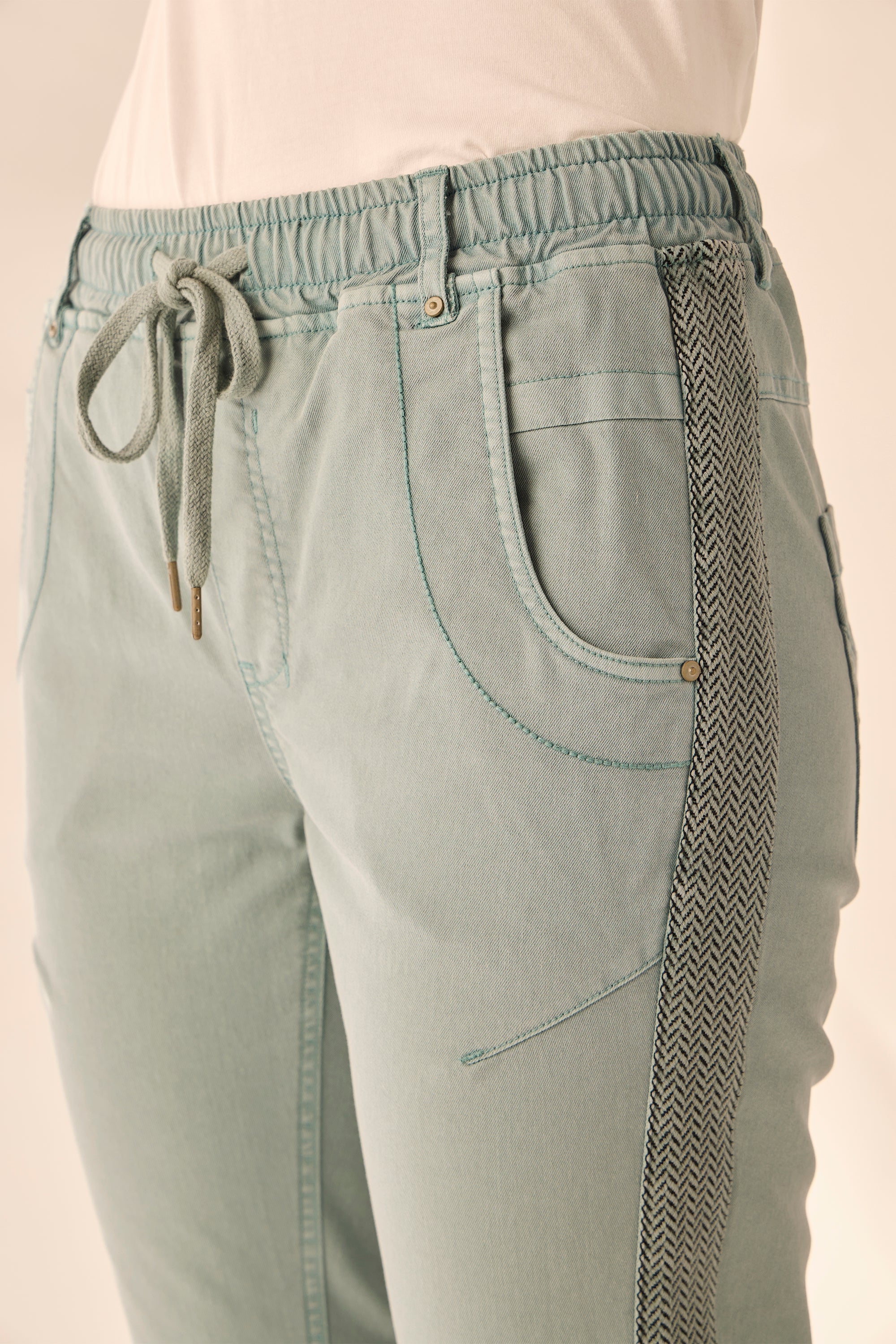 Casual jeans with an elasticated waist and adjustable drawstring tie. Soft handle and distressed finish are created by special garment wash.