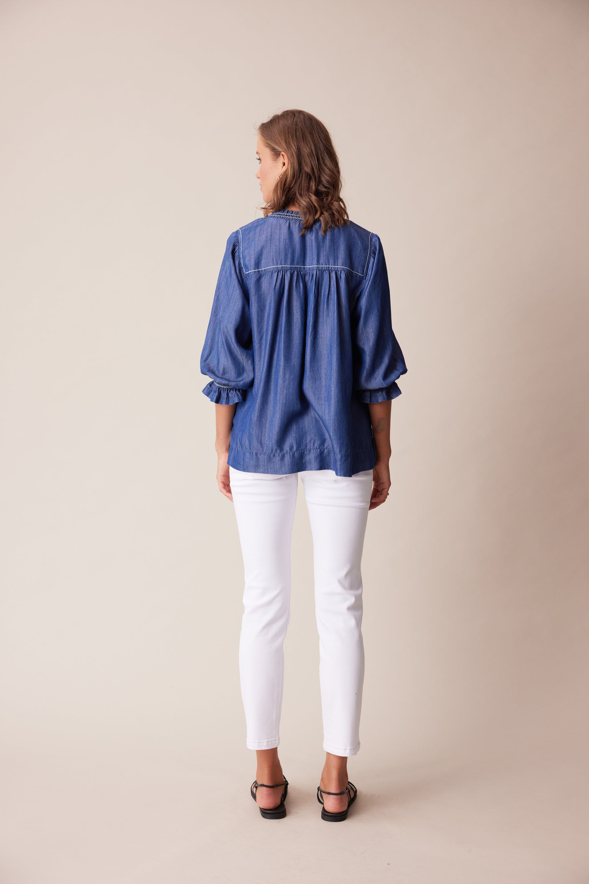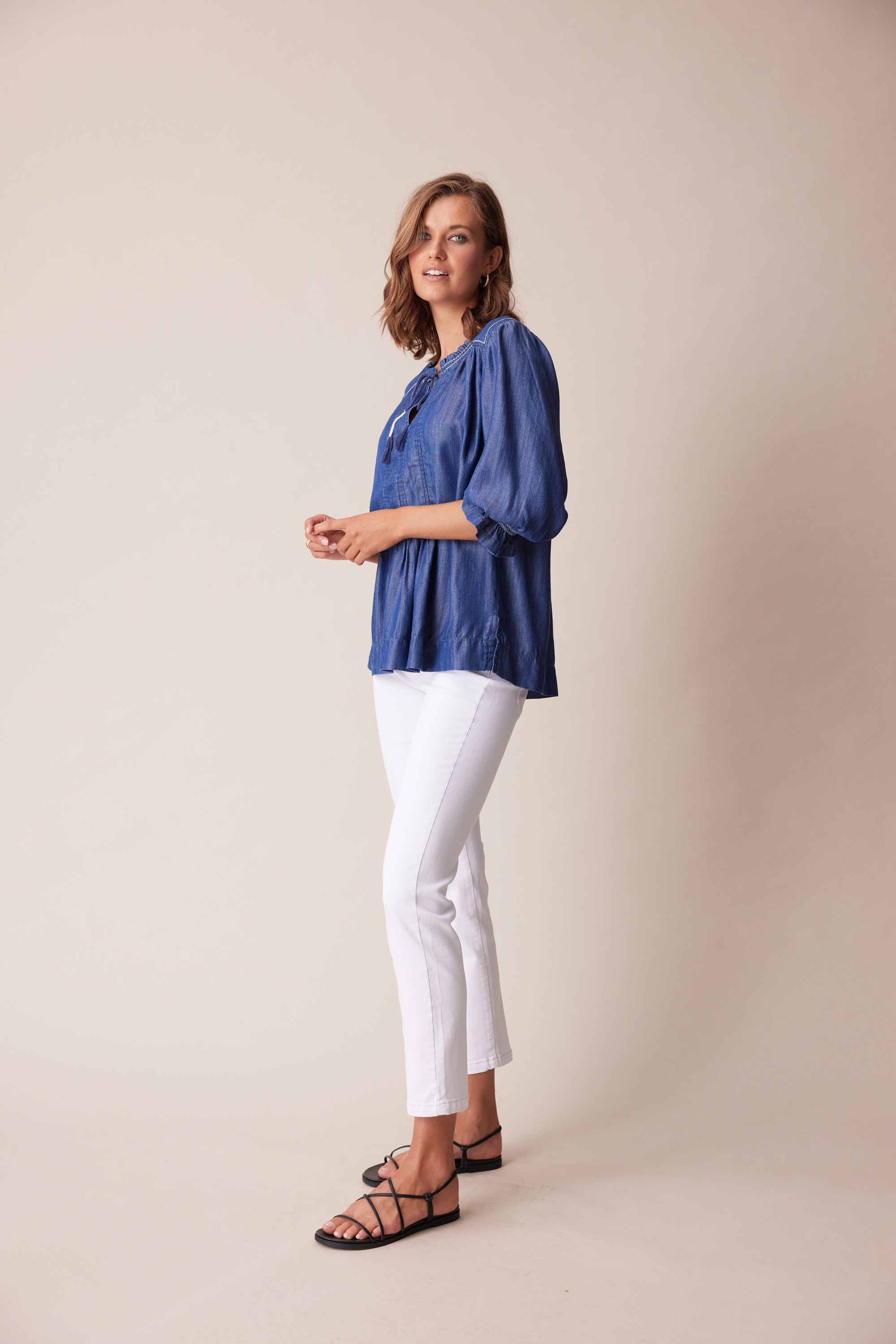 An easy fit 3/4 sleeve top crafted in lightweight lyocell – featuring shirred collar and cuffs, contrast embroidery stitch, and corded neck ties with tassels. The faux front placket has a subtle split opening at the neck. Gathering through the bodice and sleeve add a soft fluidity through the body.