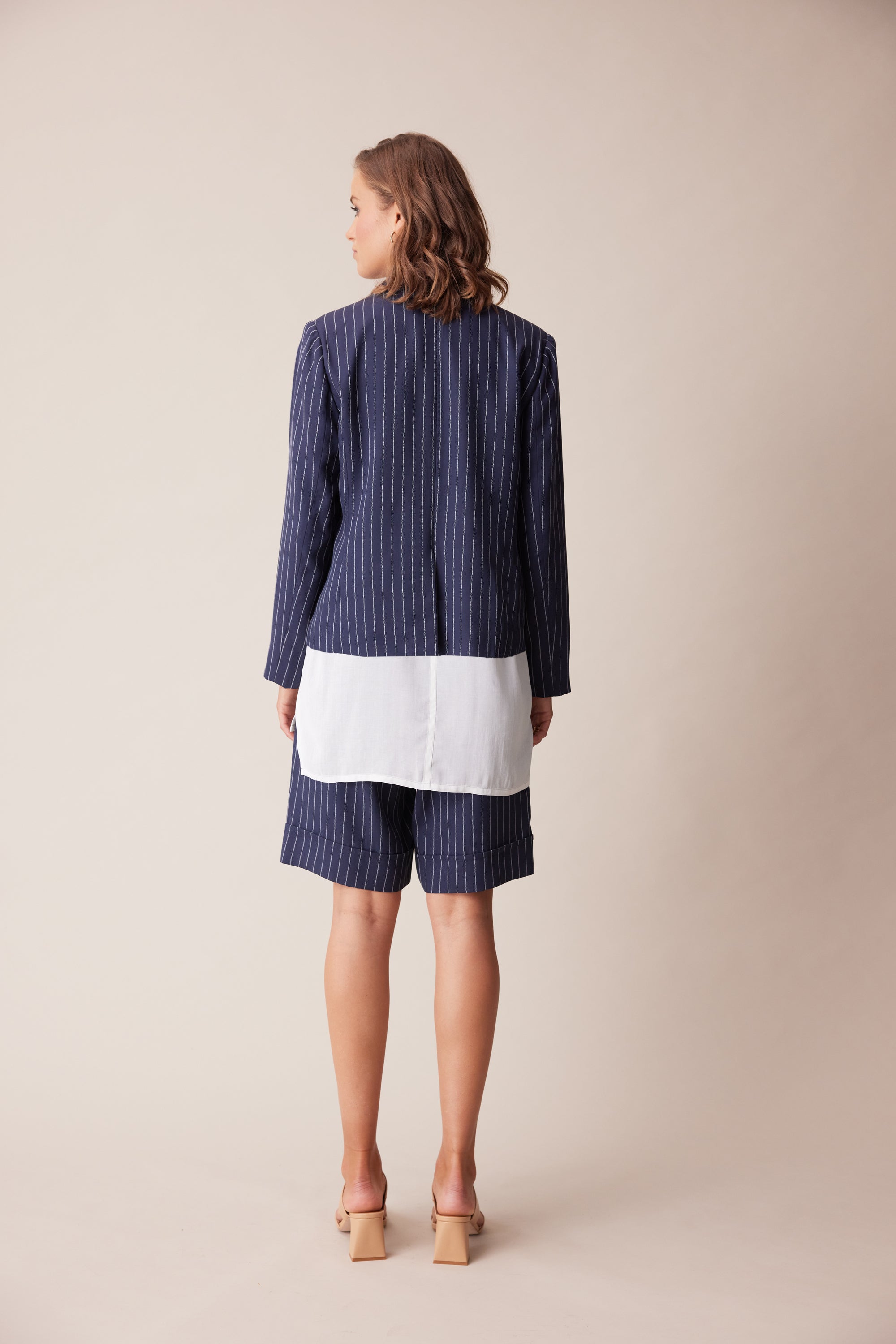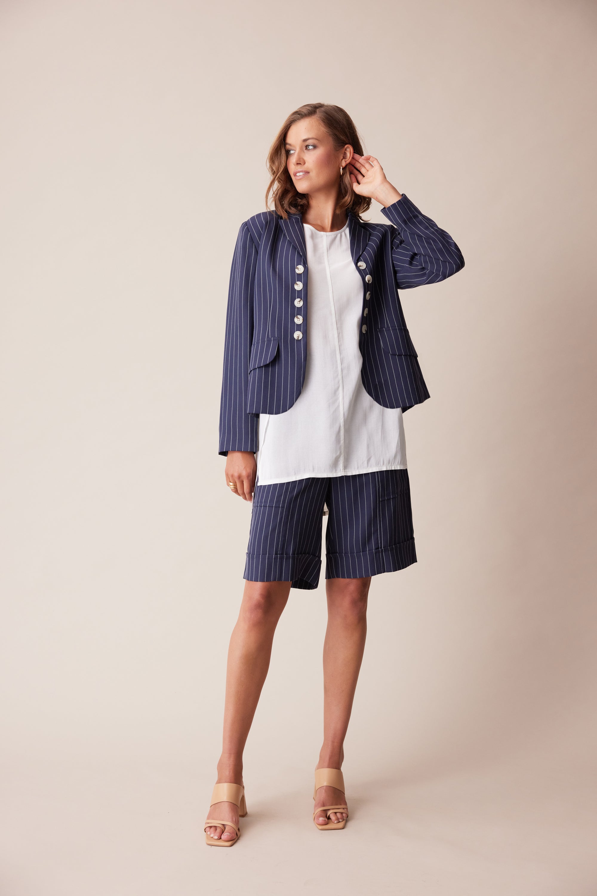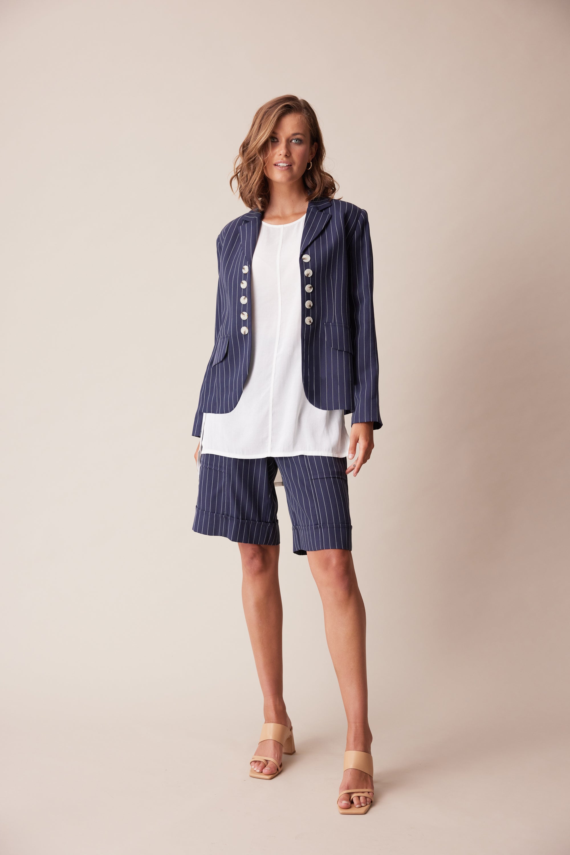 A cropped length tailored jacket in stripe suiting - features centre front decorative button detailing, faux flap pockets and centre back vent. This elegant jacket fits beautifully over our occasion dresses.