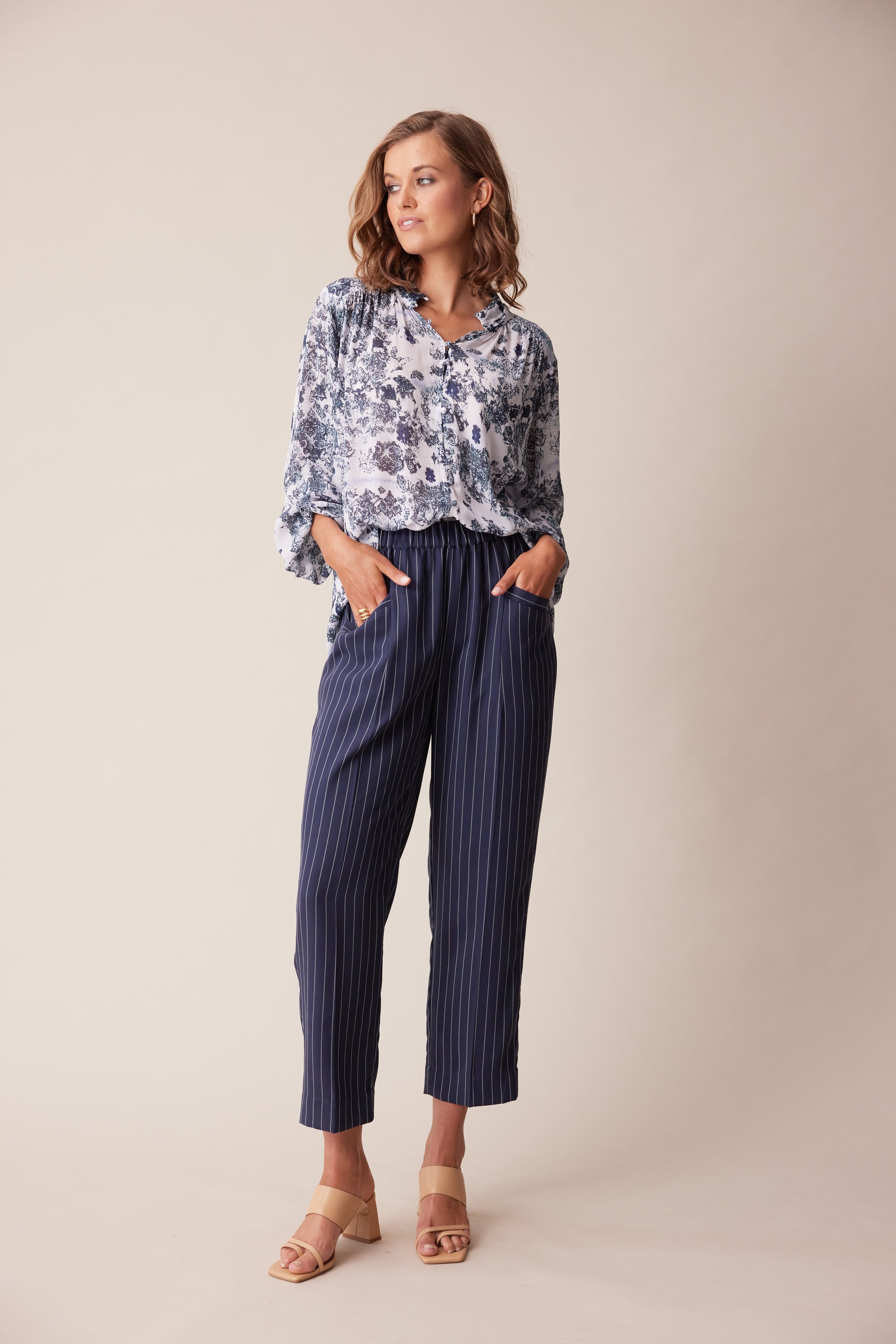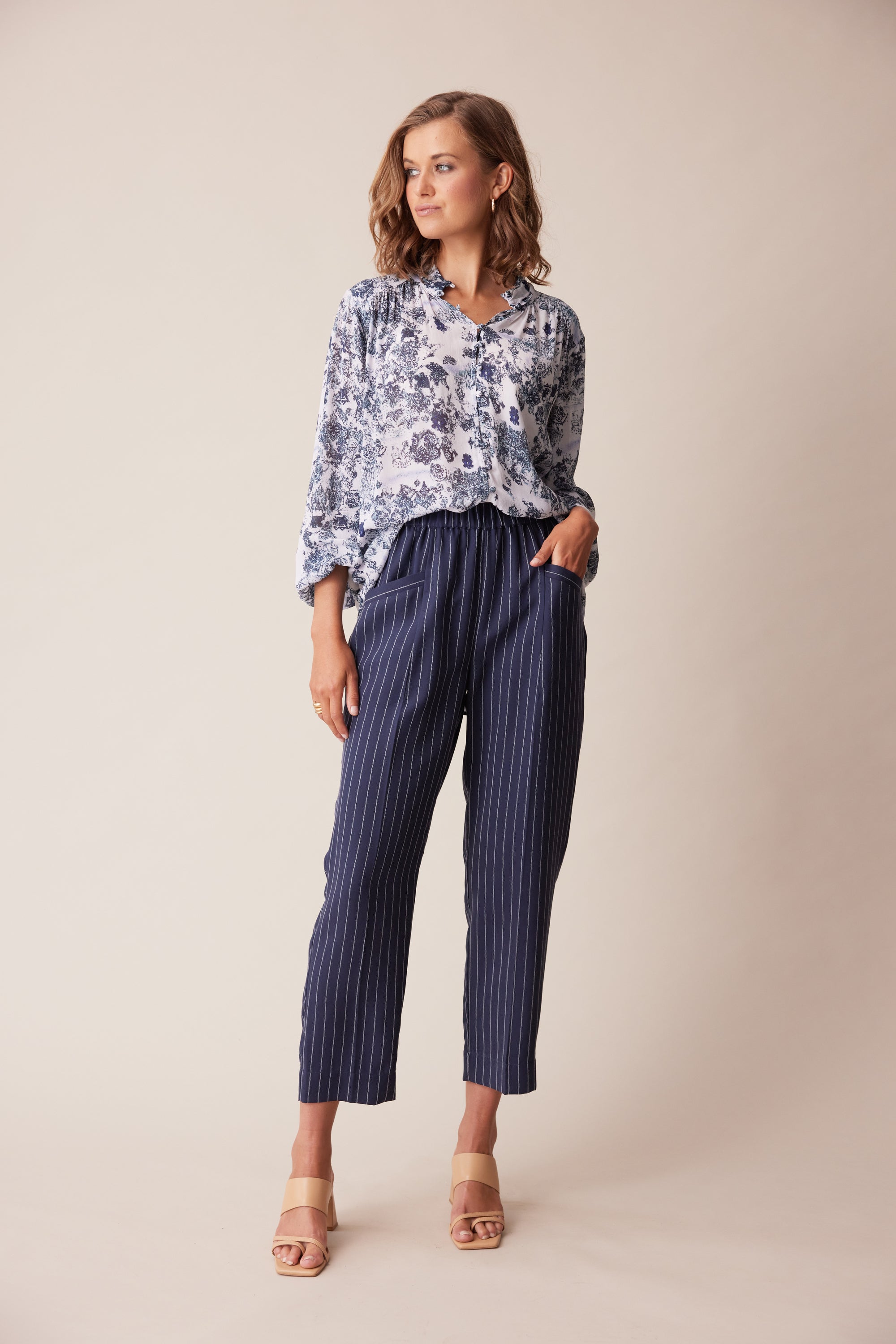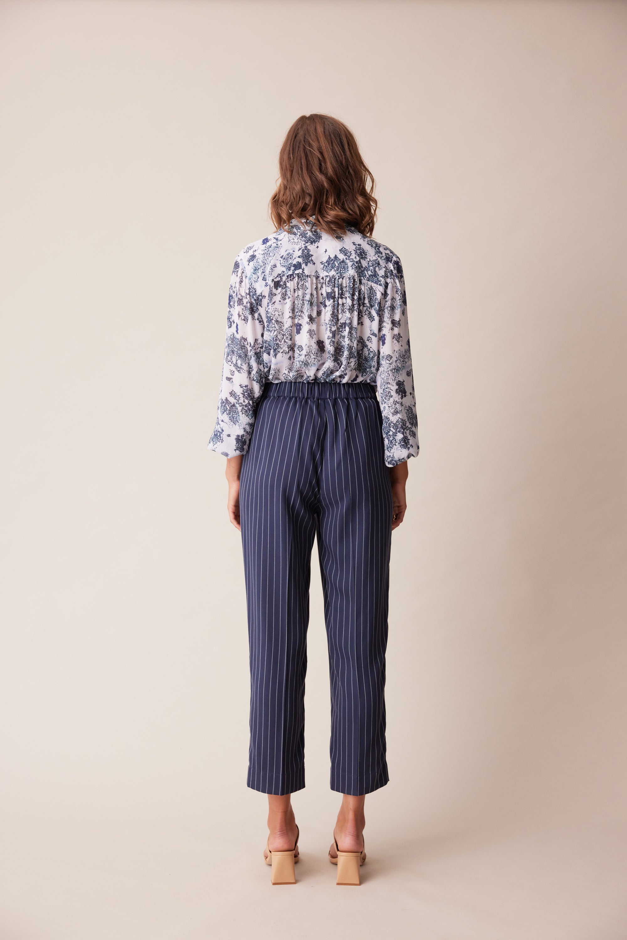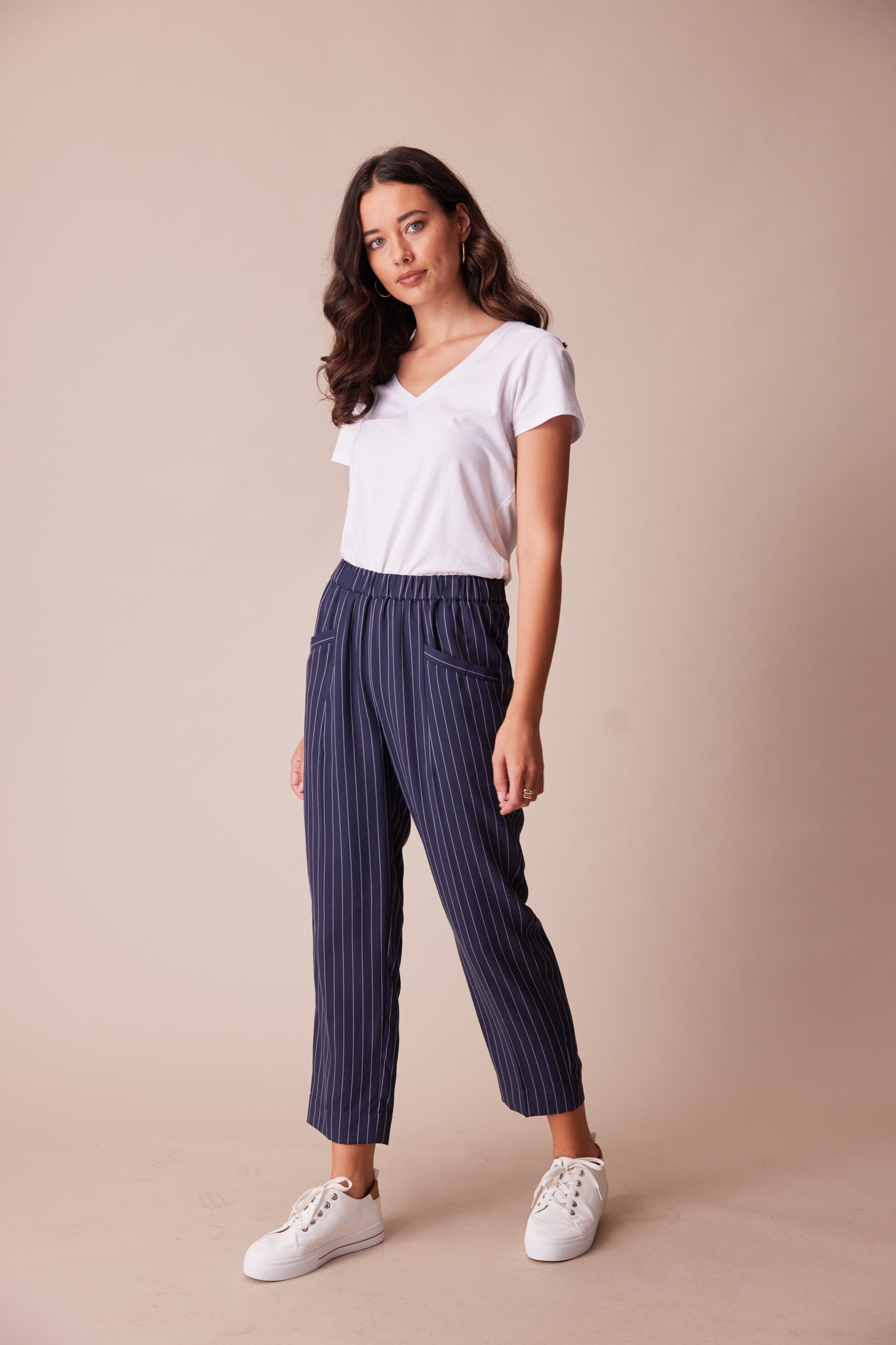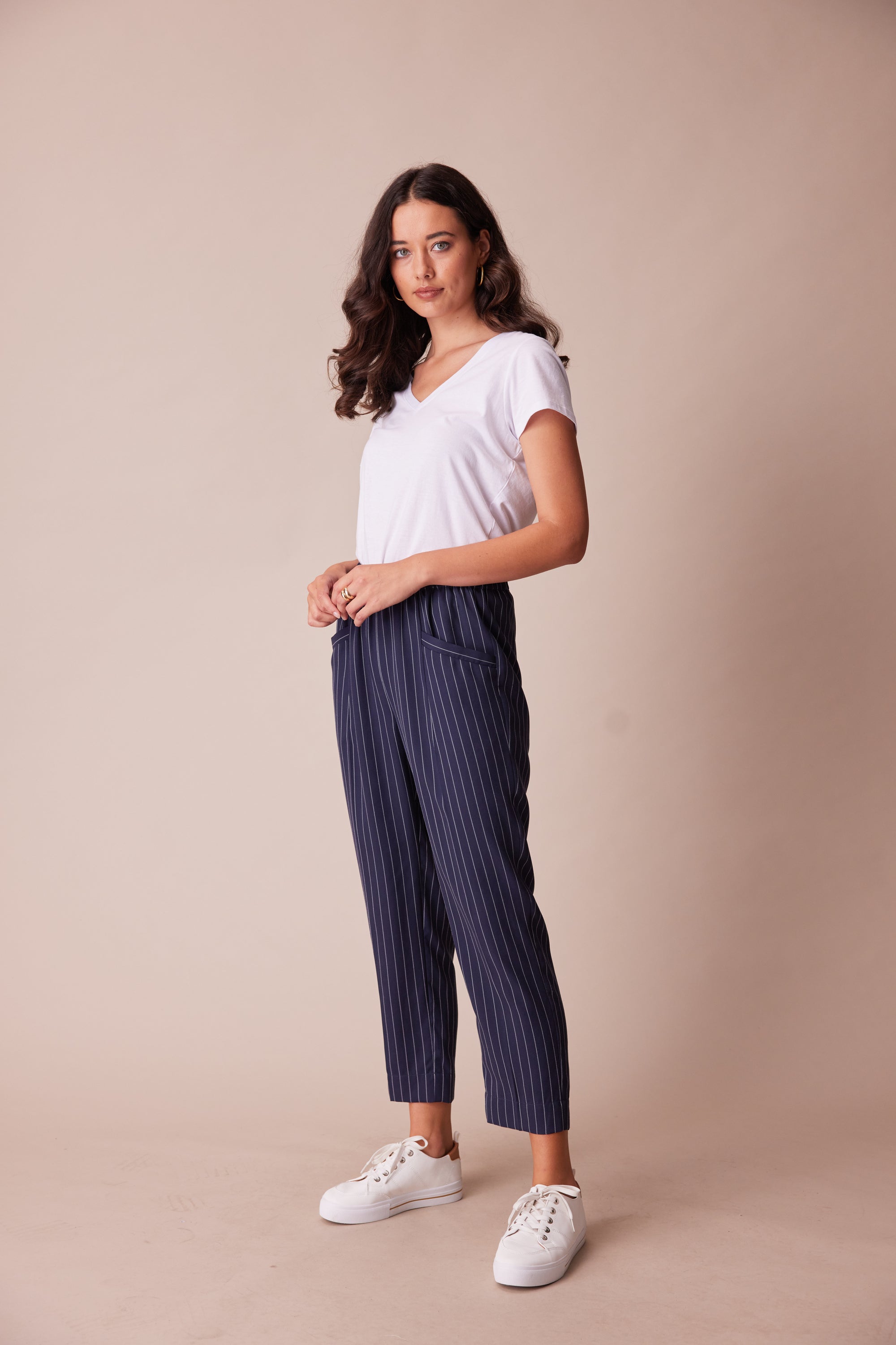 A cropped straight leg pant in stripe suiting with elasticated waistband. The unique welt pocket and dart design combined with a classic pinstripe add character to this versatile pant. Wear as a suit with the Manhattan jacket, or simply pair it with one of our essential tees.