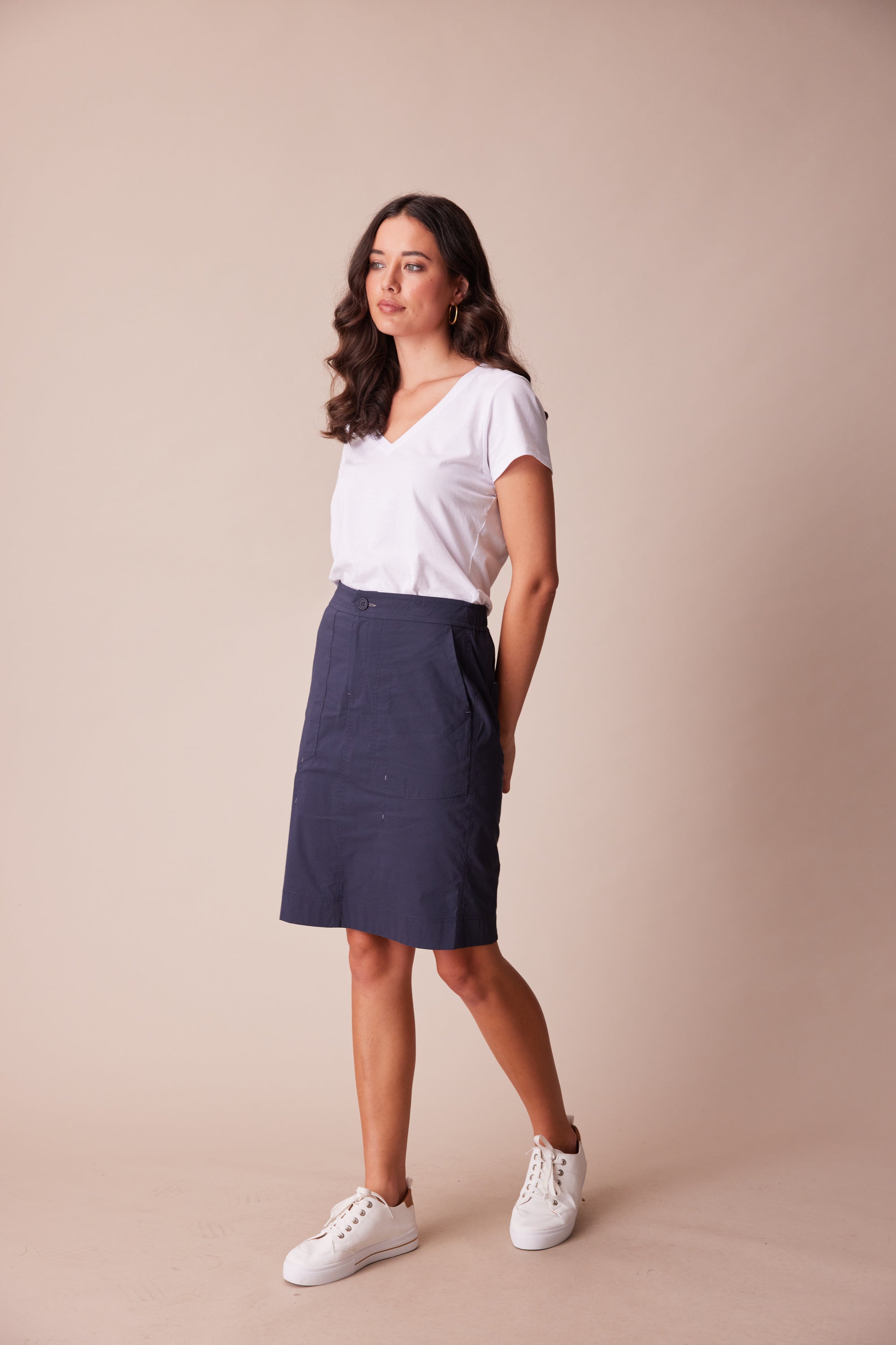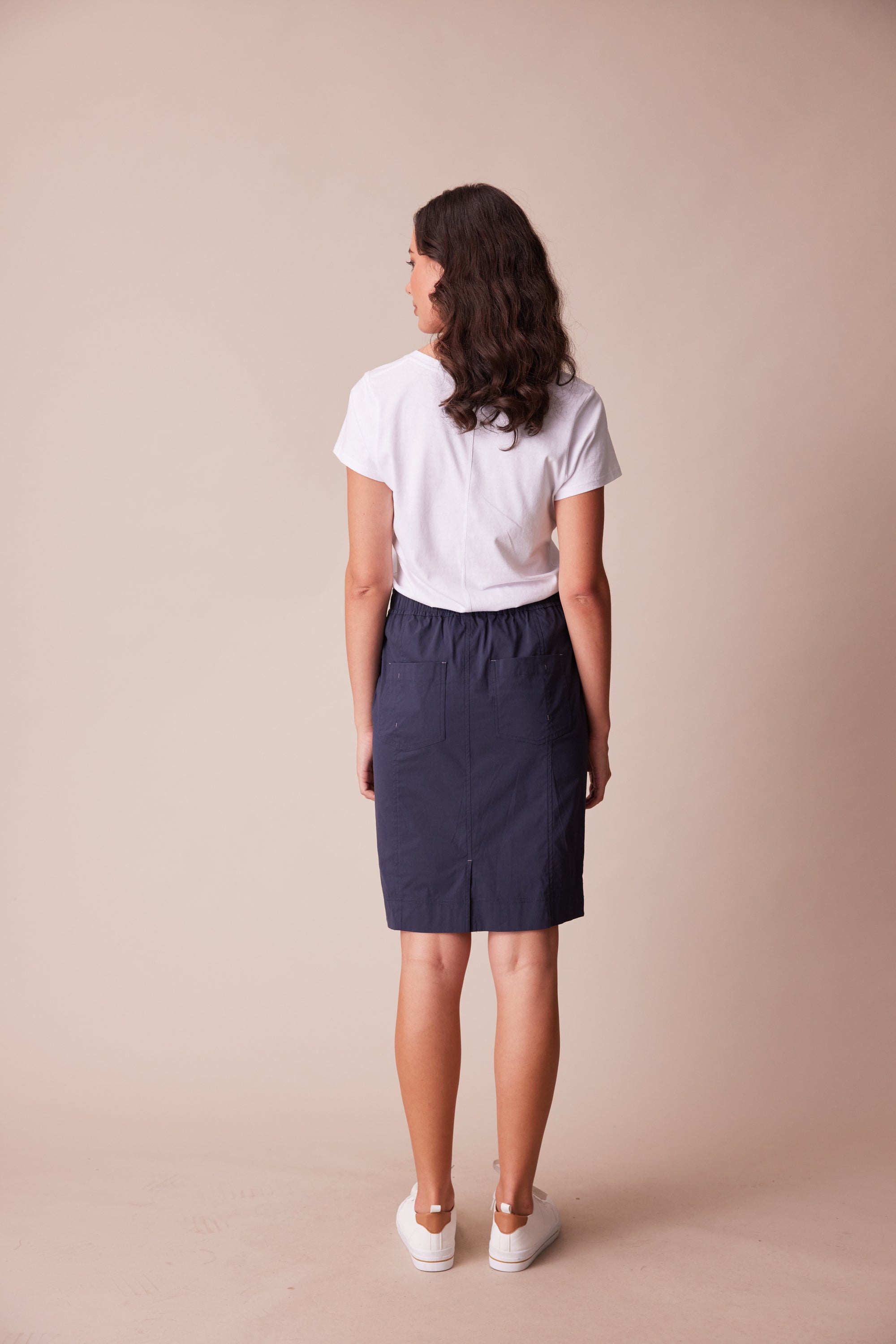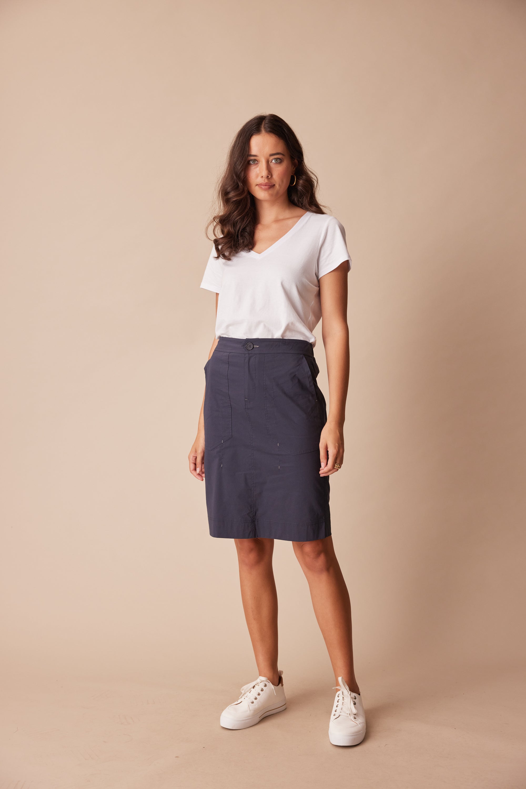 The first skirt in our lightweight cotton rich stretch fabric range - this fitted knee length skirt delivers on comfort and style, featuring a fly front opening, patch pockets, twin needle topstitching, elasticated back waist and centre back hem split.