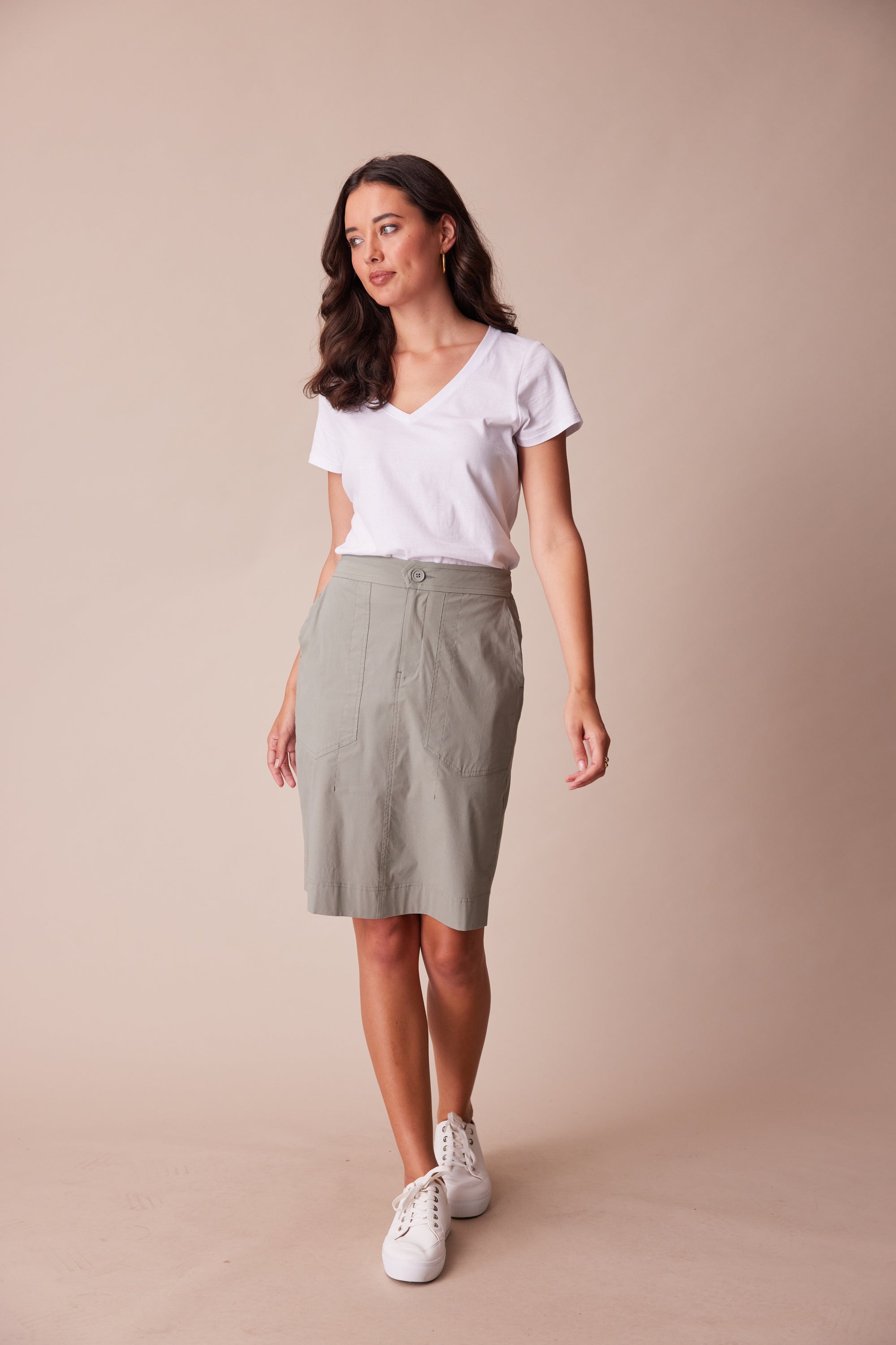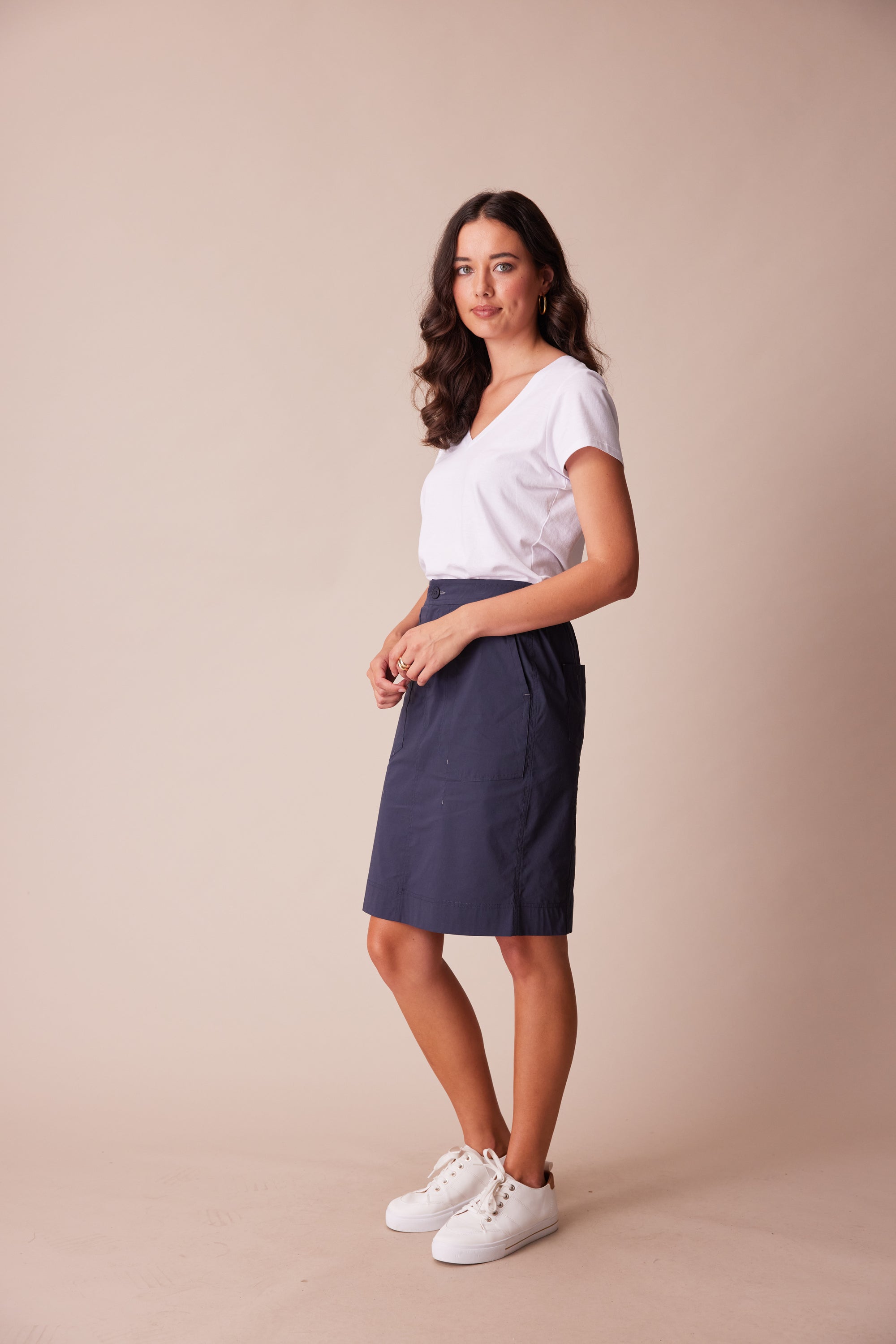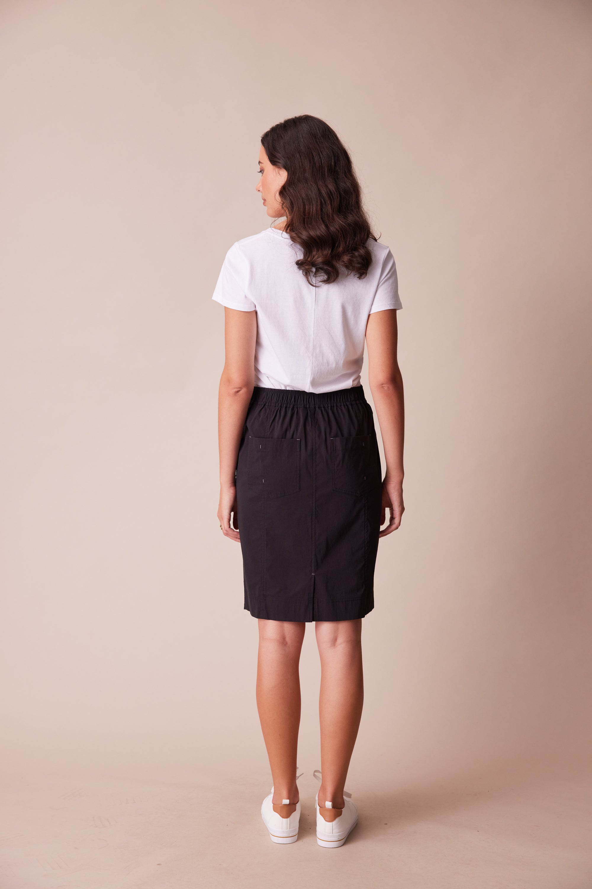 The first skirt in our lightweight cotton rich stretch fabric range - this fitted knee length skirt delivers on comfort and style, featuring a fly front opening, patch pockets, twin needle topstitching, elasticated back waist and centre back hem split.