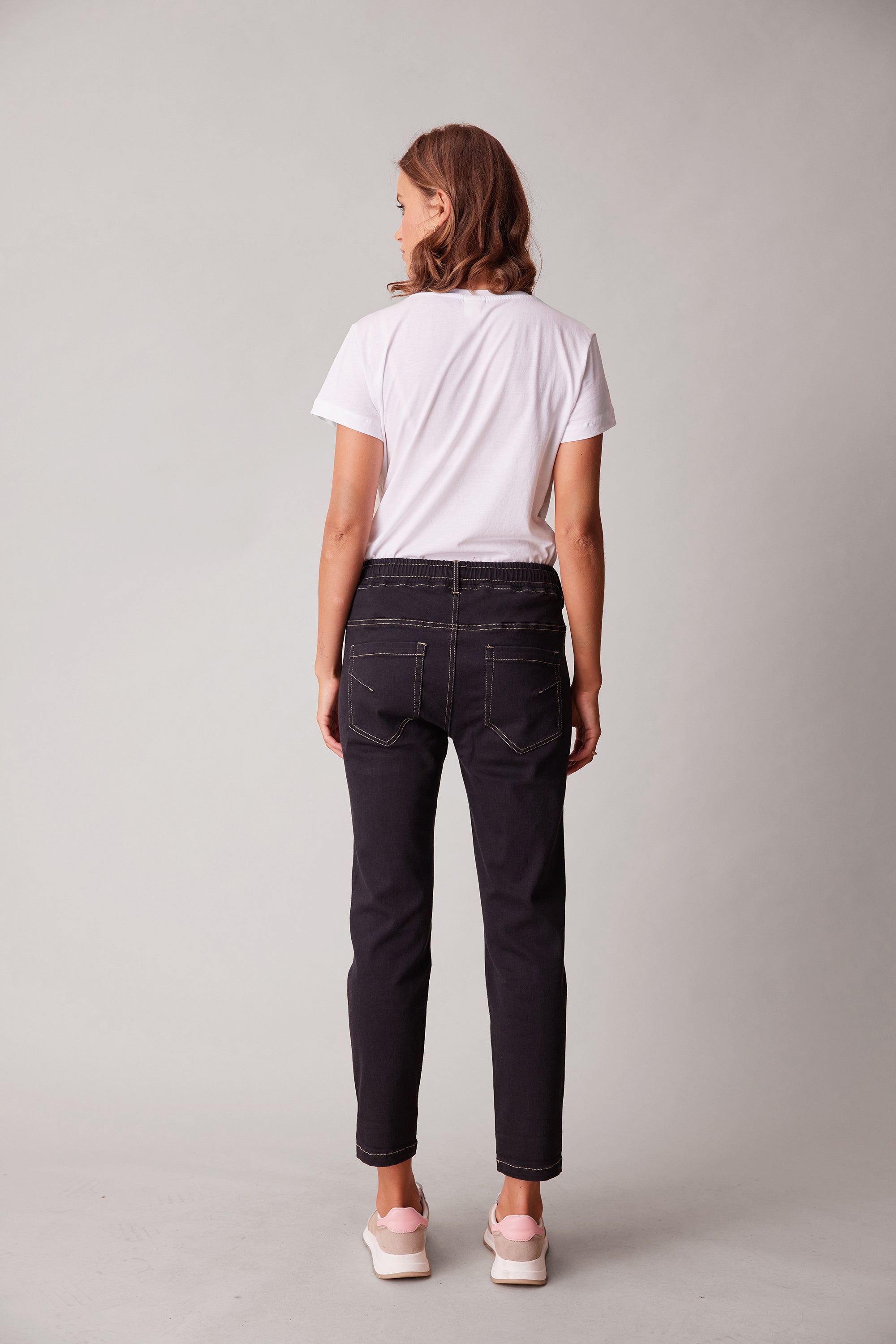 Casual jean with elasticated waist and adjustable drawstring tie. Soft handle achieved by special garment wash.