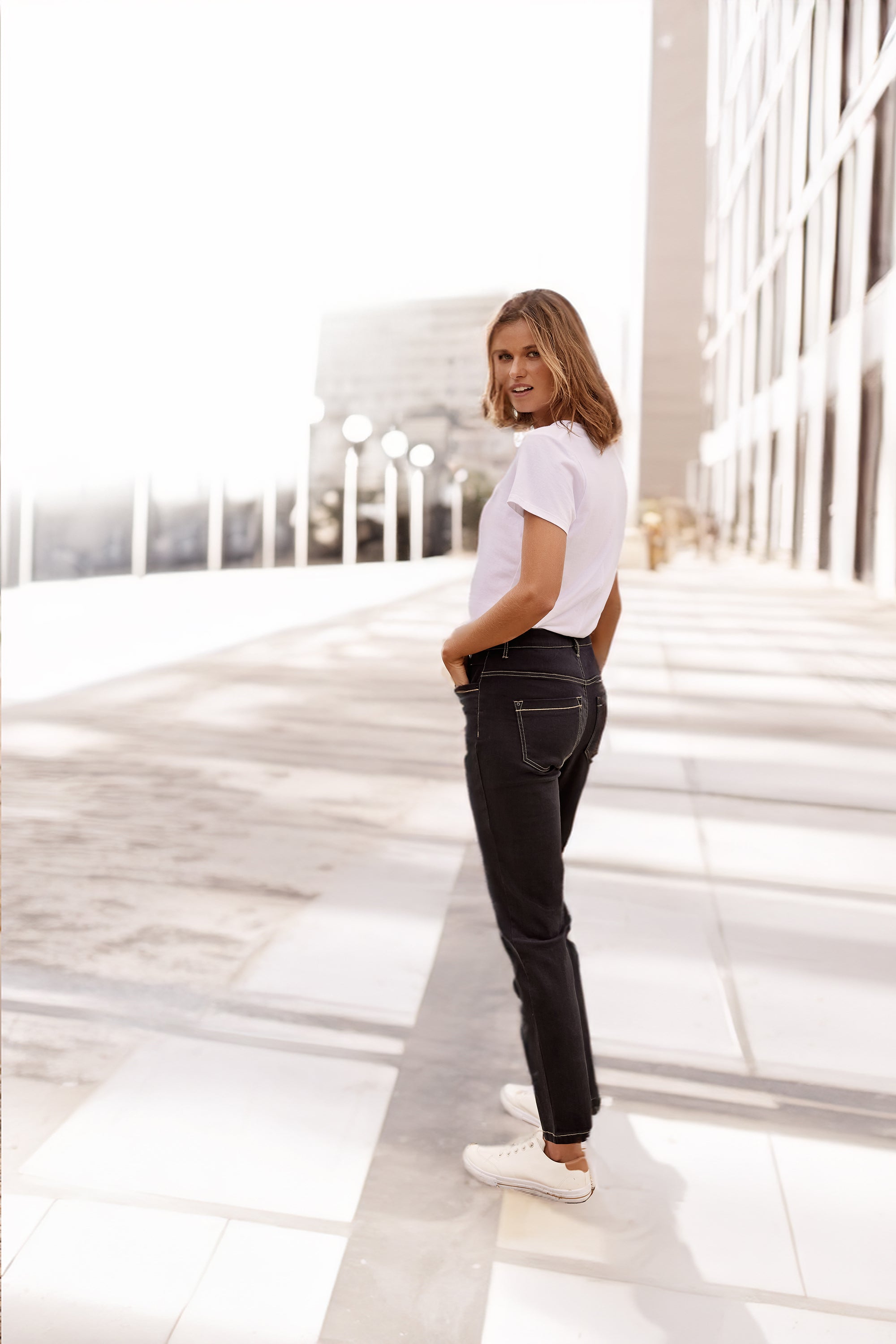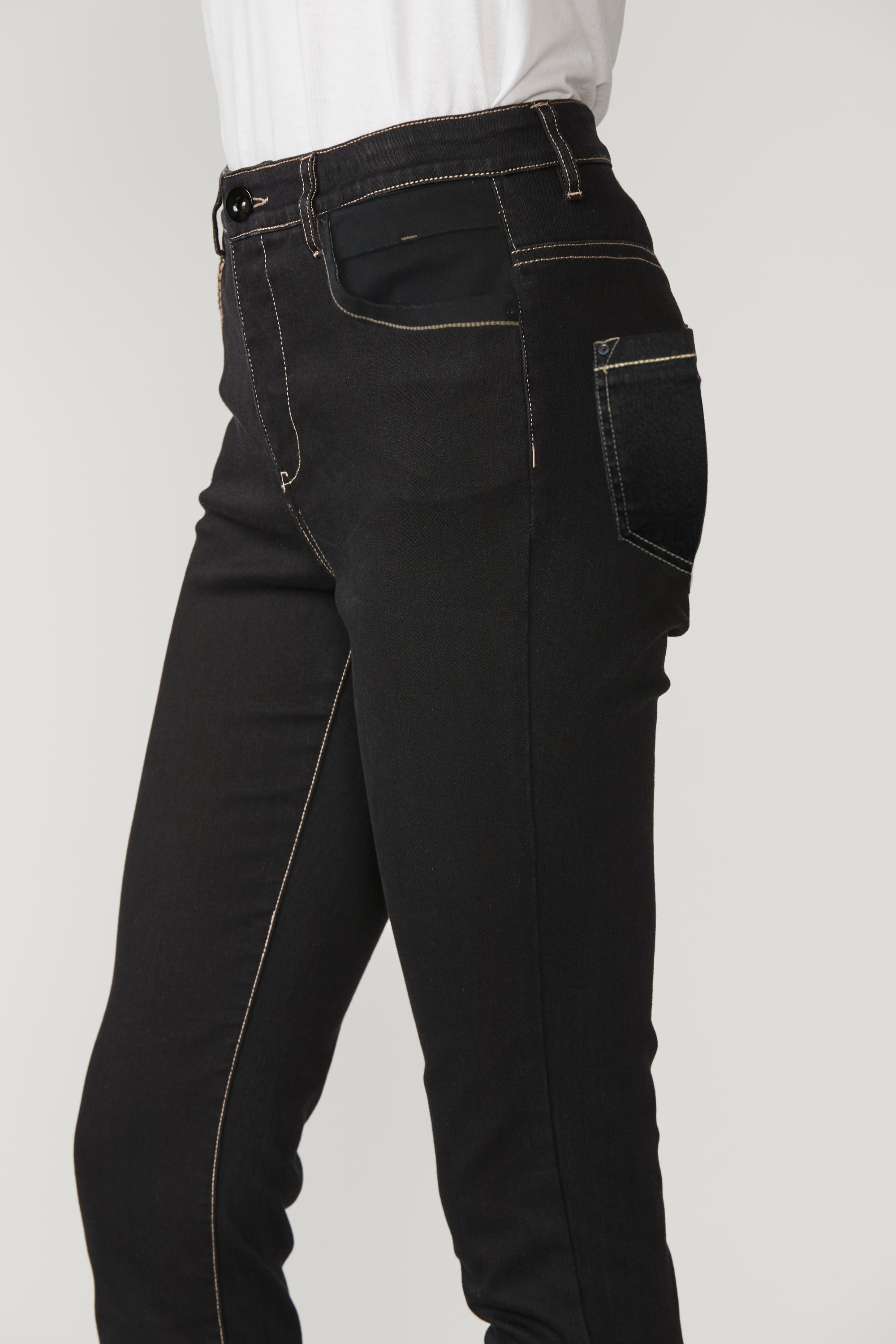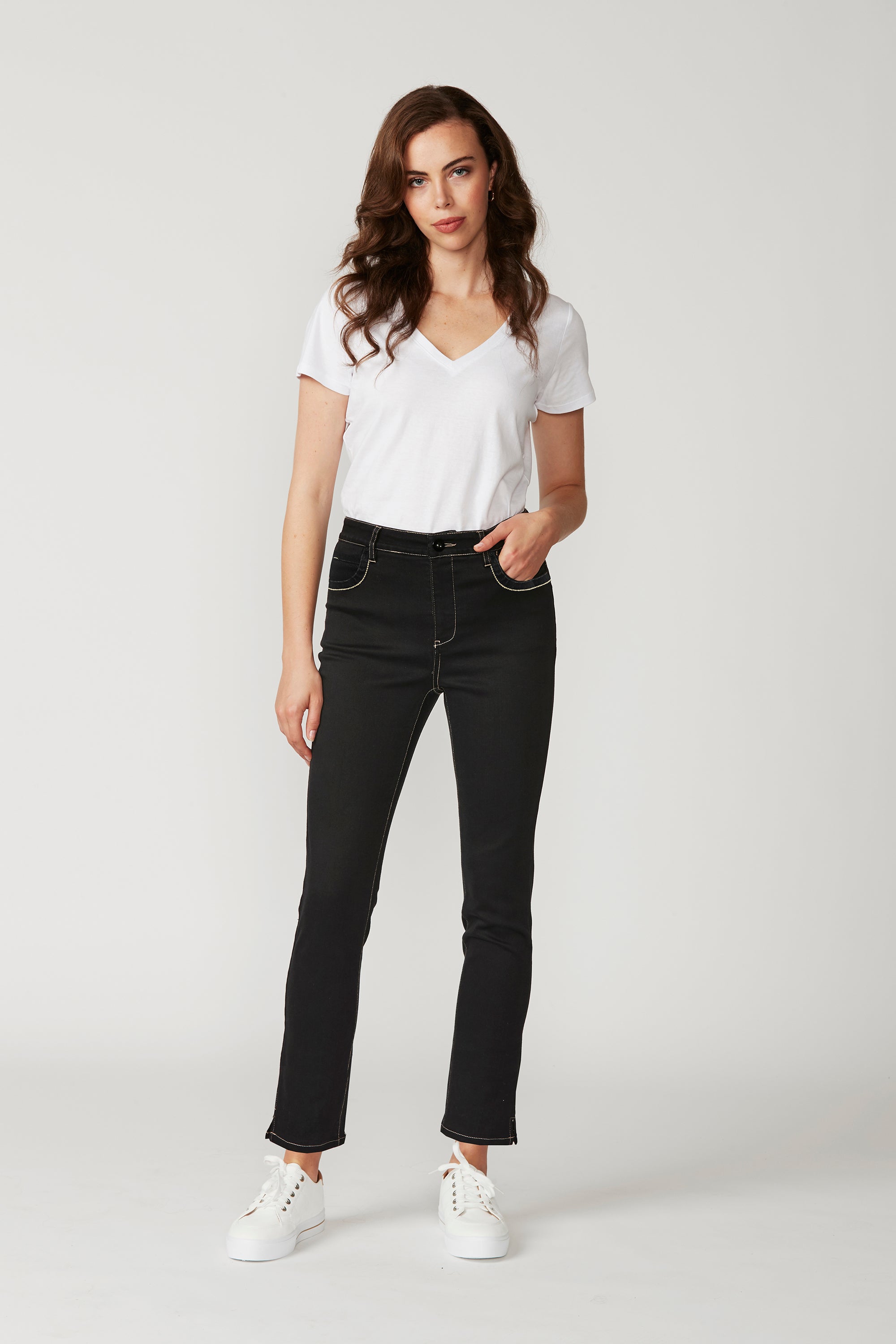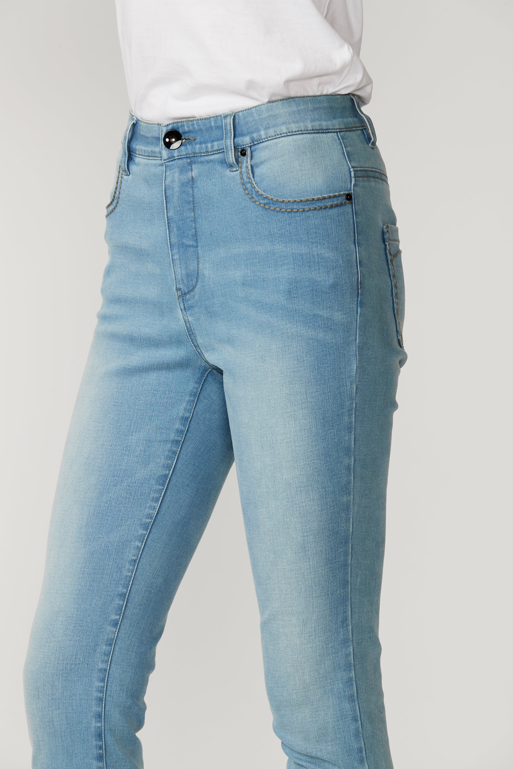 A five-pocket mid-rise jean in a super stretchy denim featuring contrast embroidered stitching around pocket openings and our signature stretch waist construction for superior fit and comfort. 7/8 length, straight leg fit.