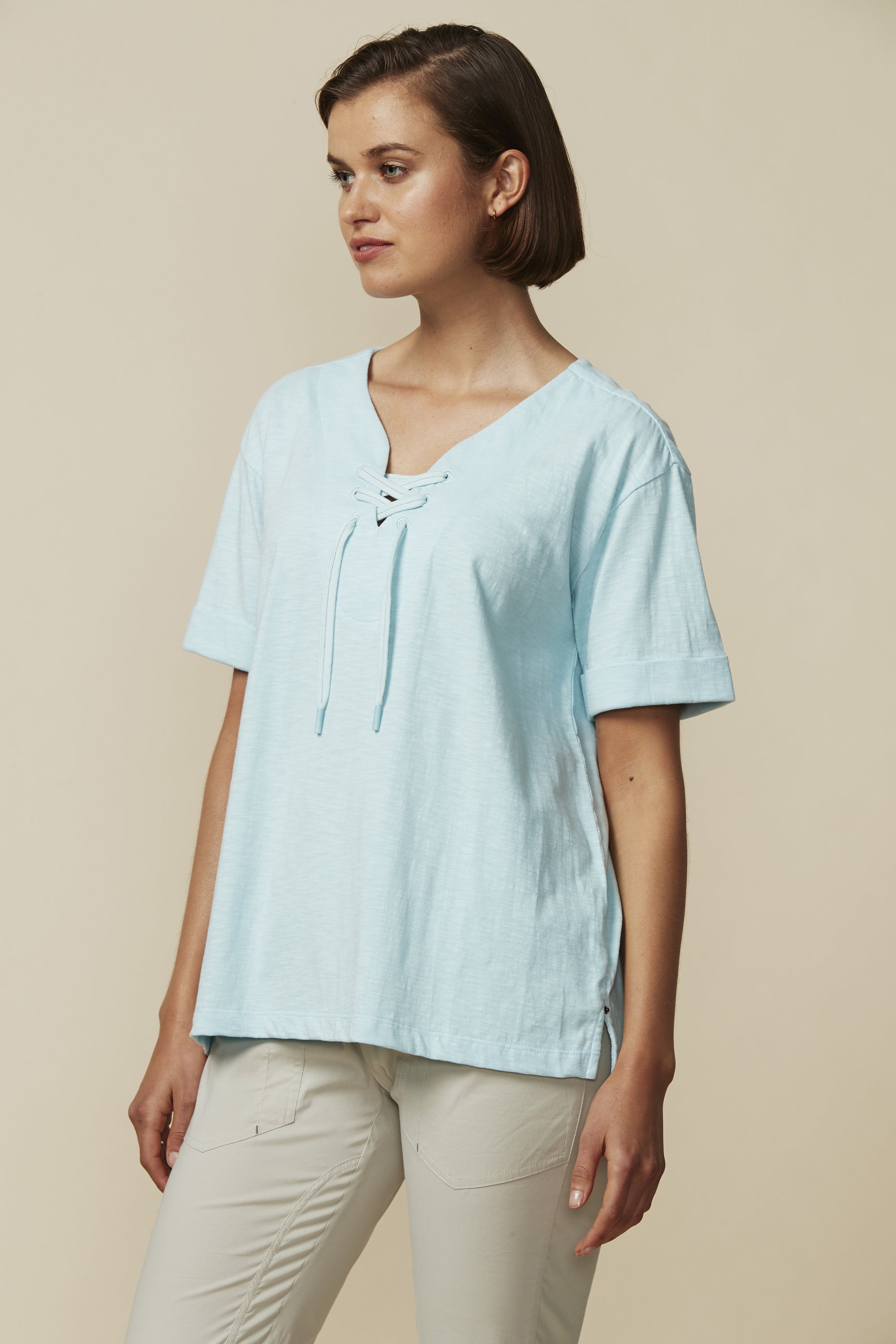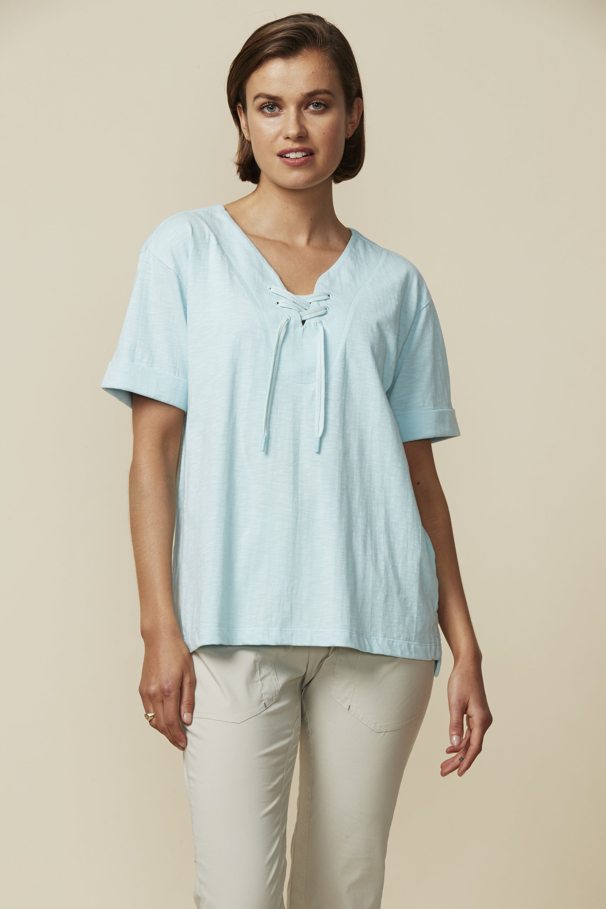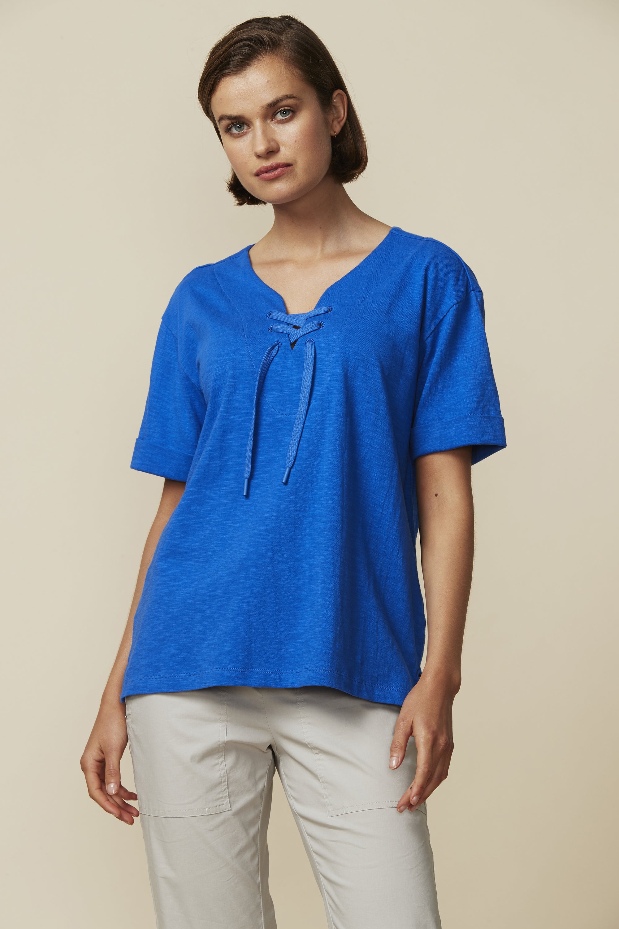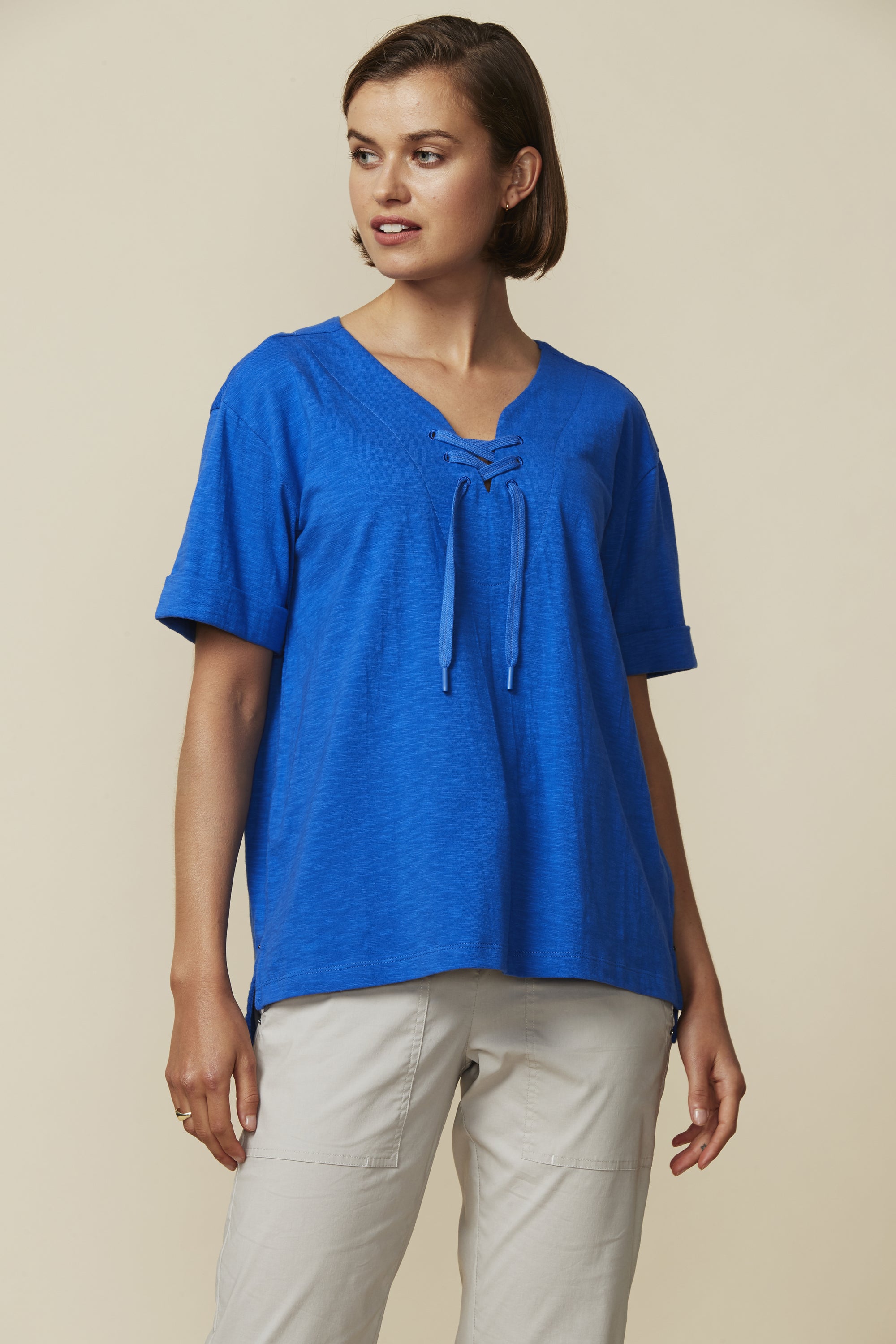 Soft cotton slub knit tee, V-neck featuring lace up front neck detail; short sleeve with turn up cuff. Available in 3 vibrant colours Aqua, Cobalt and Poppy.