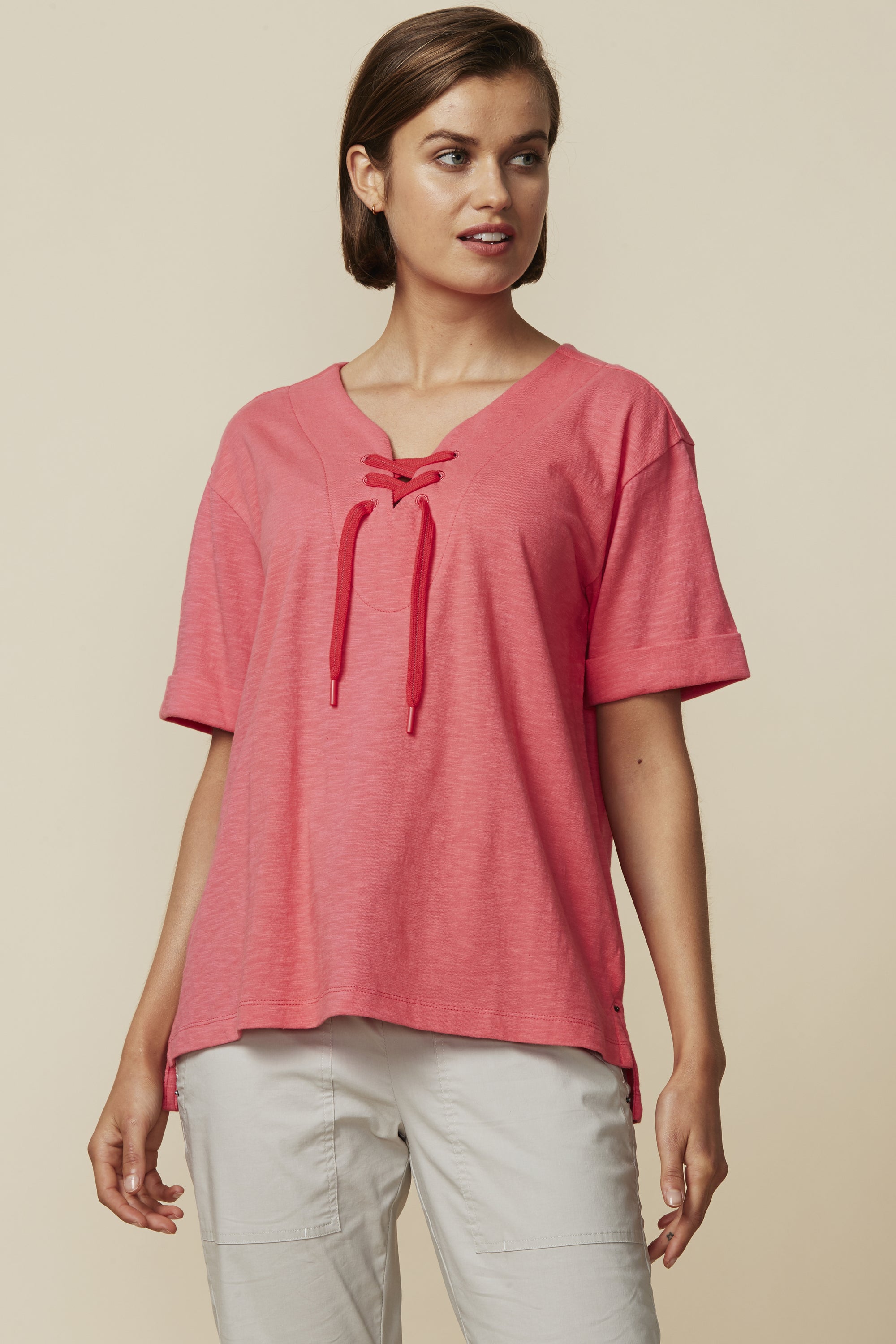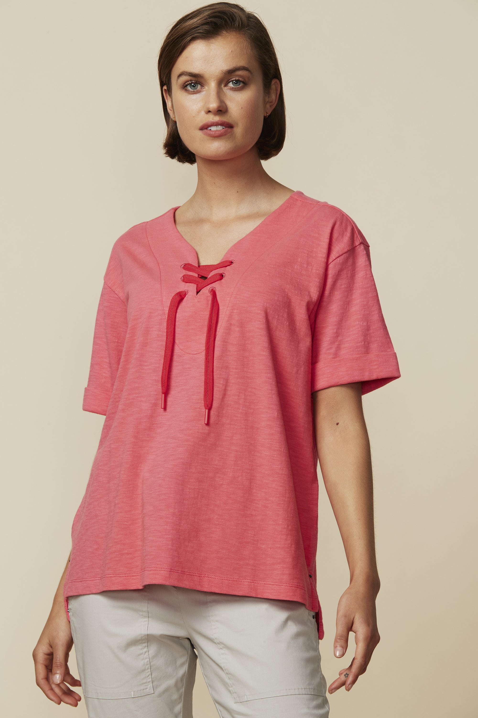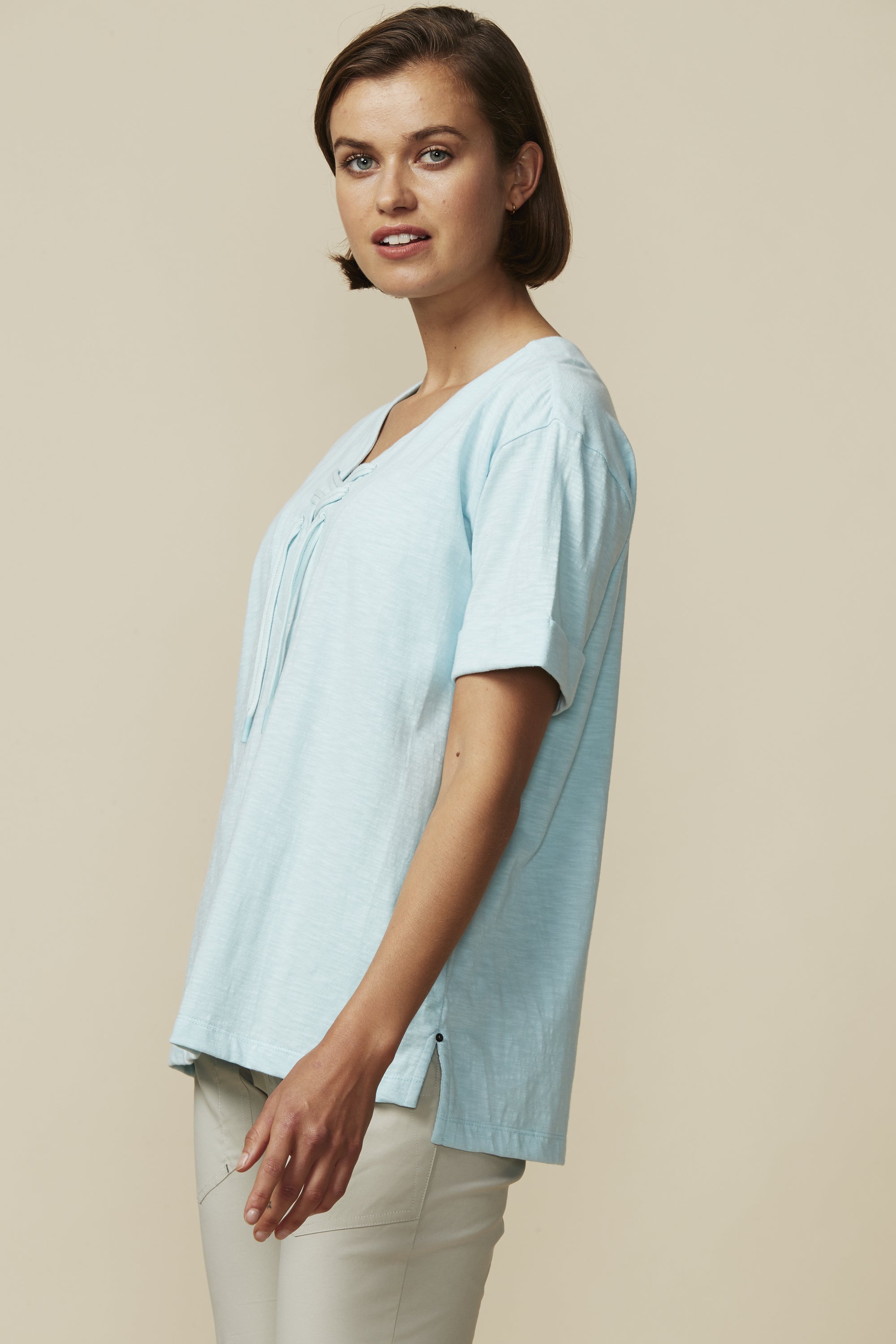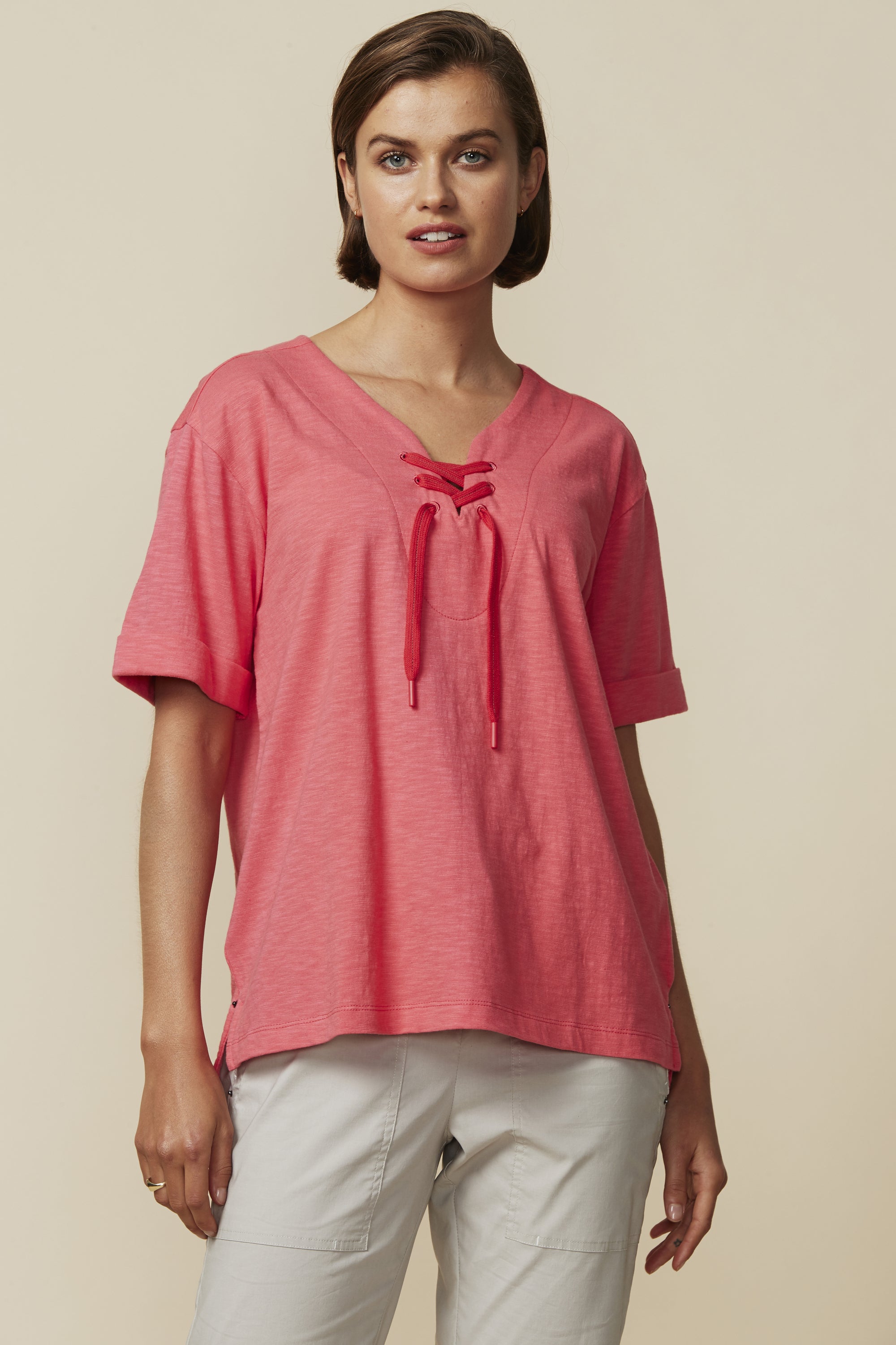Soft cotton slub knit tee, V-neck featuring lace up front neck detail; short sleeve with turn up cuff. Available in 3 vibrant colours Aqua, Cobalt and Poppy.