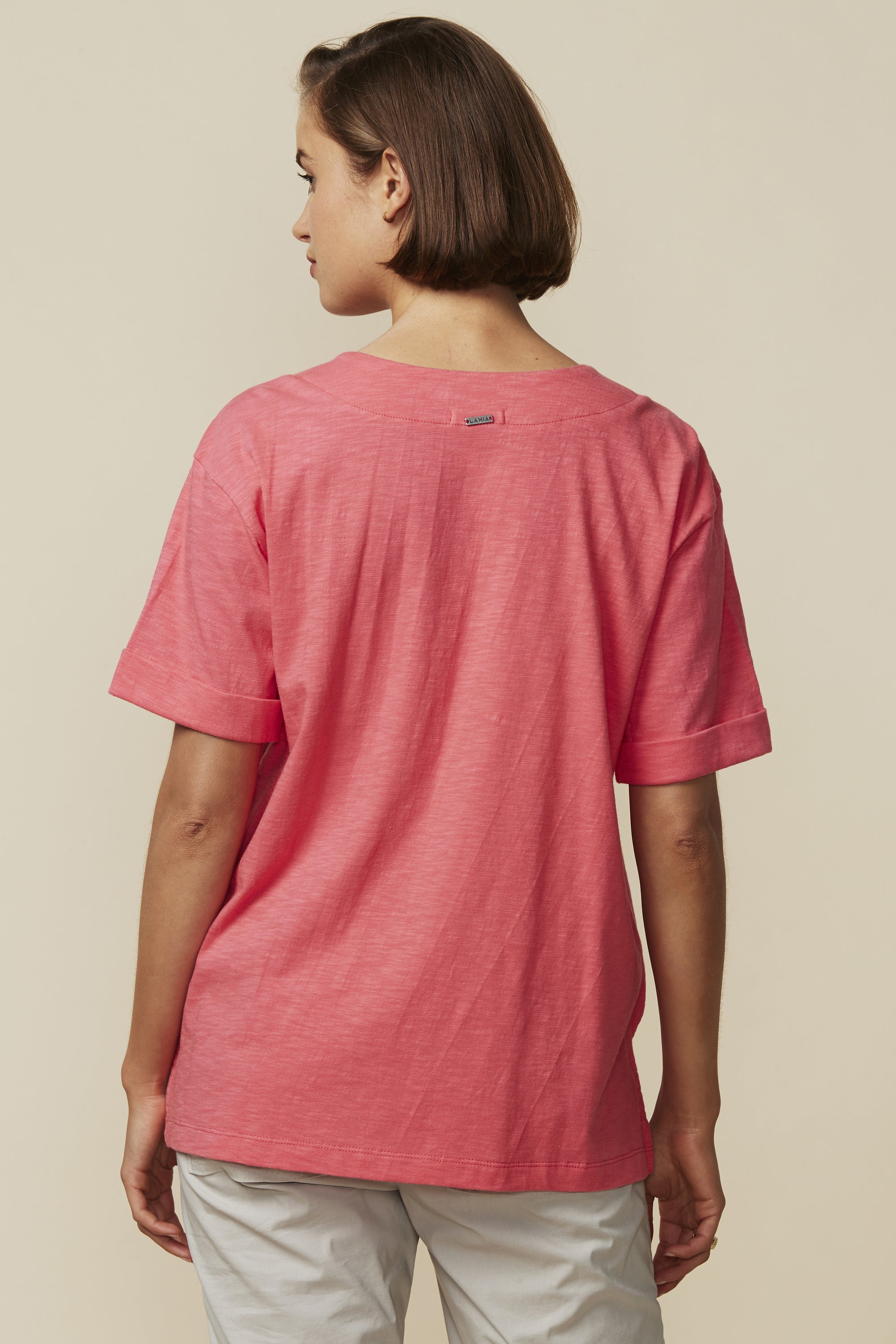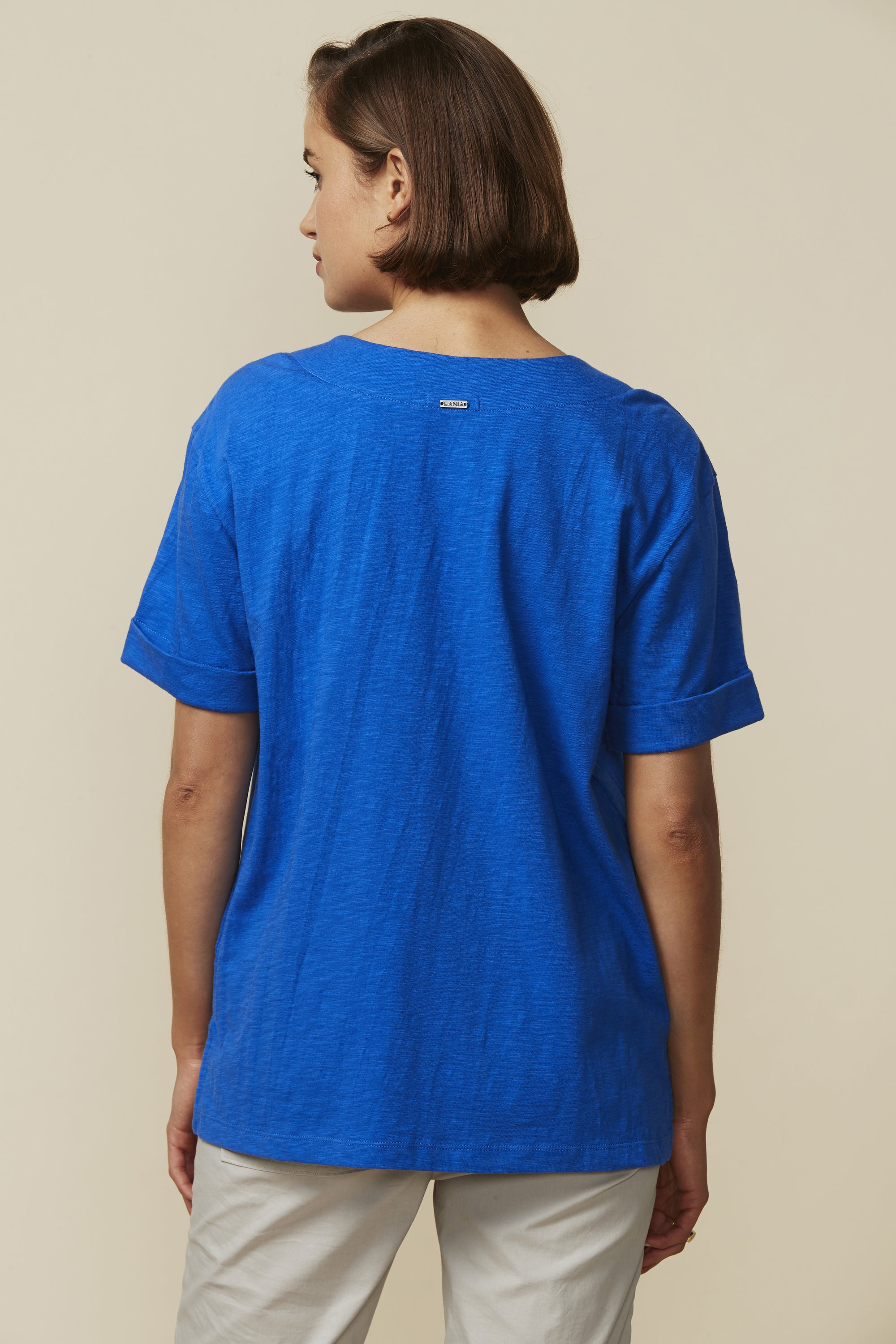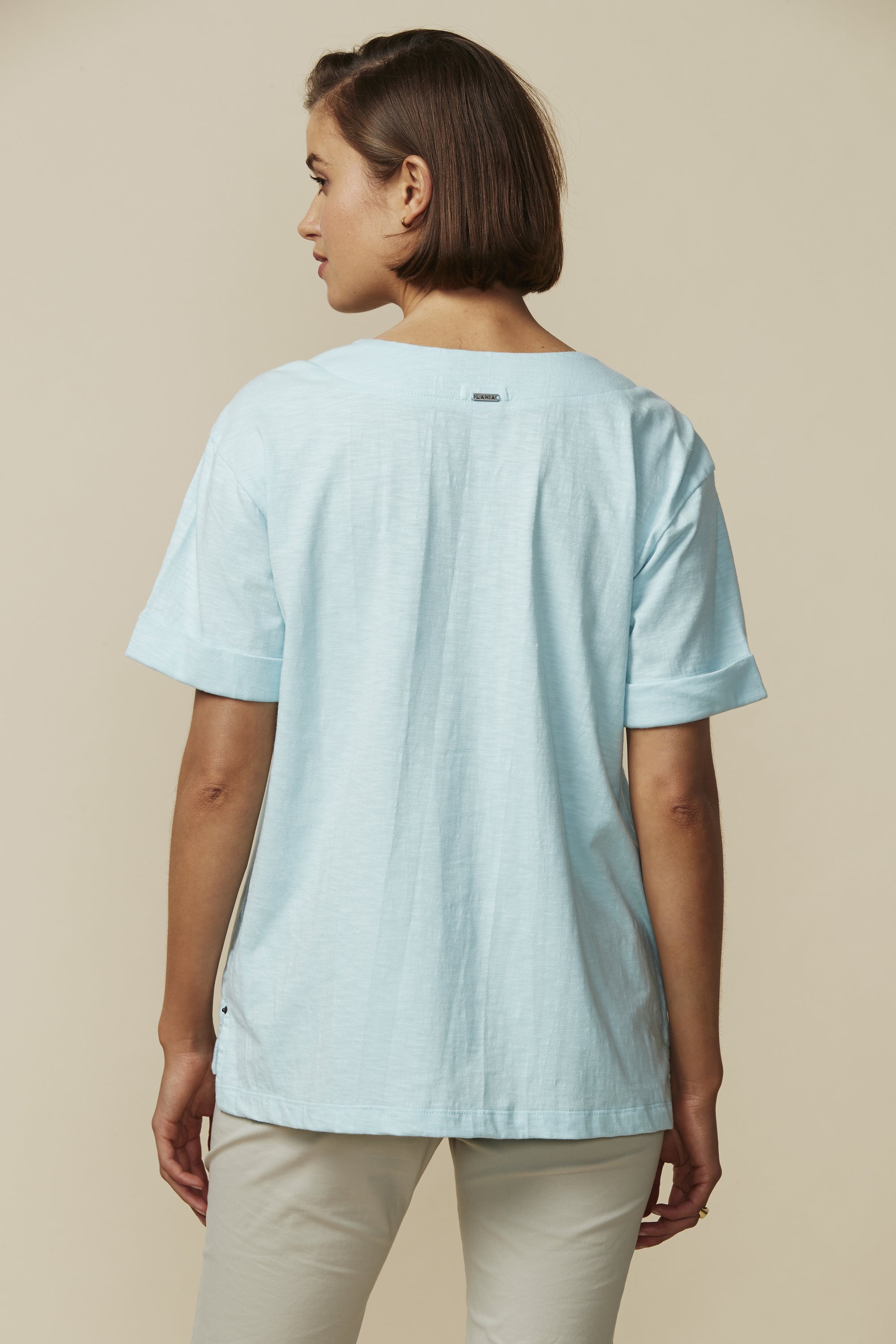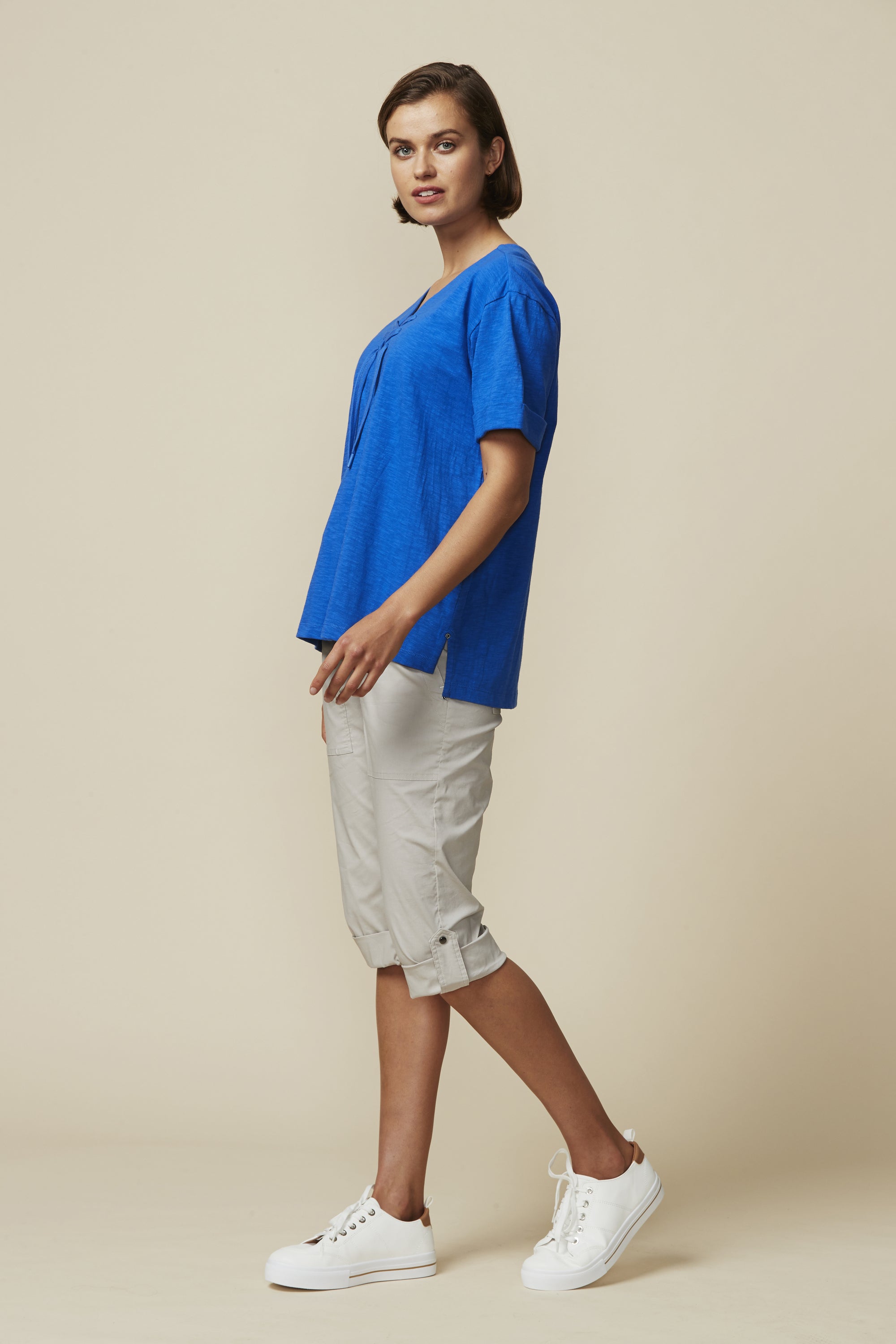 Soft cotton slub knit tee, V-neck featuring lace up front neck detail; short sleeve with turn up cuff. Available in 3 vibrant colours Aqua, Cobalt and Poppy.
