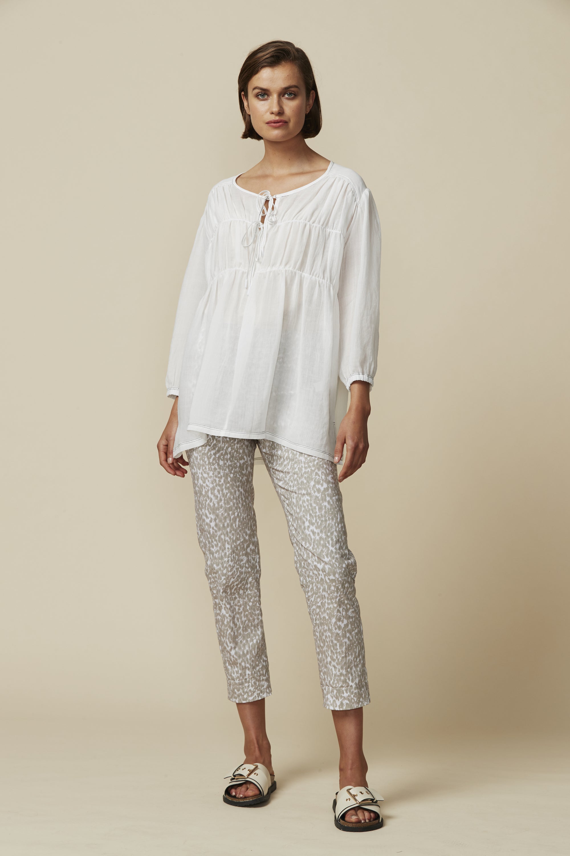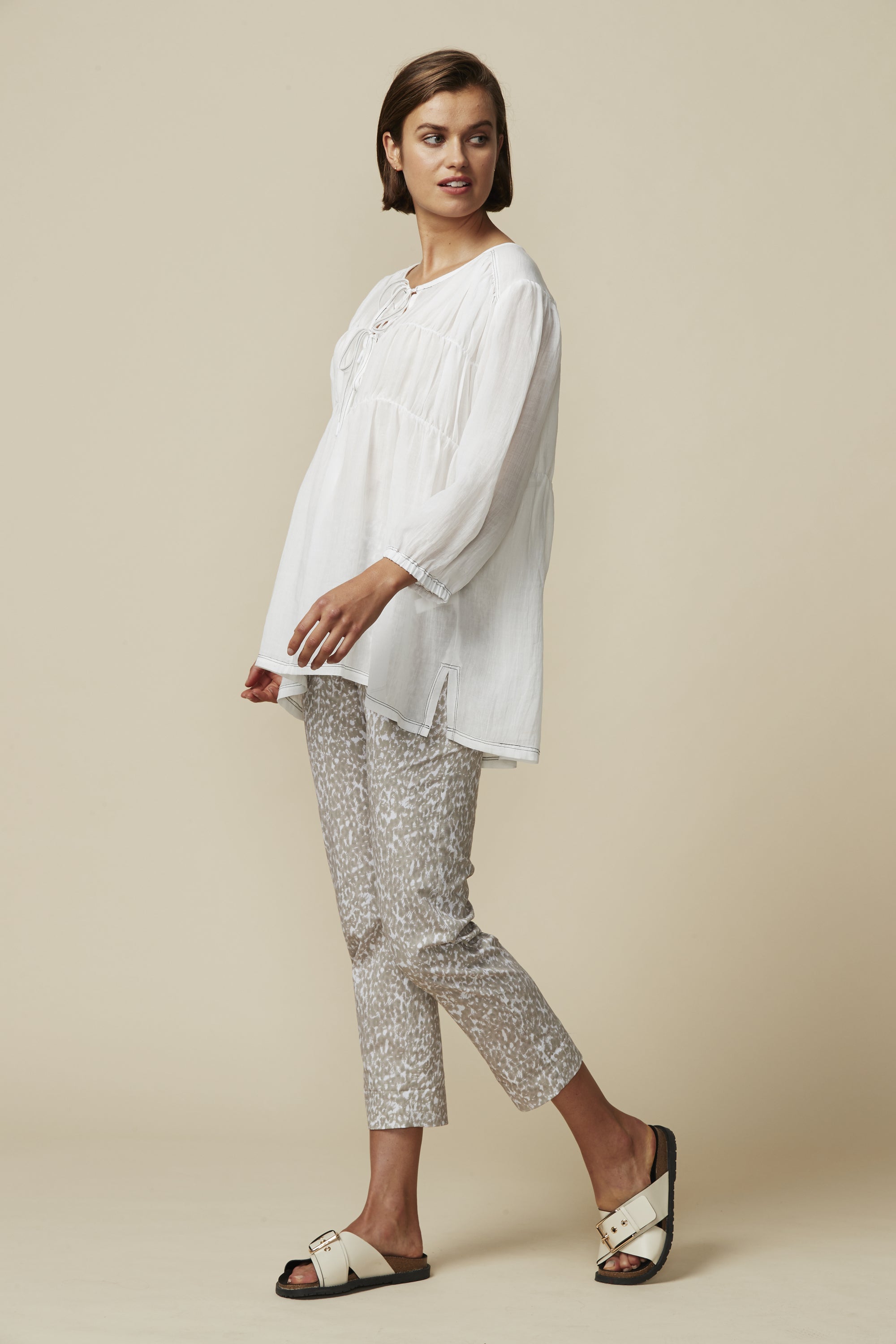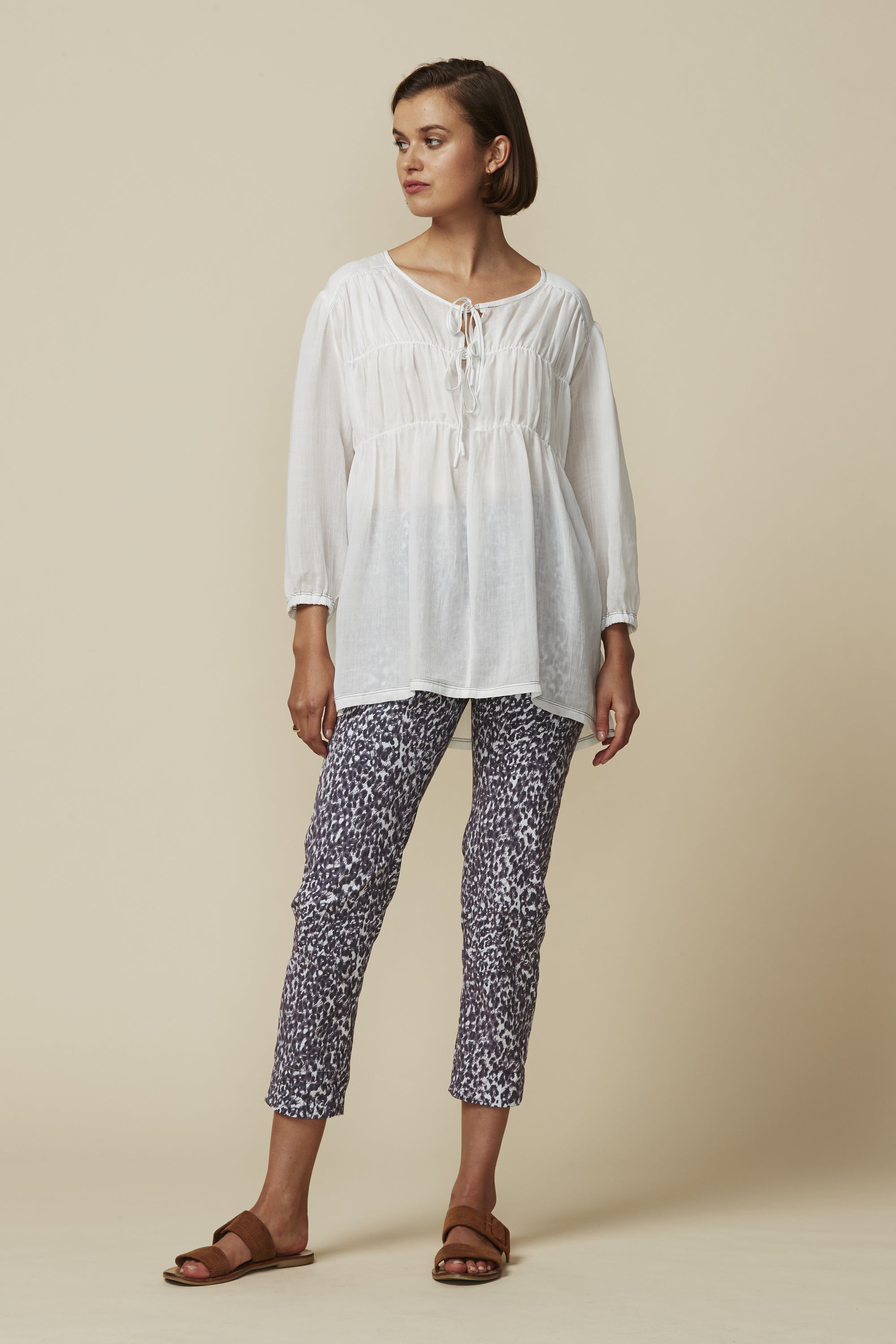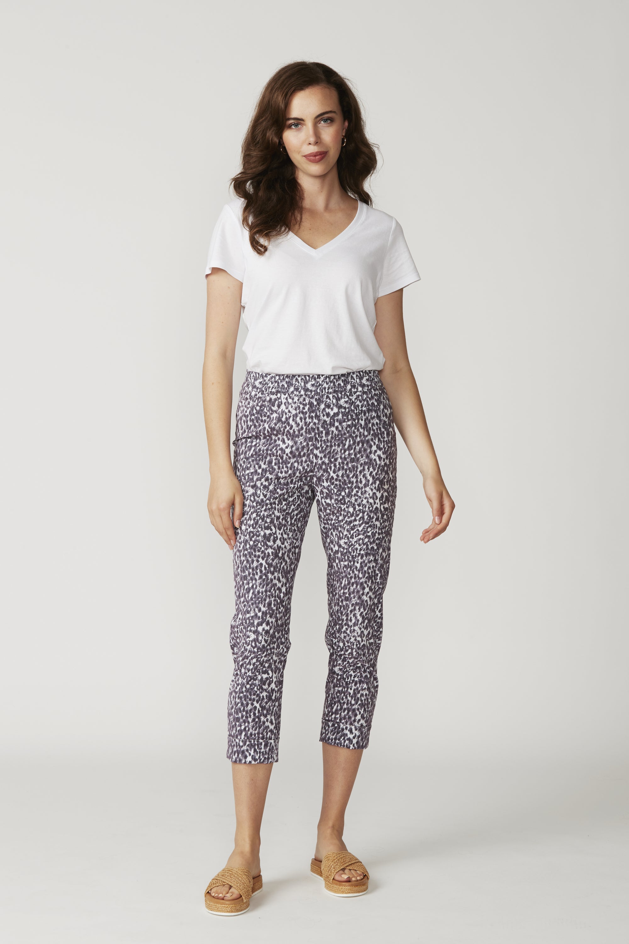The LTL Pebble Pant — another new addition to our signature lightweight cotton rich stretch fabric, now in a Pebble print. Elasticated waist, 7/8 length with deep hem for optional turn up cuff.