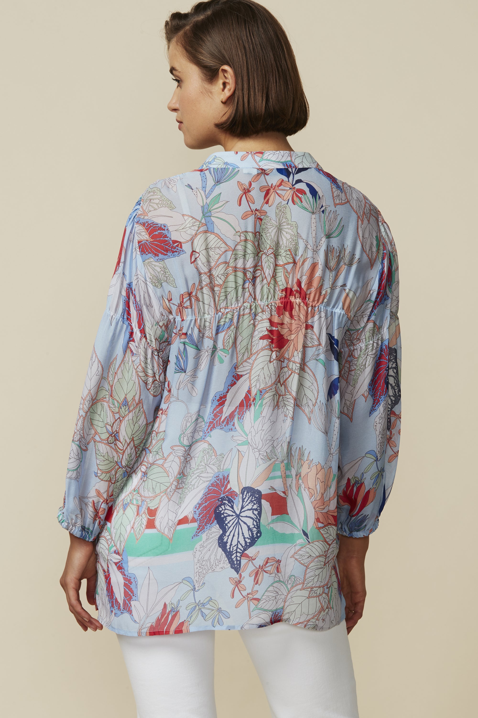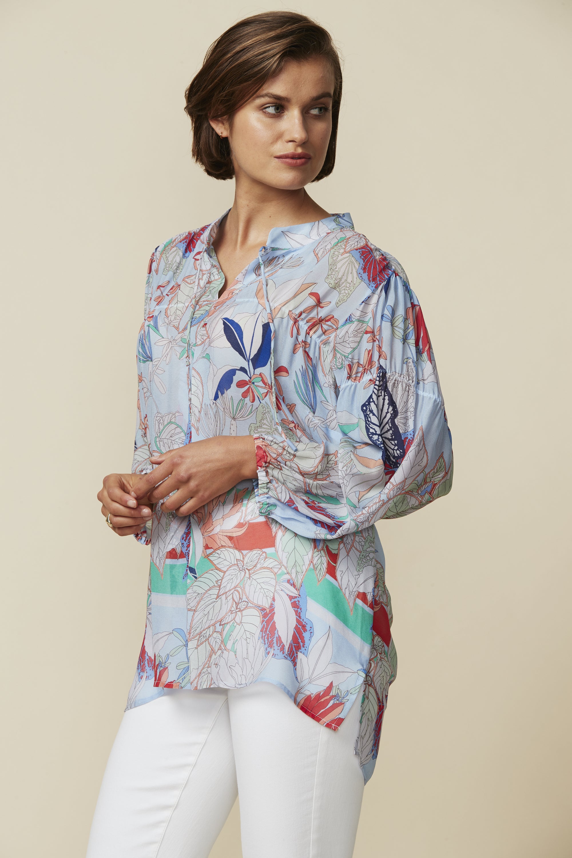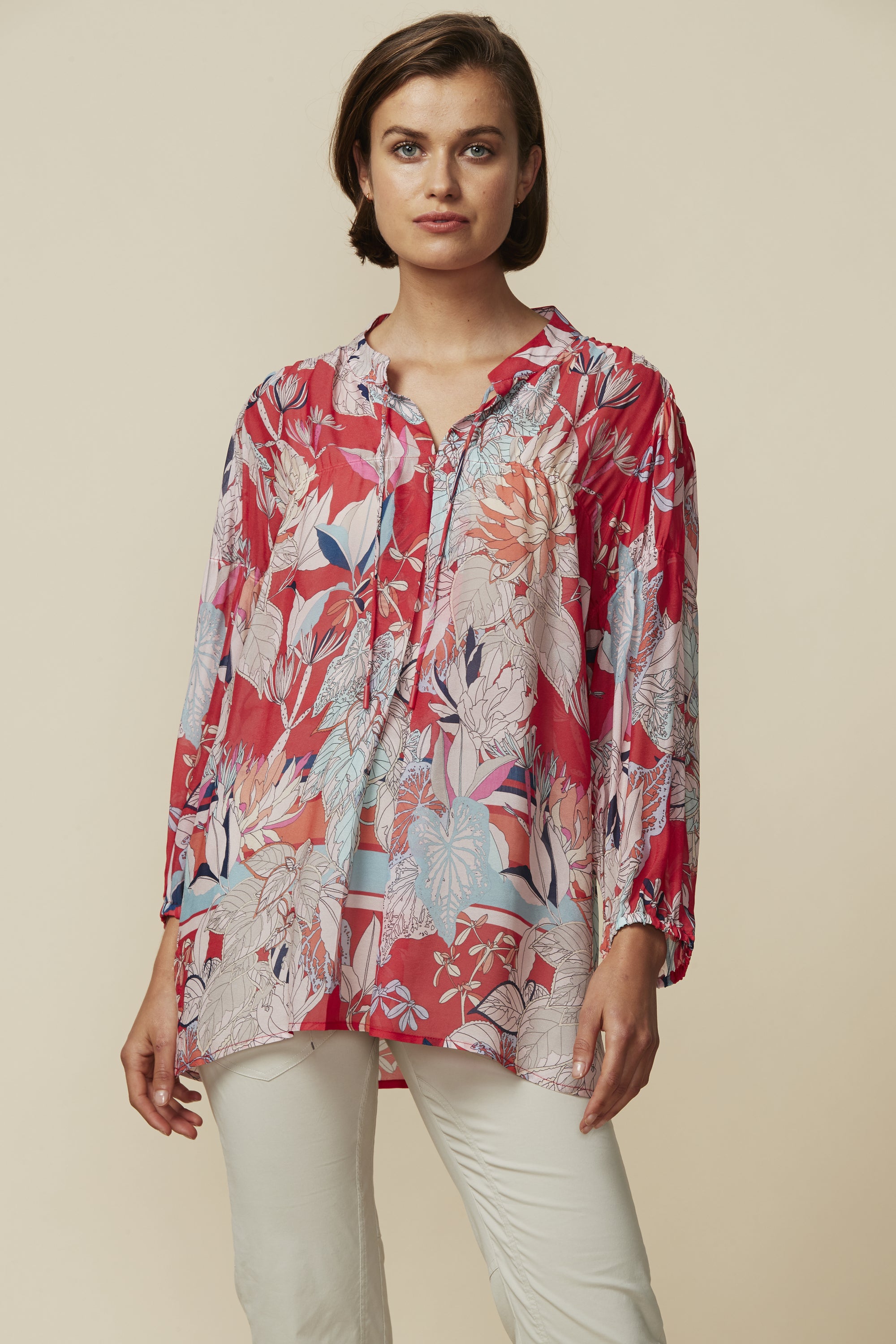 A vibrant print sheer top, bracelet length sleeve with elastic cuff and tie front neck; gathers on body & sleeves create a feminine silhouette.