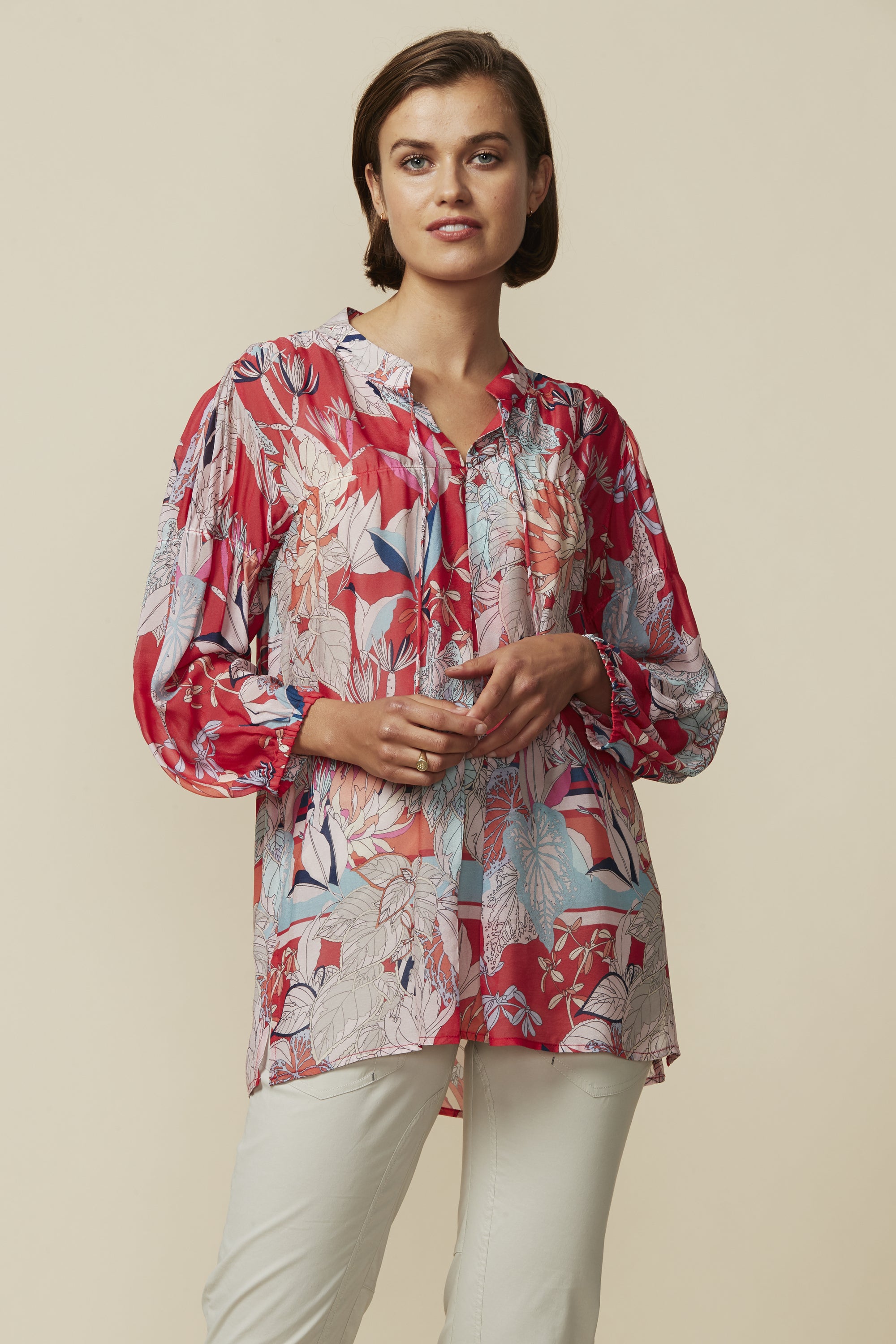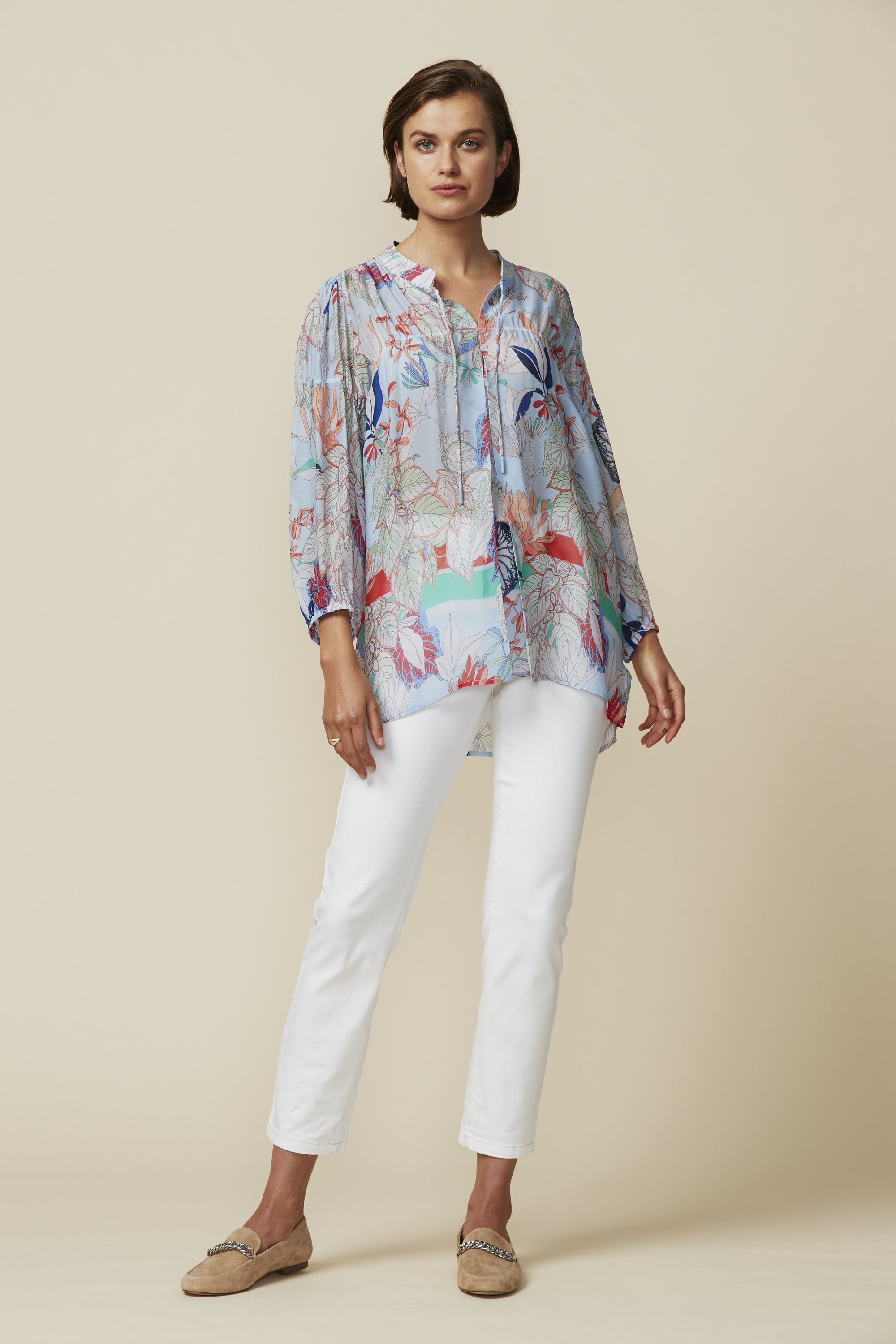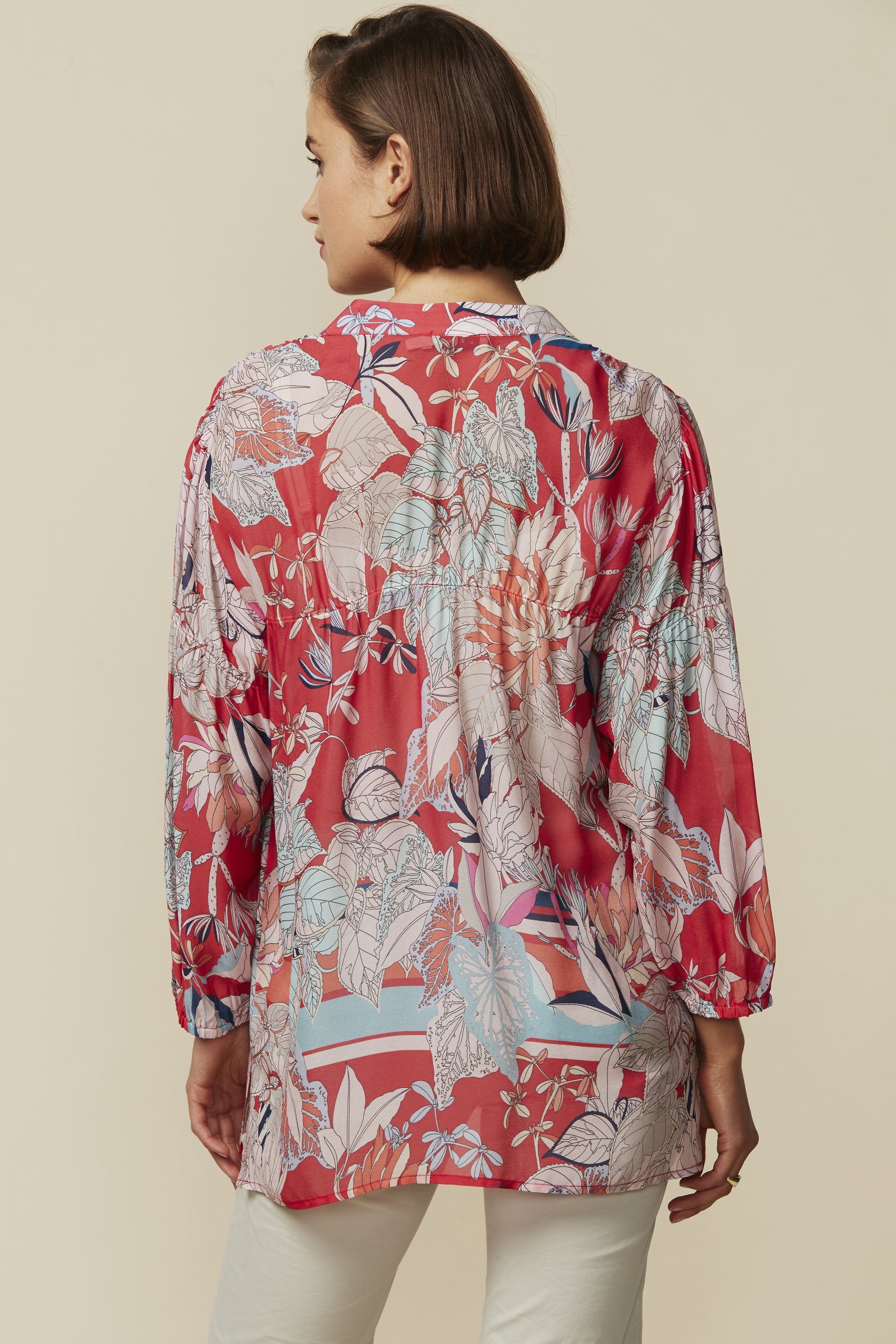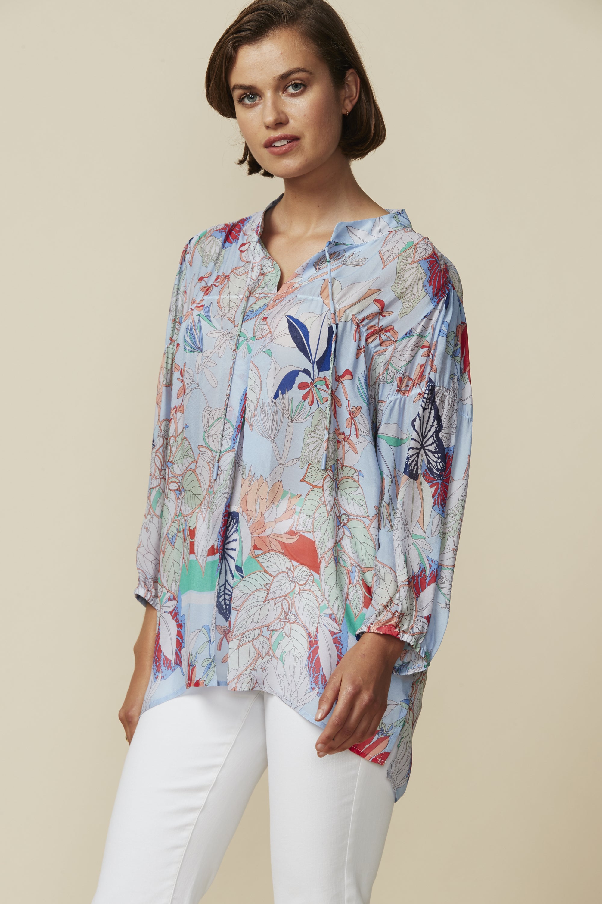 A vibrant print sheer top, bracelet length sleeve with elastic cuff and tie front neck; gathers on body & sleeves create a feminine silhouette.