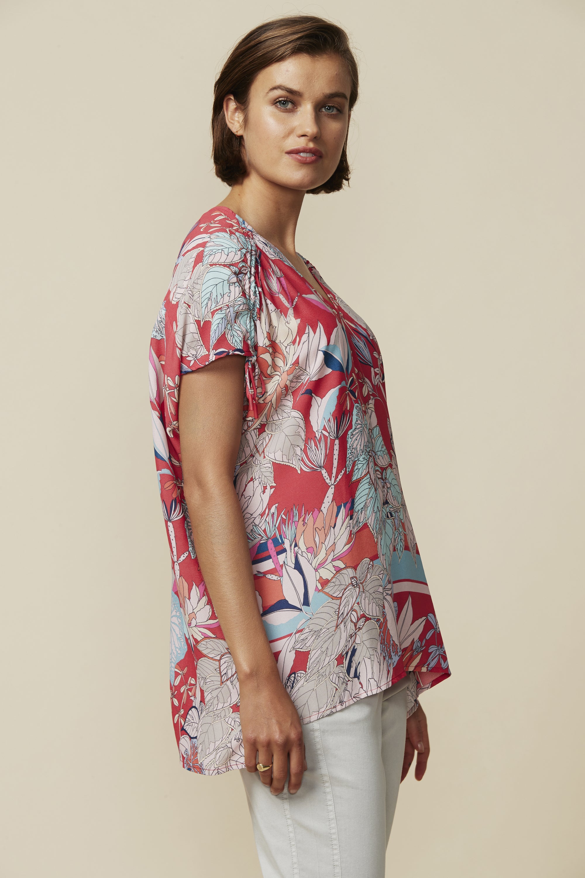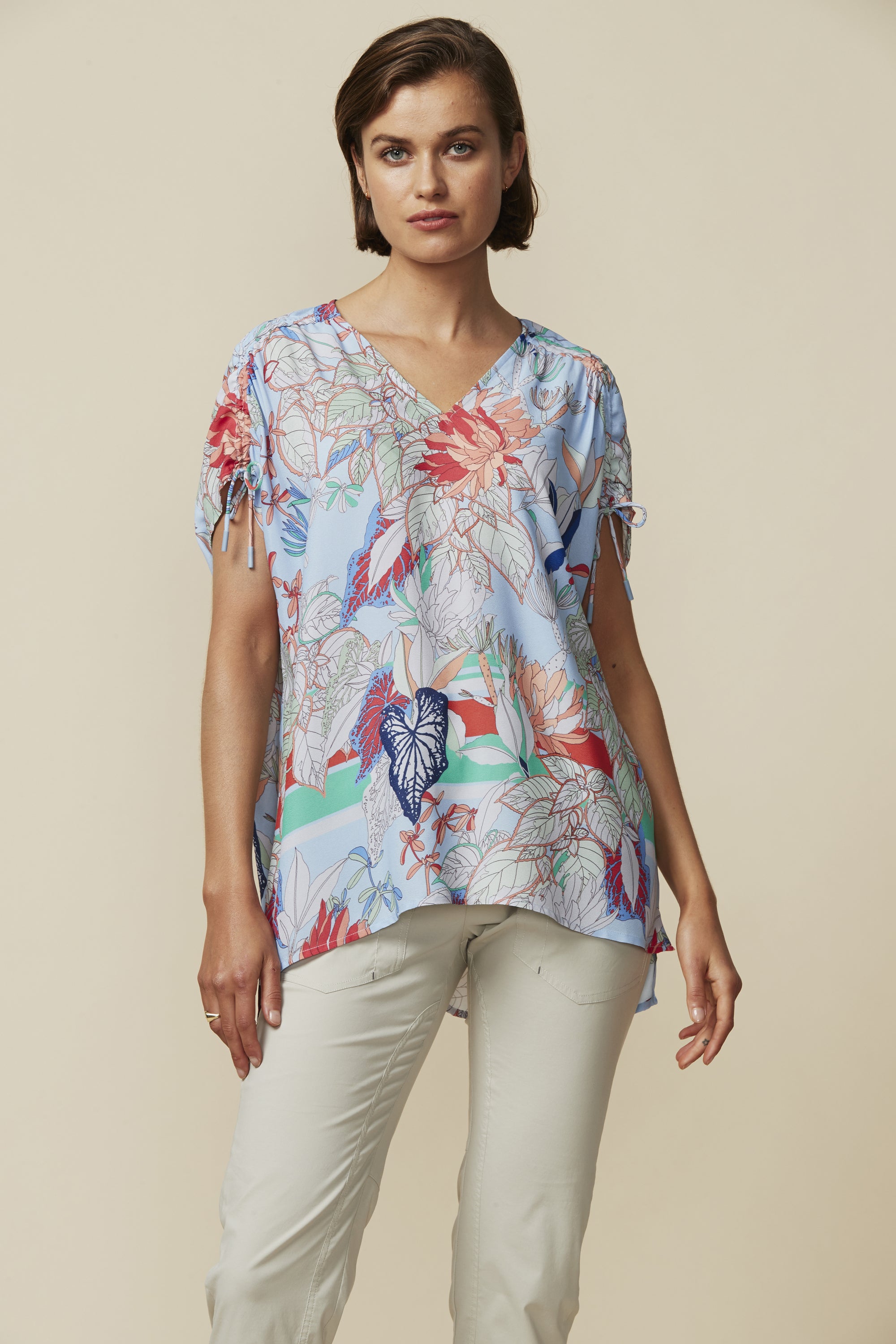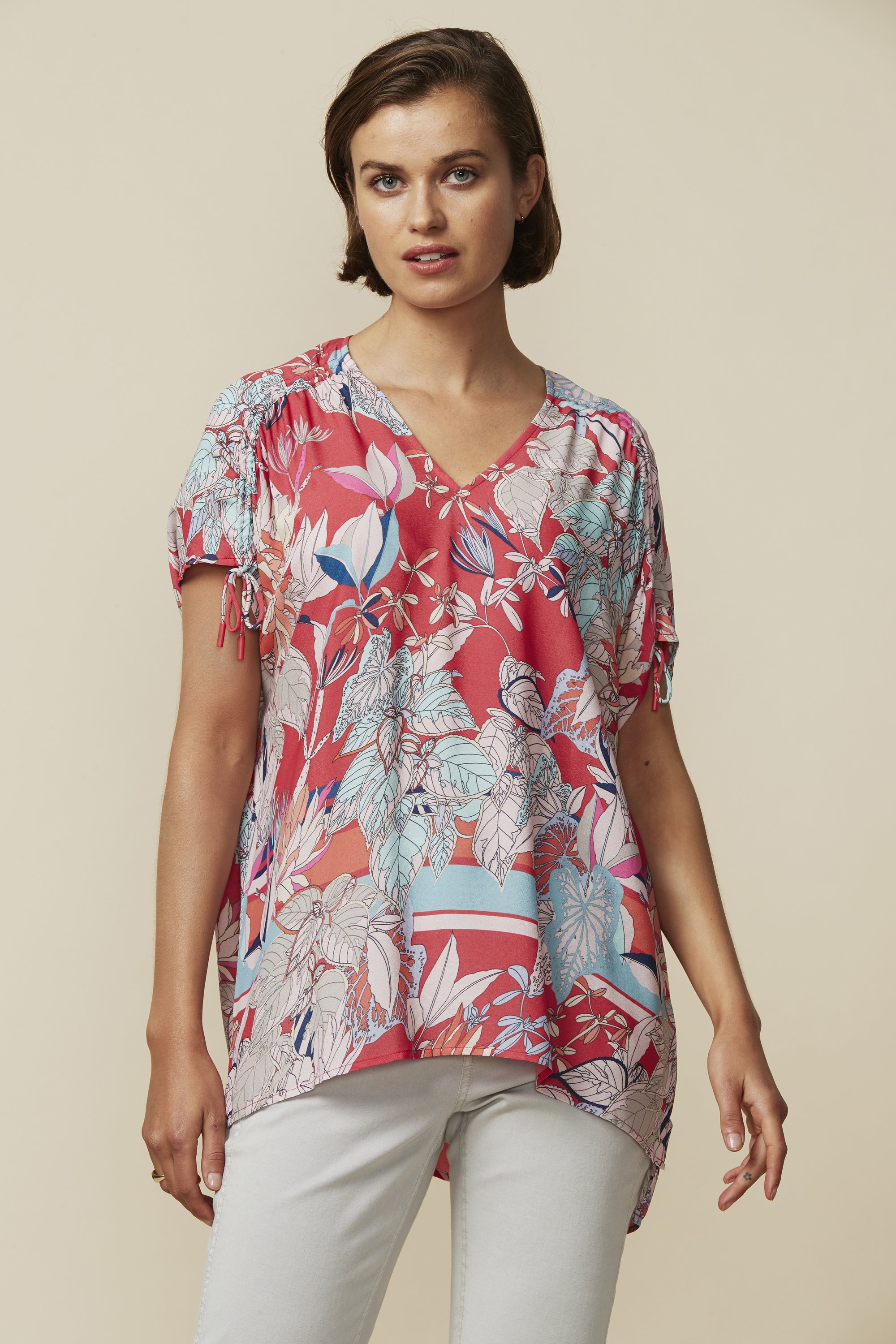 Capture the summer rhythm in our Rhythm Top, an easy fit short sleeve top with V-neck and high low hem; featuring adjustable drawstring detail at the shoulders.