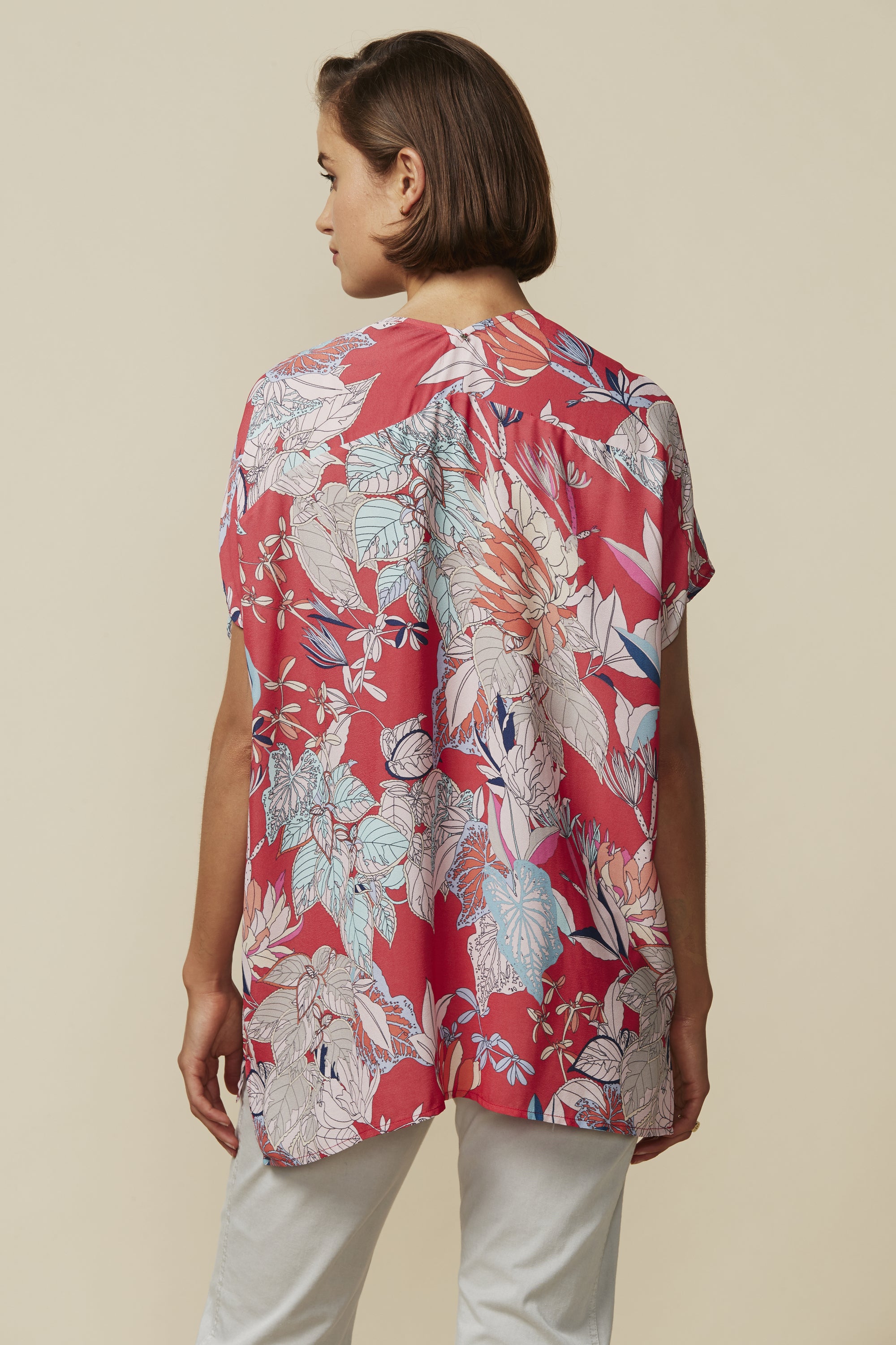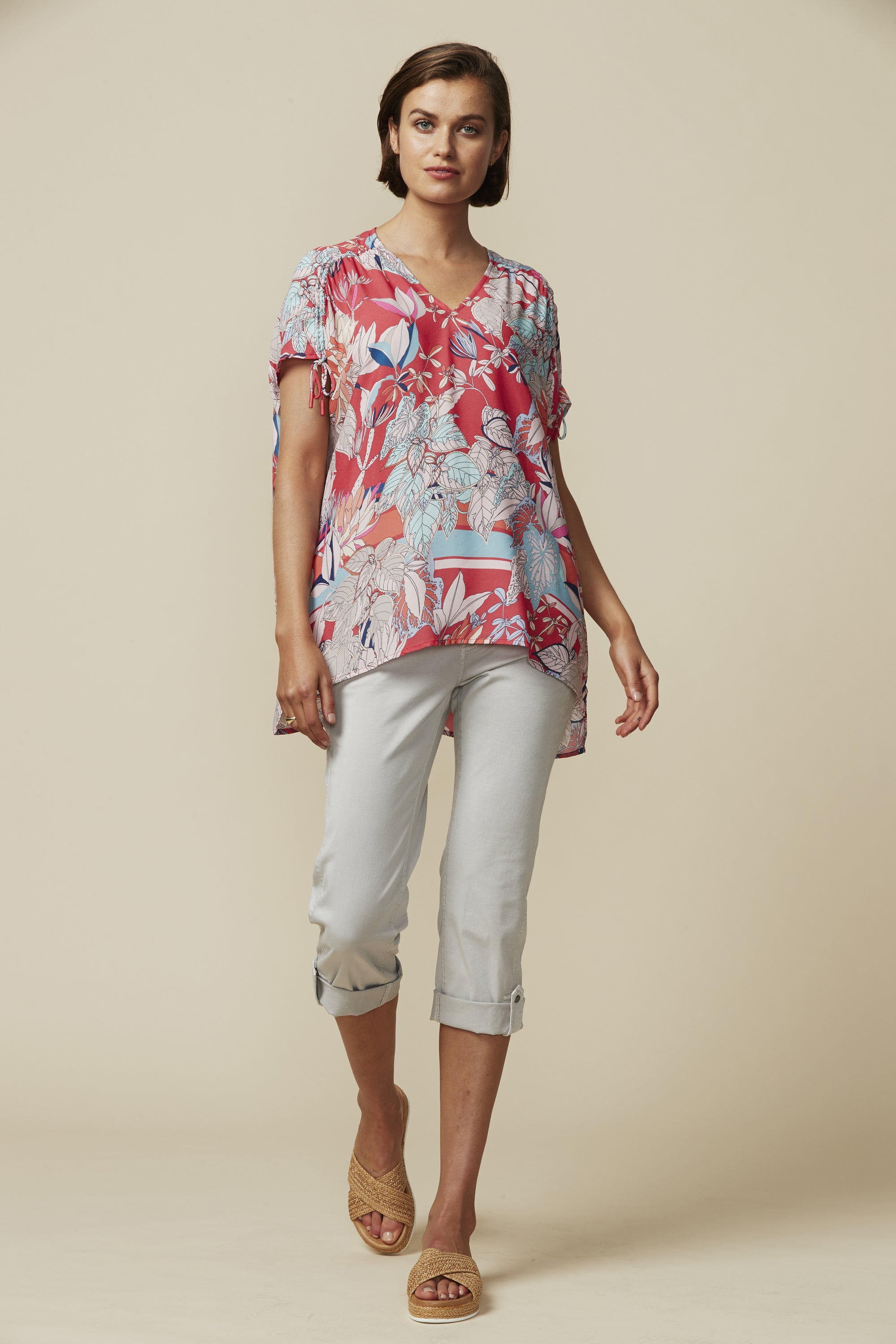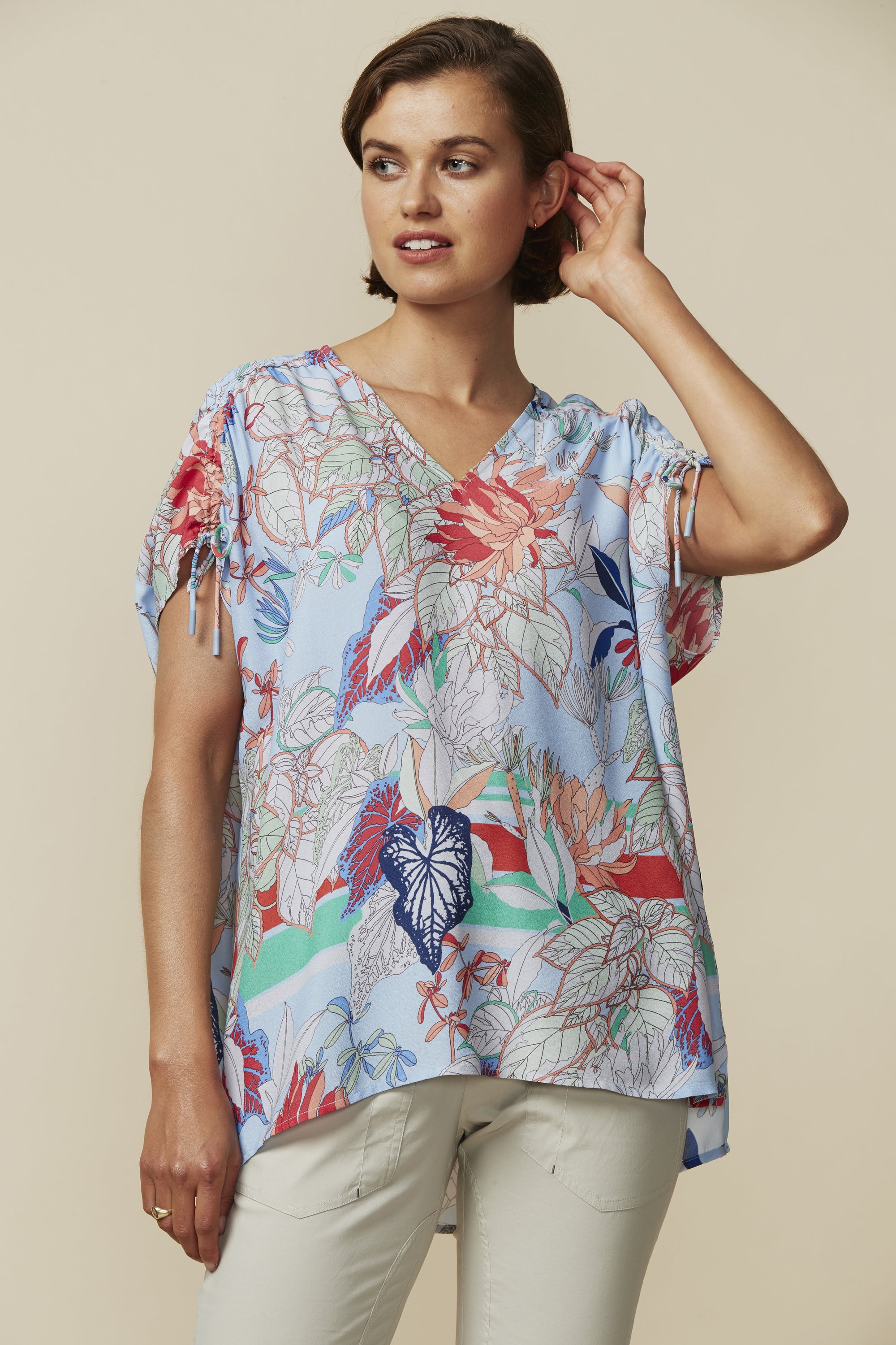 Capture the summer rhythm in our Rhythm Top, an easy fit short sleeve top with V-neck and high low hem; featuring adjustable drawstring detail at the shoulders.